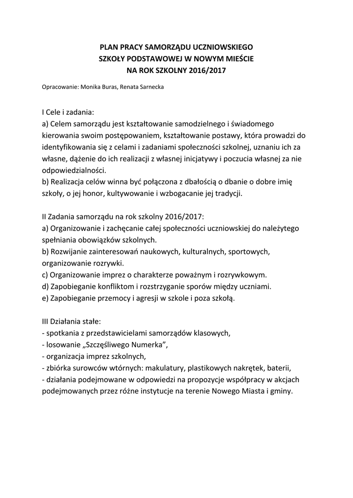 PLAN PRACY SAMORZĄDU UCZNIOWSKIEGO SZKOŁY PODSTAWOWEJ W NOWYM MIEŚCIE NA ROK SZKOLNY 2016/2017 Opracowanie: Monika Buras, Renata Sarnecka I Cele i zadania: a) Celem samorządu jest kształtowanie samodzielnego i świadomego kierowania swoim postępowaniem, kształtowanie postawy, która prowadzi do identyfikowania się z celami i zadaniami społeczności szkolnej, uznaniu ich za własne, dążenie do ich realizacji z własnej inicjatywy i poczucia własnej za nie odpowiedzialności. b) Realizacja celów winna byd połączona z dbałością o dbanie o dobre imię szkoły, o jej honor, kultywowanie i wzbogacanie jej tradycji. II Zadania samorządu na rok szkolny 2016/2017: a) Organizowanie i zachęcanie całej społeczności uczniowskiej do należytego spełniania obowiązków szkolnych. b) Rozwijanie zainteresowao naukowych, kulturalnych, sportowych, organizowanie rozrywki. c) Organizowanie imprez o charakterze poważnym i rozrywkowym. d) Zapobieganie konfliktom i rozstrzyganie sporów między uczniami. e) Zapobieganie przemocy i agresji w szkole i poza szkołą. III Działania stałe: - spotkania z przedstawicielami samorządów klasowych, - losowanie „Szczęśliwego Numerka”, - organizacja imprez szkolnych, - zbiórka surowców wtórnych: makulatury, plastikowych nakrętek, baterii, - działania podejmowane w odpowiedzi na propozycje współpracy w akcjach podejmowanych przez różne instytucje na terenie Nowego Miasta i gminy. Praca Samorządu Uczniowskiego dotyczy pewnych kręgów tematycznych rozwijanych i realizowanych w ciągu całego roku. Są to następujące zagadnienia: 1. Rozwijanie samorządności: a) Opracowywanie planu pracy SU. b) Stałe prowadzenie tablicy informacyjnej SU. c) spotkania z samorządami klasowymi, informacje o podejmowanych akcjach, zapoznanie ze Statutem Szkoły, regulaminem ucznia, wewnątrzszkolnym systemem oceniania. d) Udział w uroczystościach szkolnych – pomoc w ich organizowaniu i przeprowadzeniu. e) Pomoc w przeprowadzeniu uroczystych apeli rozpoczynających i kooczących rok szkolny oraz apeli okolicznościowych. f) Systematyczne spotkania RSU – planowanie i organizowanie pracy. g) Pełnienie dyżurów uczniowskich w szkole. h) Pomoc koleżeoska. 2. Akcje charytatywne. a) Udział w akcjach charytatywnych wynikających z potrzeb. b) Organizowanie zbiórki pieniędzy i rzeczy na potrzeby Gminnego Koła TPD 3. Udział SU w pracach porządkowych na rzecz szkoły i środowiska: a) Udział w akcjach ekologicznych: „Sprzątania świata” 4. Kultura spędzania wolnego czasu – imprezy towarzyskie, szkolne lub środowiskowe. a) Dyskoteka andrzejkowa. b) Zabawa karnawałowa. c) Pierwszy dzieo wiosny. d) Dzieo Rodziny. 5. Konkursy, wystawy, udział w pracach komisji oceniających prace zgłoszone do konkursów. a) Wspieranie organizacji konkursów przedmiotowych, b) Konkurs kaligraficzny z języka rosyjskiego WRZESIEO Organizacja Samorządu Szkolnego - ustalenie zadao do pracy w poszczególnych miesiącach r.szk.2016/17. - ogłoszenia na tablicy informacyjnej - losowanie „Szczęśliwy numerek” Sprzątanie świata - akcja „Sprzątanie świata” PAŹDZIERNIK Dzieo Edukacji Narodowej -pomoc w przygotowaniu inscenizacji we współpracy z SU PG i kabaretem -przygotowanie upominków dla wszystkich pracowników szkoły LISTOPAD Święto Niepodległości- gazetka -pamiętamy , czcimy- gazetka, zapalenie zniczy na grobach zasłużonych dla Nowego Miasta Dyskoteka Andrzejkowa - gazetka -wróżby i zabawy w klasach na zajęciach z wychowawcą GRUDZIEO Boże Narodzenie - gazetka -spotkania klasowe przy Choince -przekazanie życzeo wszystkim nauczycielom i uczniom STYCZEO Wielka Orkiestra Świątecznej Pomocy –pomoc przy organizacji sztabu, wybór wolontariuszy, -zbiórka gadżetów na licytację i loterię, - przeprowadzenie licytacji i loterii, - zbiórka pieniędzy, – liczenie pieniędzy podsumowanie akcji, LUTY -Poczta WALENTYNKOWA dla wszystkich klas MARZEC DZIEO KOBIET - Kwiatek dla każdej Pani w naszej szkole . 21 Marzec - Pierwszy Dzieo Wiosny –szkolny dzieo inaczej KWIECIEO WIELKANOC – Tradycje Świąteczne - Gazetka okolicznościowa -Życzenia świąteczne dla wszystkich pracowników szkoły oraz koleżanek i kolegów; - konkurs na papierową pisankę Rocznica śmierci Papieża Jana Pawła II 2. IV. 2011r. Uczczenie pamięci Papieża minutą ciszy; - apel pod kierunkiem nauczyciela Katechety ŚWIĘTO ZIEMI - Gazetka okolicznościowa; - Konkurs plastyczny pt. ”Nasza planeta Ziemia jest w niebezpieczeostwie”. Nagrodzenie najlepszych prac. MAJ Rocznica Konstytucji 3 Maja - Gazetka okolicznościowa; - Promocja ekologicznej żywności Ekologiczny plakat – Konkurs; Dzieo Matki - gazetka okolicznościowa; CZERWIEC -Dzieo rodziny. -pomoc przy organizacji Podsumowanie pracy w II półroczu - Gazetka okolicznościowa; - Życzenia dla Uczniów szkoły - Przyznanie nagród za pracę w Samorządzie Uczniowskim; - Spotkanie Opiekuna SU z Zarządem i Radą Uczniowską .