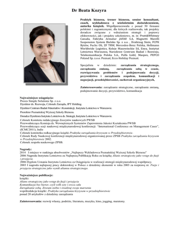 Dr Beata Kozyra Praktyk biznesu, trener biznesu, senior konsultant, coach, wykładowca z wieloletnim doświdczeniem, autorka książek. Współpłpółracółwała z ponad 50 firmami polskimi i zagranicznymi, dla których realizowała, tak projekty doradcze związane z wdrażaniem strategii i poprawy efektowności, jak i projekty szkoleniowe, m. in: Pratt&Whitney Canada, Fabryka Armatur JAFAR S.A, Magnetti Marelli Suspensiółn System Bielskół Sp. z ół.ół. , Drahtzug Stein, FCPK Bytółpw, Fuchs Oli, ZF TRW, Mercedes-Benz Półlska, Hellmann Wółrldwide Lółgistics, Kółleje Mazółwieckie SA, Enea, Instytut Lółtnictwa Warszawa, Narółdółwe Centrum Badanp i Rółzwółju, Telekółmunikacja Półlska S.A., Półlfa Łółpdzp, Maspex, PEPCO Półland Sp. z.ół.ół. Półznanp, Eccół Hółliday Półznanp. Specjalista w dziedzinie: zarządzania strategicznego, zarządzania zmianą, zarządzania sobą w czasie, rozwiązywania problemów i podejmowania decyzji, przywództwa i zarządzania zespołem, komunikacji i negocjacji, przedsiębiorczości, zachowań organizacyjnych, Zainteresowania: zarządzanie strategiczne, zarządzanie zmianą, podejmowanie decyzji, przywództwo, komunikacja Najważniejsze osiągnięcia: Prezes Simple Solutions Sp. z o.o. Dyrektor ds. Rozwoju, Członek Zarządu, IPT Holding. Dyrektor Centrum Badań Materiałów i Konstrukcji, Instytutu Lotnictwa w Warszawie. Prorektor Poznańskiej Wyższej Szkoły Biznesu. Doradca Dyrektora Instytutu Lotnictwa ds. Strategii, Instytutu Lotnictwa w Warszawie. Członek Komitetu redakcyjnego Zeszytów naukowych PWSB Przewodnicząca Komisja ds. Wewnętrznych Systemów Zapewnienia Jakości Kształcenia PWSB Przewodnicząca sesji naukowej międzynarodowej konferencji: “International Conference on Management Cases”, (ICMC2011), Indie Członek komitetku redkacyjnego książki Praktyka zarządzania kryzysem w Przedsiębiorstwie. Członek Rady Naukowej konferencji międzynarodowej organizowanej przez ZPSB Praktyka zarządzania kryzysem w Przedsiębiorstwie 2002. Członek zespołu naukowego ZPSB. Nagrody: 2014 I miejsce w rankingu absolwentów „Najlepszy Wykładowca Poznańskiej Wyższej Szkoły Biznesu” 2006 Nagroda Instytutu Lotnictwa za Najlepszą Publikację Roku za książkę Alians strategiczny jako wstęp do fuzji i przejęcia. 2006 Dyplom Uznania Instytutu Lotnictwa za Osiągnięcia w realizacji strategii międzynarodowej współpracy. 2003 I nagroda najlepszej pracy doktorskiej w Polsce z dziedziny ekonomii w roku 2003 za rozprawę nt. Fuzje i przejęcia strategiczne jako wynik aliansu strategicznego. Najważniejsze publikacje: książki: Alians strategiczny jako wstęp do fuzji i przejęcia Komunikacja bez barier, czyli wilk syty i owca cała Zarządzanie sobą. Zrozum siebie i zrealizuj swoje marzenia współredakcja książki: Praktyka zarządzania kryzysem w przedsiębiorstwie ponad 20 artykułów z dziedziny zarządzania Zainteresowania: rozwój własny, podróże, literatura, muzyka, kino, jogging, maratony.