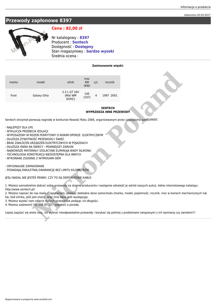Informacje o produkcie Utworzono 02-03-2017 Przewody zapłonowe 8397 Cena : 82,00 zł Nr katalogowy : 8397 Producent : Sentech Dostępność : Dostępny Stan magazynowy : bardzo wysoki Średnia ocena : marka model silnik moc KM (KW) cyl. rocznik Ford Galaxy Ghia 2.3 L GT 16V (Mot WM DOHC) 145 (107) 4 1997 2001 la SENTECH WYPRZEDZA INNE PRZEWODY nd Zastosowanie wiązki: Po Sentech otrzymał pierwszą nagrodę w konkursie Nowość Roku 2006, organizowanym przez czasopismo autoEXPERT. ic ro n - NAJLEPSZY DLA LPG - WYKLUCZA PRZEBICIA IZOLACJI - WYPOSAŻONY W RDZEŃ FERRYTOWY O NISKIM OPORZE ELEKTRYCZNYM - DŁUŻSZA ŻYWOTNOŚĆ PRZEWODU I ŚWIEC - BRAK ZAKŁÓCEŃ URZĄDZEŃ ELEKTRYCZNYCH W POJAZDACH - DŁUŻSZA ISKRA NA ŚWIECY - PEWNIEJSZY ZAPŁON - NAJNOWSZE MATERIAŁY IZOLACYJNE ELIMINUJĄ WADY SILIKONU - TECHNOLOGIA KONSTRUKCJI NIEDOSTĘPNA DLA INNYCH - WYKONANE ZGODNIE Z WYMOGAMI OEM - ORYGINALNIE ZAPAKOWANE - POSIADAJĄ DWULETNIĄ GWARANCJĘ BEZ LIMITU KILOMETRÓW JEŚLI NADAL NIE JESTEŚ PEWNY, CZY TO SĄ ODPOWIEDNIE KABLE: M 1. Możesz samodzielnie dobrać sobie przewody na stronie producenta i następnie odnaleźć je wśród naszych aukcji. Adres internetowego katalogu: http://www.sentech.pl/ 2. Możesz napisać do nas maila z zapytaniem, podając dokładne dane samochodu (marka, model, pojemność, rocznik, moc w koniach mechanicznych lub kw, kod silnika, jeśli jest znany oraz inne dane jeśli występują). 3. Możesz wysłać nam zdjęcie starych przewodów podając ich długości. 4. Możesz zadzwonić (42 298 83 32) i poprosić o poradę. Lepiej zapytać się wiele razy, niż wybrać nieodpowiednie przewody i borykać się później z problemami związanymi z ich wymianą czy zwrotem!!! Wygenerowano w programie www.oscGold.com