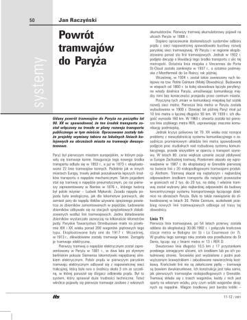 systemy 50 Jan Raczyñski Powrót tramwajów do Pary¿a Udany powrót tramwajów do Pary¿a na pocz¹tku lat 90. XX w. spowodowa³, ¿e ten œrodek transportu zosta³ w³¹czony na trwa³e w plany rozwoju transportu publicznego w tym mieœcie. Opracowane zosta³y tak¿e projekty wymiany taboru na lokalnych liniach kolejowych na obrze¿ach miasta na tramwaje dwusystemowe. Pary¿ by³ pierwszym miastem europejskim, w którym pojawi³y siê tramwaje konne. Inauguracja tego nowego œrodka transportu odby³a siê w 1853 r., a ju¿ w 1873 r. eksploatowano 22 linie tramwajów konnych. Podobnie jak w innych miastach Europy, trwa³y jednak poszukiwania lepszych œrodków transportu o napêdzie mechanicznym. Takim pojazdem sta³ siê tramwaj o napêdzie pneumatycznym, po raz pierwszy zaprezentowany w Nantes w 1876 r., którego twórc¹ by³ polski in¿ynier – Ludwik Mêkarski. Zasada napêdu pojazdu by³a analogiczna, jak dla lokomotyw parowych, ale zamiast pary do napêdu t³oków u¿ywano sprê¿onego powietrza ze zbiorników zamontowanych w pojeŸdzie. £adowanie zbiorników odbywa³o siê na stacjach sprê¿arkowych zlokalizowanych wzd³u¿ linii tramwajowych. Jedno do³adowanie zbiorników wystarcza³o zazwyczaj na kilkanaœcie kilometrów jazdy. Paryskie Towarzystwo Omnibusowe mia³o na prze³omie XIX i XX wieku ponad 200 wagonów piêtrowych tego typu. Eksploatowane by³y one do 1917 r. Wczeœniej, w 1913 r., zlikwidowane zosta³y tramwaje konne. Zast¹pi³y je tramwaje elektryczne. Pierwszy tramwaj o napêdzie elektrycznym zosta³ zaprezentowany w Pary¿u w 1881 r., w dwa lata po s³ynnym berliñskim pokazie Siemensa lokomotywki napêdzanej silnikiem elektrycznym. Pobór pr¹du w pierwszym paryskim tramwaju elektrycznym odbywa³ siê z napowietrznej sieci trakcyjnej, któr¹ by³a rura o œrednicy oko³o 3 cm ze szczelin¹, w której porusza³ siê œlizgacz odbieraka pr¹du. By³ to system, który sprawia³ du¿e trudnoœci techniczne. Tote¿ wkrótce pojawi³y siê pierwsze tramwaje zasilane z w³asnych akumulatorów. Pierwszy tramwaj akumulatorowy pojawi³ na ulicach Pary¿a w 1888 r. Dopiero opracowanie doskonalszych systemów odbioru pr¹du z sieci napowietrznej spowodowa³o burzliwy rozwój paryskiej sieci tramwajowej. W Pary¿u i w regionie eksploatowano ponad sto linii tramwajowych. Jednak w 1932 r. podjêto decyzjê o likwidacji tego œrodka transportu z ulic tej metropolii. Ostatnia linia miejska z Vincennes do Porte St-Cloud zosta³a zamkniêta w 1937 r., a ostatnia podmiejska z Montfermeil do Le Raincy rok póŸniej. Wczeœniej, w 1934 r. zosta³ tak¿e zawieszony ruch kolejowy na tzw. Petite Ceinture (Ma³ej Obwodnicy). Budowana w etapach od 1860 r. ta kolej obwodowa ³¹czy³a peryferyjne wtedy dzielnice Pary¿a, umo¿liwiaj¹c komunikacjê miêdzy nimi bez koniecznoœci przejazdu przez centrum miasta. Przyczyn¹ tych zmian w komunikacji miejskiej by³ szybki rozwój sieci metra. Pierwsza linia metra w Pary¿u zosta³a wybudowana w 1900 r. Dziesiêæ lat póŸniej Pary¿ mia³ ju¿ 10 linii metra o ³¹cznej d³ugoœci 93 km. W 1939 r. ich d³ugoœæ wynosi³a 160 km. W 1960 r. otwarta zosta³a te¿ pierwsza linia szybkiego metra RER, usprawniaj¹c znacznie komunikacjê podmiejsk¹. Jednak kryzys paliwowy lat 70. XX wieku oraz rosn¹ce problemy z niewydolnoœci¹ systemu komunikacyjnego o zasadniczo promieniowym uk³adzie linii metra spowodowa³y podjêcie prac studialnych nad rozbudow¹ systemu komunikacyjnego, przede wszystkim w oparciu o transport szynowy. W latach 80. coraz wiêksze uznanie zacz¹³ zdobywaæ w Europie Zachodniej tramwaj. Prze³omem okaza³o siê wprowadzenie w 1987 r. do eksploatacji w Grenoble pierwszej na œwiecie linii z 20 niskopod³ogowymi tramwajami produkcji Alsthom. Tramwaj okaza³ siê najtañszym i najbardziej odpowiednim œrodkiem transportu dla natê¿eñ przewozów w granicach od 2 tys. do 20 tys. na dobê. I w³aœnie tramwaj zosta³ wybrany jako najbardziej odpowiedni do budowy koncentrycznego systemu transportowego ³¹cz¹cego dzielnice na obrze¿ach Pary¿a. By³o to tak¿e nawi¹zanie do zlikwidowanej w latach 30. Petite Ceinture, aczkolwiek przebieg nowych linii tramwajowych odbiega od trasy tej obwodnicy. Linia T1 Pierwsza linia tramwajowa, po 54 latach przerwy, zosta³a oddana do eksploatacji 30.06.1992 r. i po³¹czy³a krañcowe stacje metra w Bobigny (nr 5) i La Courneuve (nr 7). W grudniu tego samego roku zosta³a ona przed³u¿ona do St Denis, ³¹cz¹c siê z liniami metra nr 13 i RER D. Dwutorowa linia d³ugoœci 10,5 km z 17 przystankami przebiega istniej¹cymi ulicami, ich œrodkiem lub po ich po³udniowej stronie. Torowisko jest wydzielone z jezdni podwy¿szonym krawê¿nikiem i zabudowane nawierzchni¹ kostkow¹. Krañcówki linii nie s¹ zakoñczone pêtl¹ – tramwaje s¹ bowiem dwukierunkowe. Ich konstrukcja jest taka sama, jak pierwszych tramwajów niskopod³ogowych z Grenoble. Tramwaj sk³ada siê z trzech wagonów, ka¿dy z nich jest oparty na w³asnym wózku, przy czym wózki wagonów skrajnych s¹ napêdne. Wagon œrodkowy jest bardzo krótki – 11-12 / 2001 51 Linia T1 i jej planowane przed³u¿enia Šród³o: La vie du Rail 3,3 m i oparty na wózku tocznym. Nad wózkami napêdnymi pod³oga jest podniesiona do wysokoœci 87 cm na g³ówk¹ szyny i do tej czêœci wagonów prowadz¹ 3 stopnie. D³ugoœæ ca³ego tramwaju wynosi 29,4 m. Moc ci¹g³a silników trakcyjnych pr¹du sta³ego sterowanych choperami wynosi 550 kW. Prêdkoœæ maksymalna tramwaju wynosi 70 km/h. Do obs³ugi tramwajów zosta³a wybudowana zajezdnia w Bobigny. Udany powrót tramwaju do pó³nocnych dzielnic Pary¿a sk³oni³ w³adze miasta i operatora komunikacji miejskiej w Pary¿u RATP do przyjêcia planu przed³u¿enia linii T1 z BobignyPablo Picasso do Noisy-le-Sec. Nowy odcinek bêdzie liczy³ 3 km i zlokalizowane na nim zostan¹ 4 przystanki. Koñcowy przystanek linii w Noisy-le-Sec bêdzie znajdowa³ siê przy stacji szybkiego metr