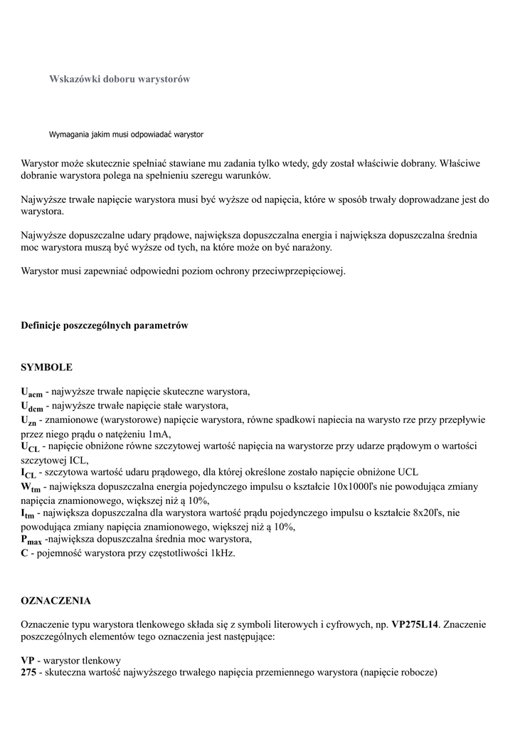 Wskazówki doboru warystorów Wymagania jakim musi odpowiadać warystor Warystor może skutecznie spełniać stawiane mu zadania tylko wtedy, gdy został właściwie dobrany. Właściwe dobranie warystora polega na spełnieniu szeregu warunków. Najwyższe trwałe napięcie warystora musi być wyższe od napięcia, które w sposób trwały doprowadzane jest do warystora. Najwyższe dopuszczalne udary prądowe, największa dopuszczalna energia i największa dopuszczalna średnia moc warystora muszą być wyższe od tych, na które może on być narażony. Warystor musi zapewniać odpowiedni poziom ochrony przeciwprzepięciowej. Definicje poszczególnych parametrów SYMBOLE Uacm - najwyższe trwałe napięcie skuteczne warystora, Udcm - najwyższe trwałe napięcie stałe warystora, Uzn - znamionowe (warystorowe) napięcie warystora, równe spadkowi napiecia na warysto rze przy przepływie przez niego prądu o natężeniu 1mA, UCL - napięcie obniżone równe szczytowej wartość napięcia na warystorze przy udarze prądowym o wartości szczytowej ICL, ICL - szczytowa wartość udaru prądowego, dla której określone zostało napięcie obniżone UCL Wtm - największa dopuszczalna energia pojedynczego impulsu o kształcie 10x1000ľs nie powodująca zmiany napięcia znamionowego, większej niż ą 10%, Itm - największa dopuszczalna dla warystora wartość prądu pojedynczego impulsu o kształcie 8x20ľs, nie powodująca zmiany napięcia znamionowego, większej niż ą 10%, Pmax -największa dopuszczalna średnia moc warystora, C - pojemność warystora przy częstotliwości 1kHz. OZNACZENIA Oznaczenie typu warystora tlenkowego składa się z symboli literowych i cyfrowych, np. VP275L14. Znaczenie poszczególnych elementów tego oznaczenia jest następujące: VP - warystor tlenkowy 275 - skuteczna wartość najwyższego trwałego napięcia przemiennego warystora (napięcie robocze) L - symbol serii 14 - średnica warystora. Wymiar ten dotyczy samego spieku ceramicznego i nie uwzględnia grubości osłony epoksydowej lub powłoki lakieru izolacyjnego. Warystory tlenkowe wielokrotne oznaczane są w taki sam sposób jak wartstory pojedyncze, jedynie na końcu oznaczenia dodawany jest symbol x2 w odniesieniu do warystorów wielokrotnych składających się z dwóch elementów, oraz x3 w odniesieniu do warystorów, składających się z trzech elementów, np. VP1875PA25x3. Trójfazowe ograniczniki warystorowe oznaczone są tak jak warystory pojedyncze lub wielokrotne, lecz symbol serii zastąpiony jest w tym wypadku symbolem D , np. VP1875D25x3. Przykłady zastosowań Dobór najwyższego dopuszczalnego trwale napięcia warystora Podczas określania najwyższego trwale dopuszczalnego napięcia warystora należy uwzględniać możliwość wzrostu napięcia w chronionym obwodzie powyżej napięcia znamionowego tego obwodu. W obwodach zasilanych z sieci energetycznej należy się liczyć ze wzrostem napięcia o 10% powyżej wartości znamionowej. W związku z tym należy dobrać warystor, którego najwyższe trwałe napięcie skuteczne Vrsm lub najwyższe trwałe napięcie stałe Vdc są wyższe, lecz najbliższe tej wartości, która może wystąpić trwale w obwodzie, w którym ma być umieszczony warystor. Należy się liczyć z tym, że dobranie warystora o zbyt dużej wartości trwale dopuszczalnego napięcia spowoduje podwyższenie poziomu ochrony. Z drugiej strony dobranie warystora o zbyt małej wartości najwyższego trwale dopuszczalnego napięcia może doprowadzić, przy długotrwałym wzroście napięcia, do uszkodzenia lub przedwczesnego zużycia warystora. Należy uwzględnić fakt, że nieliniowość charakterystyki warystora powoduje przy 10% wzroście napięcia 15-to krotny przyrost mocy wydzielonej w warystorze. Udary prądowe Dobranie warystora ze względu na udary prądowe wymaga zbadania, na jakie udary prądowe może on być narażony. Należy określić źródła przepięć, które mogą wystąpić w chronionym obwodzie, a następnie obliczyć, jakie udary prądowe mogą spowodować te przepięcia w warystorze. Przy dobieraniu warystora musi być brana pod uwagę nie tylko wartość udarów prądowych i czas ich trwania, ale również przewidywana ilość tych udarów. Charakterystyki określające dopuszczalną wartość i liczbę udarów prądowych podawane są dla udarów prostokątnych. Dlatego rzeczywiste udary prądowe należy zastąpić ekwiwalentnymi udarami prostokątnymi. Czas trwania ekwiwalentnego impulsu prostokątnego można obliczyć, korzystając z wzoru (6). Rzeczywisty kształt udaru prądowego najprościej określić drogą pomiarową. Jest to jednak możliwe jedynie w istniejącym układzie. Przebieg udaru prądowego można wtedy zoscylografować i przyporządkować mu ekwiwalentny udar prostokątny, np. metodą graficzną. Gdy przepięcie spowodowane jest czynnościami łączeniowymi w obwodzie z indukcyjnością, wówczas wiadomo, że udar prądowy nie może przekraczać wartości prądu płynącego w obwodzie przed wystąpieniem stanu nieustalonego. Najwyższe napięcie, jakie może w takim przypadku wystąpić na warystorze, może być określone z charakterystyki prądowo-napięciowej warystora dla prądu, który płynął w obwodzie przed wystąpieniem czynności łączeniowych. Dokładne obliczenie przebiegów prądowych może nastręczać pewne trudności. Przebiegi łączeniowe mają zazwyczaj charakter oscylacyjny, przy czym charakter tych oscylacji zależy zarówno od parametrów obwodu, jak i od rodzaju użytego łącznika. Szczególnie niebezpieczne przepięcia występują w obwodach, w których zastosowane zostały elementy łączeniowe dokonujące bardzo szybkiego przerwania obwodu, np. tak zwanego ucięcia prądu. Ucięciem prądu nazywane jest zgaśnięcie łuku na przerwie międzystykowej łącznika przed przejściem naturalnej wartości prądu przez zero. Amplituda przepięć występujących podczas przerwania obwodu z indukcyjnością ok