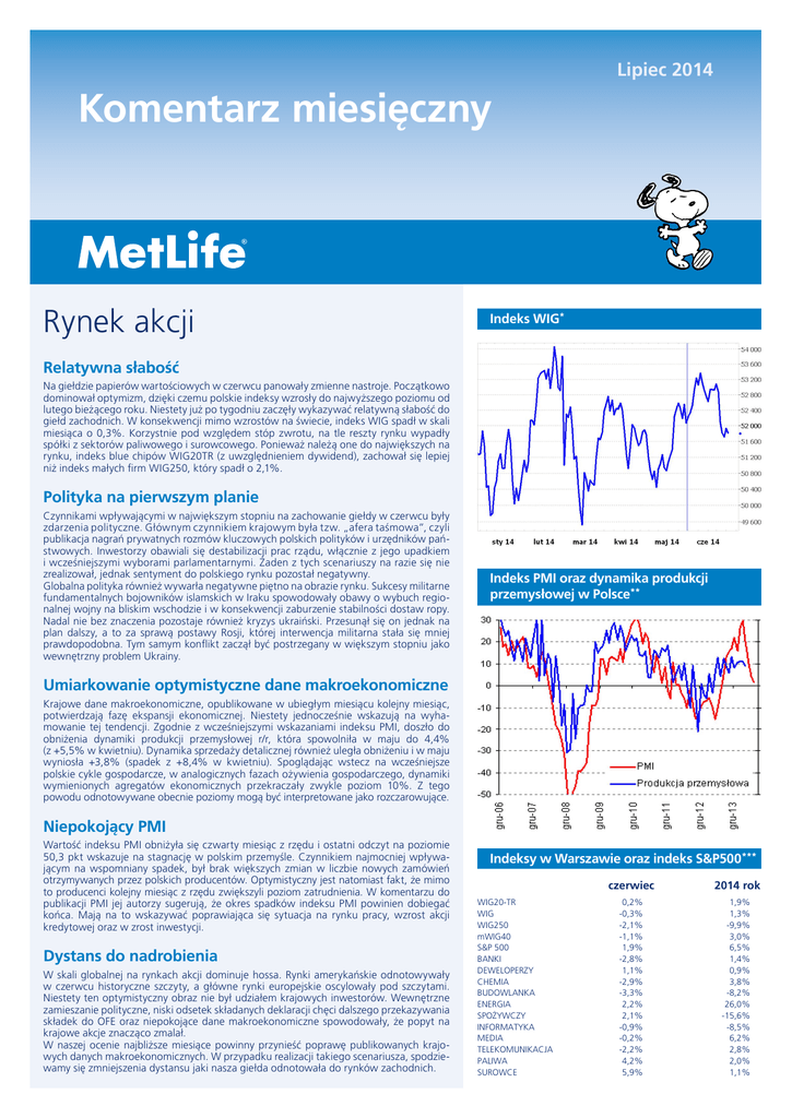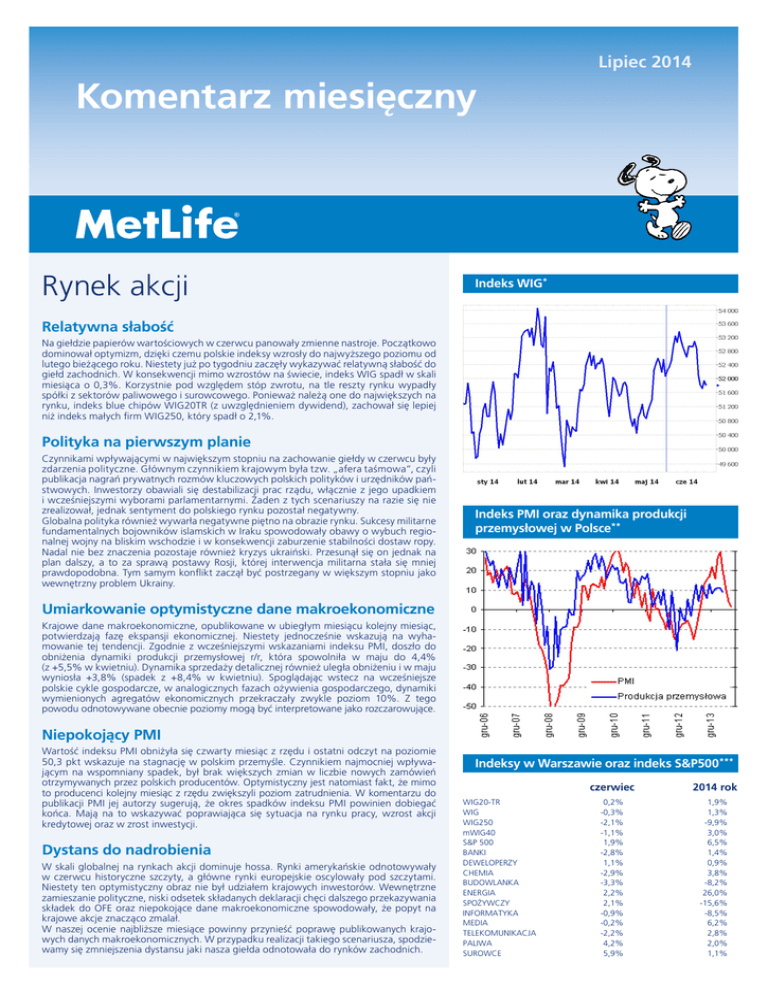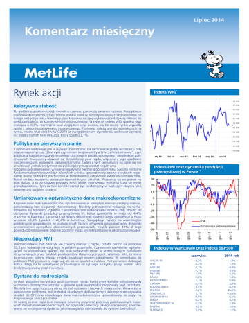 Lipiec 2014 Komentarz miesięczny Rynek akcji Indeks WIG* Relatywna słabość Na giełdzie papierów wartościowych w czerwcu panowały zmienne nastroje. Początkowo dominował optymizm, dzięki czemu polskie indeksy wzrosły do najwyższego poziomu od lutego bieżącego roku. Niestety już po tygodniu zaczęły wykazywać relatywną słabość do giełd zachodnich. W konsekwencji mimo wzrostów na świecie, indeks WIG spadł w skali miesiąca o 0,3%. Korzystnie pod względem stóp zwrotu, na tle reszty rynku wypadły spółki z sektorów paliwowego i surowcowego. Ponieważ należą one do największych na rynku, indeks blue chipów WIG20TR (z uwzględnieniem dywidend), zachował się lepiej niż indeks małych firm WIG250, który spadł o 2,1%. Polityka na pierwszym planie Czynnikami wpływającymi w największym stopniu na zachowanie giełdy w czerwcu były zdarzenia polityczne. Głównym czynnikiem krajowym była tzw. „afera taśmowa”, czyli publikacja nagrań prywatnych rozmów kluczowych polskich polityków i urzędników państwowych. Inwestorzy obawiali się destabilizacji prac rządu, włącznie z jego upadkiem i wcześniejszymi wyborami parlamentarnymi. Żaden z tych scenariuszy na razie się nie zrealizował, jednak sentyment do polskiego rynku pozostał negatywny. Globalna polityka również wywarła negatywne piętno na obrazie rynku. Sukcesy militarne fundamentalnych bojowników islamskich w Iraku spowodowały obawy o wybuch regionalnej wojny na bliskim wschodzie i w konsekwencji zaburzenie stabilności dostaw ropy. Nadal nie bez znaczenia pozostaje również kryzys ukraiński. Przesunął się on jednak na plan dalszy, a to za sprawą postawy Rosji, której interwencja militarna stała się mniej prawdopodobna. Tym samym konflikt zaczął być postrzegany w większym stopniu jako wewnętrzny problem Ukrainy. Indeks PMI oraz dynamika produkcji przemysłowej w Polsce** Umiarkowanie optymistyczne dane makroekonomiczne Krajowe dane makroekonomiczne, opublikowane w ubiegłym miesiącu kolejny miesiąc, potwierdzają fazę ekspansji ekonomicznej. Niestety jednocześnie wskazują na wyhamowanie tej tendencji. Zgodnie z wcześniejszymi wskazaniami indeksu PMI, doszło do obniżenia dynamiki produkcji przemysłowej r/r, która spowolniła w maju do 4,4% (z +5,5% w kwietniu). Dynamika sprzedaży detalicznej również uległa obniżeniu i w maju wyniosła +3,8% (spadek z +8,4% w kwietniu). Spoglądając wstecz na wcześniejsze polskie cykle gospodarcze, w analogicznych fazach ożywienia gospodarczego, dynamiki wymienionych agregatów ekonomicznych przekraczały zwykle poziom 10%. Z tego powodu odnotowywane obecnie poziomy mogą być interpretowane jako rozczarowujące. Niepokojący PMI Wartość indeksu PMI obniżyła się czwarty miesiąc z rzędu i ostatni odczyt na poziomie 50,3 pkt wskazuje na stagnację w polskim przemyśle. Czynnikiem najmocniej wpływającym na wspomniany spadek, był brak większych zmian w liczbie nowych zamówień otrzymywanych przez polskich producentów. Optymistyczny jest natomiast fakt, że mimo to producenci kolejny miesiąc z rzędu zwiększyli poziom zatrudnienia. W komentarzu do publikacji PMI jej autorzy sugerują, że okres spadków indeksu PMI powinien dobiegać końca. Mają na to wskazywać poprawiająca się sytuacja na rynku pracy, wzrost akcji kredytowej oraz w zrost inwestycji. Dystans do nadrobienia W skali globalnej na rynkach akcji dominuje hossa. Rynki amerykańskie odnotowywały w czerwcu historyczne szczyty, a główne rynki europejskie oscylowały pod szczytami. Niestety ten optymistyczny obraz nie był udziałem krajowych inwestorów. Wewnętrzne zamieszanie polityczne, niski odsetek składanych deklaracji chęci dalszego przekazywania składek do OFE oraz niepokojące dane makroekonomiczne spowodowały, że popyt na krajowe akcje znacząco zmalał. W naszej ocenie najbliższe miesiące powinny przynieść poprawę publikowanych krajowych danych makroekonomicznych. W przypadku realizacji takiego scenariusza, spodziewamy się zmniejszenia dystansu jaki nasza giełda odnotowała do rynków zachodnich. Indeksy w Warszawie oraz indeks S&P500*** WIG20-TR WIG WIG250 mWIG40 S&P 500 BANKI DEWELOPERZY CHEMIA BUDOWLANKA ENERGIA SPO¯YWCZY INFORMATYKA MEDIA TELEKOMUNIKACJA PALIWA SUROWCE czerwiec 2014 rok 0,2% -0,3% -2,1% -1,1% 1,9% -2,8% 1,1% -2,9% -3,3% 2,2% 2,1% -0,9% -0,2% -2,2% 4,2% 5,9% 1,9% 1,3% -9,9% 3,0% 6,5% 1,4% 0,9% 3,8% -8,2% 26,0% -15,6% -8,5% 6,2% 2,8% 2,0% 1,1% Lipiec 2014 Komentarz miesięczny Rynek długu City Index Obligacji Rządowych* Spadek rentowności w czerwcu Indeks obligacji Citigroup Poland GBI zyskał w czerwcu 1,33%. Największy wzrost 3,62% zanotował sektor 10+, czyli obligacje o terminach zapadalności powyżej 10 lat. Najsłabiej wypadł natomiast sektor 1-3, czyli obligacje o terminach zapadalności od 1 do 3 lat, zyskując 0,73%. W czerwcu rentowność polskich obligacji 10-letnich spadła z 3,70% do 3,45%. Na rynkach bazowych (USA, Niemcy) panowały podobne nastroje i w obu tych krajach rentowności również spadły. Różnica rentowności polskich 10-letnich obligacji skarbowych do obligacji niemieckich wynosi obecnie 217 punktów bazowych, czyli 2,17% i zmniejszyła się w tym roku o 23 punkty bazowe, czyli o 0,23%. Nadal uważamy, że utrzymujący się niski poziom inflacji (obecnie poniżej 1%) powinien być zaporą przed znaczącym wzrostem rentowności, mimo nadal dobrych odczytów wskaźników makroekonomicznych. * Źródło: Reuters ** Źródło: GUS *** Obliczenia własne na podstawie danych Reuters Oferta produktowa Subfundusze MetLife FIO Parasola Krajowego Subfundusze MetLife SFIO Parasola Światowego Pieniężny Obligacji Skarbowych Aktywnej Alokacji Stabilnego Wzrostu Zrównoważony Nowa Europa Akcji Akcji Średnich Spółek Lokacyjny Obligacji Plus Obligacji Światowych Zrównoważony Azjatycki Ochrony Wzrostu Akcji Małych Spółek Akcji Polskich Akcji Rynków Rozwiniętych Akcji Nowa E