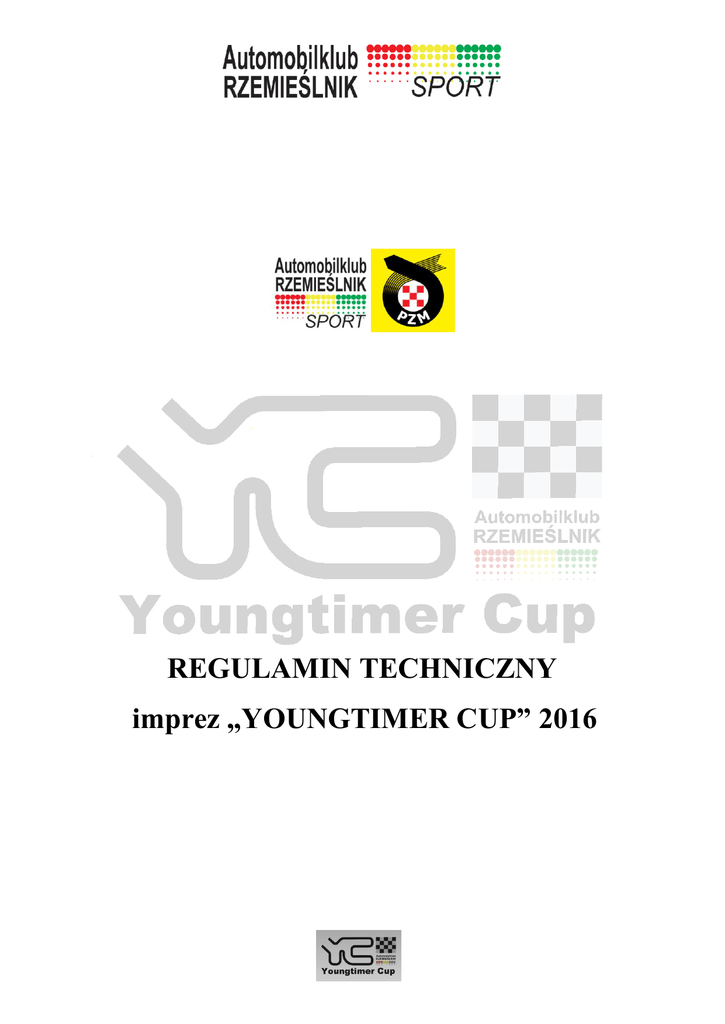 REGULAMIN TECHNICZNY imprez „YOUNGTIMER CUP” 2016 1. Przepisy Klasy Youngtimer (Y): Samochody dopuszczone do udziału których produkcja modeli rozpoczęła się przed 1 stycznia 1992 roku zostaną podzielone na klasy według pojemności skokowej silnika Silnik wraz z osprzętem stosowany przez producenta w modelu i generacji samochodu. Kompletne, oryginalne (lub zgodne z oryginalnym) wnętrze, tzn.: komplet foteli (zachowana ilość miejsc zgodna z dowodem rejestracyjnym), tapicerki, wykładziny podłogowe, podsufitki, deska rozdzielcza. Dopuszcza się użycie innych niż pochodzące od oryginalnych producentów materiałów z których wykonane są te elementy, pod warunkiem zachowania kształtu, funkcjonalności oraz estetyki fabrycznej. Szyby i lusterka wsteczne oryginalne lub zgodne z oryginalnymi (wykonane z tego samego materiału i zachowujące oryginalny kształt fabryczny). Seryjne elementy nadwozia – w szczególności zderzaki, klamki, pokrywy, atrapy, reflektory, i inne wpływające na funkcjonalność i estetykę samochodu Zaleca się stosowanie foteli i pasów minimum 4 punktowych (tylko i wyłącznie w konfiguracji fotel + pasy minimum 4 punktowe) z homologacją FIA. Dopuszcza się fotele oraz pasy minimum 4 punktowe z utraconą homologacją FIA. Co nie jest dozwolone jest zabronione. 1.1. Podział klasy Youngtimer według pojemności skokowej: Klasa Y-1600 do 1600 cm3, Klasa Y-2000 od 1300 cm3 do 2000 cm3, Klasa Y 2000+ powyżej 2000 cm3, 2. Przepisy klasy Youngtimer Sport (YS): Samochody dopuszczone do udziału których produkcja modeli rozpoczęła się przed 1 stycznia 1992, które posiadały homologacje FIA, krajową lub pucharową, zostaną podzielone na klasy według pojemności skokowej silnika, dopuszcza się samochody zbudowane według przepisów grupy 1, 2, 3, 4, 5 (według przepisów FIA, dotyczy samochodów homologowanych przed 1982 r.), popartych dokumentacją replik samochodów grupy H, DTM, Silnik stosowany przez producenta w startującym modelu i generacji samochodu. Możliwe zastosowanie silnika z innego, równolegle produkowanego modelu tego samego producenta. Klatka bezpieczeństwa zgodna z Załącznikiem „J” do Międzynarodowego Kodeksu Sportowego FIA (aktualne dokumenty dostępne na stronie: http://www.pzm.pl/regulaminy/) Fotele sportowe i pasy bezpieczeństwa Kierowcy oraz Pilota z ważną lub wygasłą homologacją FIA lub dopuszczone do użytku na drogach publicznych (konieczne oznakowanie znakiem homologacji międzynarodowej „E”). Elementy karoserii wykonane z laminatu lub innych materiałów nie stosowanych przez producenta muszą mieć zachowany oryginalny kształt (dopuszczalne –zgodne z epoką modyfikacje, poszerzenia, „body-kit'y”, itp.) oraz estetykę ich montażu. Dopuszcza się wymianę: pokrywy silnika i bagażnika, błotniki przednie i tylne -pod warunkiem, że taka zmiana nie osłabia konstrukcji nadwozia oraz nie stwarza zagrożenia dla Uczestników oraz Widzów. Co nie jest dozwolone jest zabronione. 2.1. Podział klasy Youngtimer Sport według pojemności skokowej: Klasa YS-1600 do 1600 cm3, Klasa YS-2000 od 1300 cm3 do 2000 cm3, Klasa YS 2000+ powyżej 2000 cm3, 3. Przepisy klasy OPEN : Samochody klas OPEN przydzielone będą samochody nie spełniające wymagań technicznych opisanych w pkt. 1. oraz 2. Nadwozia samochodów, których produkcja modeli rozpoczęła się przed 1 stycznia 1992. Zaleca się stosowanie klatek bezpieczeństwa Silnik dowolny pochodzący od producenta nadwozia Obowiązkowe fotele i pasy(4 punktowe) minimum z utraconą homologacją Organizator zastrzega sobie prawo do niedopuszczenia samochodu ze względów bezpieczeństwa oraz estetycznych. 3.1. Podział klasy OPEN według pojemności skokowej: Klasa OPEN-2000 do 2000 cm3, Klasa OPEN 2000+ powyżej 2000 cm3 3.2. 3.3. 3.4. 3.5. 3.6. Samochody posiadające turbodoładowanie zostaną dopuszczone do startu w klasie pojemnościowej wynikającej z pomnożenia nominalnej pojemności silnika przez współczynnik 1,7 dla silników benzynowych i 1,5 dla silnika diesla. Samochody wyposażone w silniki z tłokiem obrotowym (Wankla) zostaną przydzielone odpowiednio do klas YT 2000+, YS 2000+, YO 2000+. Samochody posiadające napęd na obie osie AWD zostaną przydzielone odpowiednio do klas YT 2000+, YS 2000+, OPEN 2000+. Organizator przewiduje dopuszczenie modeli samochodów których produkcja ro Każdy z uczestników zostanie poddany pomiarowi poziomu hałasu. Limit poziomu hałasu układu wydechowego zgodny z warunkami technicznymi pojazdu (do 93 dB(A)) Samochód uczestnika przez cały czas trwania imprezy musi znajdować się w ukompletowaniu identycznym jak podczas BK 1. Rozpoczęła się po 1 stycznia 1992 roku według uznania. 4. Przepisy klasy Youngtimer Formuła (YF): Dopuszcza się samochody typu Formuła zbudowane przed 1 stycznia 1992 r. Wyposażenie bezpieczeństwa (pasy, gaśnice, fotel) zgodne z okresem historycznym pojazdu Uczestnik musi przedstawić dokumentacje stwierdzającą autentyczność pojazdu (książeczka samochodu sportowego, certyfikat) W klasie Youngtimer Formuła (YF) nie ma podziału pojemnościowego Zatwierdzono dnia …………….r. przez OKSS PZM Warszawa