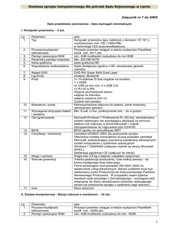 Dostawa sprzętu komputerowego dla potrzeb Sądu Rejonowego w Lipnie Załącznik nr 1 do SIWZ Opis przedmiotu zamówienia - Opis wymagań minimalnych I. Komputer przenośny – 2 szt. – wymagana cena jednostkowa do 3 450 PLN Lp. 1. Parametry Typ 3. 4. 5. 6. Procesor/wydajność obliczeniowa Pamięć operacyjna RAM Parametry pamięci masowej Karta graficzna Wyposażenie multimedialne 7. 8. 9. Napęd DVD Łączność Porty 10. Klawiatura i panel 11. 12. Wymagania dotyczące baterii i zasilania Oprogramowanie 13. 14. BIOS Certyfikaty i standardy 15. 16. Waga i wymiary Warunki gwarancji 17. Inne 2. opis Komputer przenośny typu notebook z ekranem 15”-16” o rozdzielczości: min. HD (1366x768) w technologii LED przeciwodblaskowy, Procesor powinien osiągać w teście wydajności PassMark wynik min. 4011 pkt. min. 4GB możliwość rozbudowy do min 8GB Min. 320 GB SATA karta graficzna HD Karta dźwiękowa zgodna z HD, wbudowane głośniki, mikrofon DVD RW Super Multi Dual Layer wireless, Bluetooth 1x 15-stykowe D-Sub (wyjście na monitor) 1 x HDMI 4x USB (w tym min. 2 x USB 3.0) 1x RJ-45 (LAN) Wyjście słuchawkowe stereo wejście na mikrofon wejście zasilania (DC-in) Czytnik kart pamięci Pełnowymiarowa odporna na zalanie, panel dotykowy, sterowaniem gestami Min. 6-cell, Li-Ion, podtrzymanie min. - do 4 godzin. Microsoft Windows 7 Professional PL (64-bit), zainstalowany system operacyjny nie wymagający aktywacji za pomocą telefonu lub Internetu w firmie Microsoft + nośnik. Oprogramowanie do nagrywania płyt CD/DVD BIOS zgodny ze specyfikacją UEFI Certyfikat ISO9001:2000 dla producenta sprzętu Oferowane modele komputerów muszą posiadać certyfikat Microsoft, potwierdzający poprawną współpracę oferowanych modeli komputerów z systemem operacyjnym Windows 7 32bit/64bit (załączyć wydruk ze strony Microsoft WHCL) Deklaracja zgodności CE (załączyć do oferty) Waga max 2,6 kg z baterią i napędem optycznym 3-letnia gwarancja producenta, czas reakcji serwisu - do końca następnego dnia roboczego. Firma serwisująca musi posiadać ISO 9001:2000 na świadczenie usług serwisowych. Serwis urządzeń musi być realizowany przez Producenta lub Autoryzowanego Partnera Serwisowego Producenta . W przypadku awarii dysków twardych dysk pozostaje u Zamawiającego – wymagane jest dołączenie do oferty oświadczenia podmiotu realizującego serwis lub producenta sprzętu o spełnieniu tego warunku. Mysz optyczna II. Zestaw komputerowy - Stacja robocza z monitorem - 32 szt. - wymagana cena jednostkowa do 3450 PLN Lp. 1. 2. Parametry Procesor/wydajność obliczeniowa Pamięć operacyjna RAM opis Procesor powinien osiągać w teście wydajności PassMark wynik min. 10050 pkt. min. 4GB możliwość rozbudowy do min. 16GB 1 Dostawa sprzętu komputerowego dla potrzeb Sądu Rejonowego w Lipnie 3. 4. Parametry pamięci masowej Karta graficzna 5. Wyposażenie multimedialne 6. Obudowa 7. 8. 9. Zgodność z systemami operacyjnymi I standardami BIOS Certyfikaty i standardy 10. Ergonomia 11. Warunki gwarancji 12. Wsparcie techniczne producenta 13. Wymagania dodatkowe 14. Oprogramowanie Min. 250 GB SATA II karta graficzna HD zintegrowana, możliwa rozdzielczość 1920 x1200 pixel Karta dźwiękowa zintegrowana, zgodna z HD, wewnętrzny głośnik w obudowie komputera Typu USFF Maksymalna suma wymiarów obudowy nie może przekraczać: 550mm Zasilacz o mocy min. 200W pracujący w sieci 230V 50/60Hz prądu zmiennego i efektywności min. do 90% Zgodność z 64-bitową wersją systemu operacyjnego Microsoft Windows 7 Professional PL BIOS zgodny ze specyfikacją UEFI Certyfikat ISO9001 dla producenta sprzętu (załączyć dokument potwierdzający spełnianie wymogu) Oferowane modele komputerów muszą posiadać certyfikat Microsoft, potwierdzający poprawną współpracę oferowanych modeli komputerów z systemem operacyjnym Windows 7 64bit (załączyć wydruk ze strony Microsoft WHCL) Deklaracja zgodności CE (załączyć do oferty) Komputer musi spełniać wymogi normy Energy Star 5 Głośność jednostki centralnej wykazana zgodnie z normą ISO 9296 w pozycji operatora w trybie pracy dysku twardego (WORK) - maksymalnie 27 dB 3-letnia gwarancja producenta świadczona na miejscu u klienta Czas reakcji serwisu - do końca następnego dnia roboczego Firma serwisująca musi posiadać ISO 9001:2000 na świadczenie usług serwisowych oraz posiadać autoryzacje producenta. W przypadku awarii dysków twardych dysk pozostaje u Zamawiającego – wymagane jest dołączenie do oferty oświadczenia podmiotu realizującego serwis lub producenta sprzętu o spełnieniu tego warunku. Możliwość telefonicznego sprawdzenia konfiguracji sprzętowej komputera oraz warunków gwarancji po podaniu numeru seryjnego bezpośrednio u producenta lub jego przedstawiciela. Dostęp do najnowszych sterowników i uaktualnień na stronie producenta stacji roboczej realizowany poprzez podanie na dedykowanej stronie internetowej producenta numeru seryjnego lub modelu komputera Microsoft Windows 7 Professional 64-bit, zainstalowany system operacyjny nie wymagający aktywacji za pomocą telefonu lub Internetu w firmie Microsoft + nośnik. Wbudowane porty: 1 x RS232, 1 x VGA, 2 x DisplayPort, min. 8 x USB w tym 4 USB 3.0, port sieciowy RJ-45, 2 porty wejścia audio, 2 porty wyjścia audio. Wymagana ilość i rozmieszczenie (na zewnątrz obudowy komputera) portów USB nie może być osiągnięta w wyniku stosowania konwerterów, przejściówek itp. Karta sieciowa 10/100/1000 Ethernet RJ 45, zintegrowana z płytą główną, wspierająca obsługę WoL (funkcja włączana przez użytkownika), PXE 2.1 Płyta główna z wbudowanymi, min. konektorem miniPCIe; Klawiatura USB w układzie polski programisty Mysz laserowa USB z min. 3 klawiszami oraz rolką (scroll) Nagrywarka DVD +/-RW wraz z oprogramowaniem do nagrywania i odtwarzania płyt Dołączony nośnik ze sterownikami MS Windows 7 Professional PL 64 bit OEM (lub równoważny), 2 Dostawa sp
