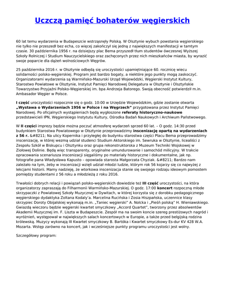 Uczczą pamięć bohaterów węgierskich 60 lat temu wydarzenia w Budapeszcie wstrząsnęły Polską. W Olsztynie wybuch powstania węgierskiego nie tylko nie przeszedł bez echa, co więcej zakończył się jedną z największych manifestacji w tamtym czasie. 30 października 1956 r. na dzisiejszy plac Bema przyszedł tłum studentów ówczesnej Wyższej Szkoły Rolniczej i Studium Nauczycielskiego oraz zachęconych przez nich mieszkańców miasta, by wyrazić swoje poparcie dla dążeń wolnościowych Węgrów. 25 października 2016 r. w Olsztynie odbędą się uroczystości upamiętniające 60. rocznicę wiecu solidarności polsko-węgierskiej. Program jest bardzo bogaty, a niektóre jego punkty mogą zaskoczyć. Organizatorami wydarzenia są Warmińsko-Mazurski Urząd Wojewódzki, Węgierski Instytut Kultury, Starostwo Powiatowe w Olsztynie, Instytut Pamięci Narodowej Delegatura w Olsztynie i Olsztyńskie Towarzystwo Przyjaźni Polsko-Węgierskiej im. bpa Andrzeja Batorego. Swoją obecność potwierdził m.in. Ambasador Węgier w Polsce. I część uroczystości rozpocznie się o godz. 10:00 w Urzędzie Wojewódzkim, gdzie zostanie otwarta „Wystawa o Wydarzeniach 1956 w Polsce i na Węgrzech” przygotowana przez Instytut Pamięci Narodowej. Po oficjalnych wystąpieniach będą wygłoszone referaty historyczno-naukowe przedstawicieli IPN, Węgierskiego Instytutu Kultury, Ośrodka Badań Naukowych i Archiwum Państwowego. W II części imprezy będzie można poczuć atmosferę wydarzeń sprzed 60 lat. – O godz. 14:30 przed budynkiem Starostwa Powiatowego w Olsztynie przeprowadzimy inscenizację opartą na wydarzeniach z 56 r. – Na ulicy Kopernika i przyległej do budynku starostwa części Placu Bema przeprowadzimy inscenizację, w której wezmą udział studenci Studium Aktorskiego im. Sewruka w Olsztynie, licealiści z Zespołu Szkół w Biskupcu i Olsztynku oraz grupa rekonstruktorska z Muzeum Techniki Wojskowej w Ziołowej Dolinie. Będą więc transparenty, oryginalne umundurowanie i samochód milicyjny. W trakcie opracowania scenariusza inscenizacji sięgaliśmy po materiały historyczne i dokumentalne, jak np. fotografie pana Władysława Kapusto – opowiada starosta Małgorzata Chyziak. – Bardzo nam zależało na tym, żeby w inscenizacji wzięli udział młodzi ludzie, którym rok 56 kojarzy się co najwyżej z lekcjami historii. Mamy nadzieję, że wtorkowa inscenizacja stanie się swojego rodzaju ideowym pomostem pomiędzy studentami z 56 roku a młodzieżą z roku 2016. Trwałości dobrych relacji i powiązań polsko-węgierskich dowiedzie też III część uroczystości, na która organizatorzy zapraszają do Filharmonii Warmińsko-Mazurskiej. O godz. 17:00 koncert rozpoczną młode skrzypaczki z Powiatowej Szkoły Muzycznej w Dywitach, w której korzysta się z dorobku pedagogicznego węgierskiego dydaktyka Zoltana Kodaly’a. Marcelina Rucińska i Zosia Hiszpańska, uczennice klasy skrzypiec Doroty Obijalskiej wykonają m.in. „Taniec węgierski” A. Nolcka i „Pieśń polską” H. Wieniawskiego. Gwiazdą wieczoru będzie węgierski kwartet smyczkowy „Accord Quartet”, tworzony przez absolwentów Akademii Muzycznej im. F. Liszta w Budapeszcie. Zespół ma na swoim koncie szereg prestiżowych nagród i wyróżnień, występował w największych salach koncertowych w Europie, a także przed belgijską rodzina królewską. Muzycy wykonają III Kwartet smyczkowy B. Bartóka i Kwartet smyczkowy Es-dur KV 428 W.A. Mozarta. Wstęp zarówno na koncert, jak i wcześniejsze punkty programu uroczystości jest wolny. Szczegółowy program: Drukuj