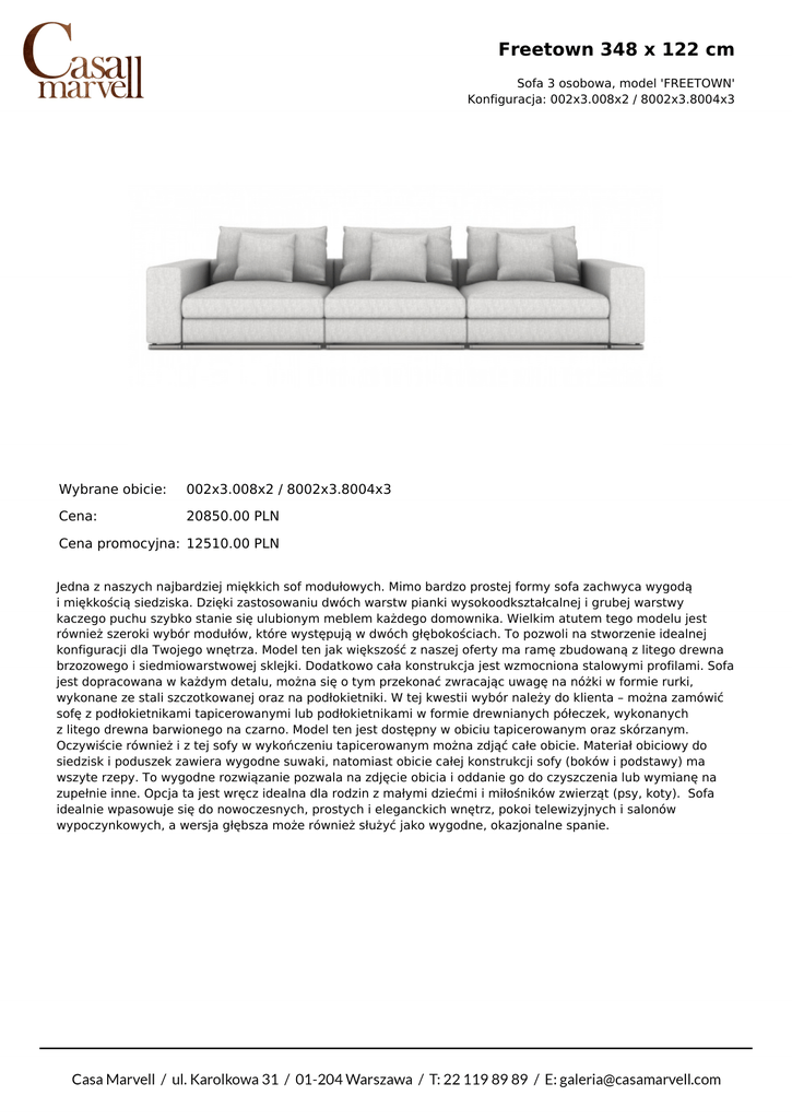 Freetown 348 x 122 cm Sofa 3 osobowa, model 'FREETOWN' Konfiguracja: 002x3.008x2 / 8002x3.8004x3 Wybrane obicie: 002x3.008x2 / 8002x3.8004x3 Cena: 20850.00 PLN Cena promocyjna: 12510.00 PLN Jedna z naszych najbardziej miękkich sof modułowych. Mimo bardzo prostej formy sofa zachwyca wygodą i miękkością siedziska. Dzięki zastosowaniu dwóch warstw pianki wysokoodkształcalnej i grubej warstwy kaczego puchu szybko stanie się ulubionym meblem każdego domownika. Wielkim atutem tego modelu jest również szeroki wybór modułów, które występują w dwóch głębokościach. To pozwoli na stworzenie idealnej konfiguracji dla Twojego wnętrza. Model ten jak większość z naszej oferty ma ramę zbudowaną z litego drewna brzozowego i siedmiowarstwowej sklejki. Dodatkowo cała konstrukcja jest wzmocniona stalowymi profilami. Sofa jest dopracowana w każdym detalu, można się o tym przekonać zwracając uwagę na nóżki w formie rurki, wykonane ze stali szczotkowanej oraz na podłokietniki. W tej kwestii wybór należy do klienta – można zamówić sofę z podłokietnikami tapicerowanymi lub podłokietnikami w formie drewnianych półeczek, wykonanych z litego drewna barwionego na czarno. Model ten jest dostępny w obiciu tapicerowanym oraz skórzanym. Oczywiście również i z tej sofy w wykończeniu tapicerowanym można zdjąć całe obicie. Materiał obiciowy do siedzisk i poduszek zawiera wygodne suwaki, natomiast obicie całej konstrukcji sofy (boków i podstawy) ma wszyte rzepy. To wygodne rozwiązanie pozwala na zdjęcie obicia i oddanie go do czyszczenia lub wymianę na zupełnie inne. Opcja ta jest wręcz idealna dla rodzin z małymi dziećmi i miłośników zwierząt (psy, koty). Sofa idealnie wpasowuje się do nowoczesnych, prostych i eleganckich wnętrz, pokoi telewizyjnych i salonów wypoczynkowych, a wersja głębsza może również służyć jako wygodne, okazjonalne spanie.