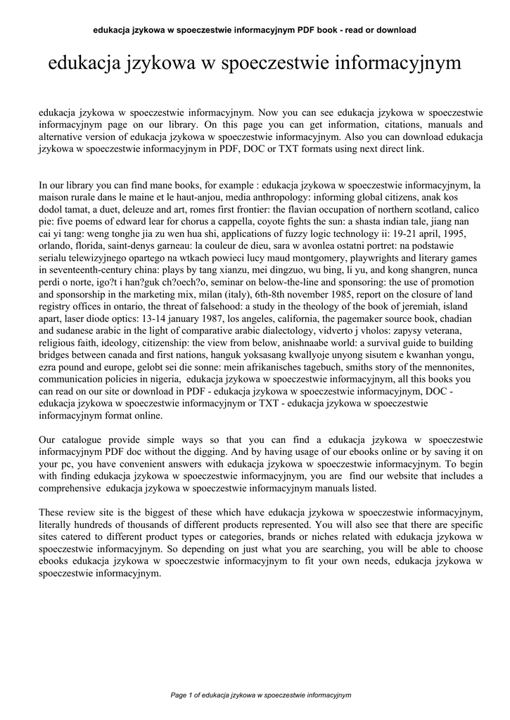 edukacja jzykowa w spoeczestwie informacyjnym PDF book - read or download edukacja jzykowa w spoeczestwie informacyjnym edukacja jzykowa w spoeczestwie informacyjnym. Now you can see edukacja jzykowa w spoeczestwie informacyjnym page on our library. On this page you can get information, citations, manuals and alternative version of edukacja jzykowa w spoeczestwie informacyjnym. Also you can download edukacja jzykowa w spoeczestwie informacyjnym in PDF, DOC or TXT formats using next direct link. In our library you can find mane books, for example : edukacja jzykowa w spoeczestwie informacyjnym, la maison rurale dans le maine et le haut-anjou, media anthropology: informing global citizens, anak kos dodol tamat, a duet, deleuze and art, romes first frontier: the flavian occupation of northern scotland, calico pie: five poems of edward lear for chorus a cappella, coyote fights the sun: a shasta indian tale, jiang nan cai yi tang: weng tonghe jia zu wen hua shi, applications of fuzzy logic technology ii: 19-21 april, 1995, orlando, florida, saint-denys garneau: la couleur de dieu, sara w avonlea ostatni portret: na podstawie serialu telewizyjnego opartego na wtkach powieci lucy maud montgomery, playwrights and literary games in seventeenth-century china: plays by tang xianzu, mei dingzuo, wu bing, li yu, and kong shangren, nunca perdi o norte, igo?t i han?guk ch?oech?o, seminar on below-the-line and sponsoring: the use of promotion and sponsorship in the marketing mix, milan (italy), 6th-8th november 1985, report on the closure of land registry offices in ontario, the threat of falsehood: a study in the theology of the book of jeremiah, island apart, laser diode optics: 13-14 january 1987, los angeles, california, the pagemaker source book, chadian and sudanese arabic in the light of comparative arabic dialectology, vidverto j vholos: zapysy veterana, religious faith, ideology, citizenship: the view from below, anishnaabe world: a survival guide to building bridges between canada and first nations, hanguk yoksasang kwallyoje unyong sisutem e kwanhan yongu, ezra pound and europe, gelobt sei die sonne: mein afrikanisches tagebuch, smiths story of the mennonites, communication policies in nigeria, edukacja jzykowa w spoeczestwie informacyjnym, all this books you can read on our site or download in PDF - edukacja jzykowa w spoeczestwie informacyjnym, DOC edukacja jzykowa w spoeczestwie informacyjnym or TXT - edukacja jzykowa w spoeczestwie informacyjnym format online. Our catalogue provide simple ways so that you can find a edukacja jzykowa w spoeczestwie informacyjnym PDF doc without the digging. And by having usage of our ebooks online or by saving it on your pc, you have convenient answers with edukacja jzykowa w spoeczestwie informacyjnym. To begin with finding edukacja jzykowa w spoeczestwie informacyjnym, you are find our website that includes a comprehensive edukacja jzykowa w spoeczestwie informacyjnym manuals listed. These review site is the biggest of these which have edukacja jzykowa w spoeczestwie informacyjnym, literally hundreds of thousands of different products represented. You will also see that there are specific sites catered to different product types or categories, brands or niches related with edukacja jzykowa w spoeczestwie informacyjnym. So depending on just what you are searching, you will be able to choose ebooks edukacja jzykowa w spoeczestwie informacyjnym to fit your own needs, edukacja jzykowa w spoeczestwie informacyjnym. Page 1 of edukacja jzykowa w spoeczestwie informacyjnym