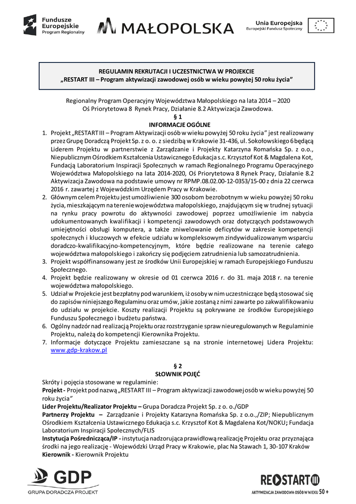 REGULAMIN REKRUTACJI I UCZESTNICTWA W PROJEKCIE „RESTART III – Program aktywizacji zawodowej osób w wieku powyżej 50 roku życia” 1. 2. 3. 4. 5. 6. 7. Regionalny Program Operacyjny Województwa Małopolskiego na lata 2014 – 2020 Oś Priorytetowa 8 Rynek Pracy, Działanie 8.2 Aktywizacja Zawodowa. §1 INFORMACJE OGÓLNE Projekt „RESTART III – Program Aktywizacji osób w wieku powyżej 50 roku życia” jest realizowany przez Grupę Doradczą Projekt Sp. z o. o. z siedzibą w Krakowie 31-436, ul. Sokołowskiego 6 będącą Liderem Projektu w partnerstwie z Zarządzanie i Projekty Katarzyna Romaoska Sp. z o.o., Niepublicznym Ośrodkiem Kształcenia Ustawicznego Edukacja s.c. Krzysztof Kot & Magdalena Kot, Fundacją Laboratorium Inspiracji Społecznych w ramach Regionalnego Programu Operacyjnego Województwa Małopolskiego na lata 2014-2020, Oś Priorytetowa 8 Rynek Pracy, Działanie 8.2 Aktywizacja Zawodowa na podstawie umowy nr RPMP.08.02.00-12-0353/15-00 z dnia 22 czerwca 2016 r. zawartej z Wojewódzkim Urzędem Pracy w Krakowie. Głównym celem Projektu jest umożliwienie 300 osobom bezrobotnym w wieku powyżej 50 roku życia, mieszkającym na terenie województwa małopolskiego, znajdującym się w trudnej sytuacji na rynku pracy powrotu do aktywności zawodowej poprzez umożliwienie im nabycia udokumentowanych kwalifikacji i kompetencji zawodowych oraz dotyczących podstawowych umiejętności obsługi komputera, a także zniwelowanie deficytów w zakresie kompetencji społecznych i kluczowych w efekcie udziału w kompleksowym zindywidualizowanym wsparciu doradczo-kwalifikacyjno-kompetencyjnym, które będzie realizowane na terenie całego województwa małopolskiego i zakooczy się podjęciem zatrudnienia lub samozatrudnienia. Projekt współfinansowany jest ze środków Unii Europejskiej w ramach Europejskiego Funduszu Społecznego. Projekt będzie realizowany w okresie od 01 czerwca 2016 r. do 31. maja 2018 r. na terenie województwa małopolskiego. Udział w Projekcie jest bezpłatny pod warunkiem, iż osoby w nim uczestniczące będą stosowad się do zapisów niniejszego Regulaminu oraz umów, jakie zostaną z nimi zawarte po zakwalifikowaniu do udziału w projekcie. Koszty realizacji Projektu są pokrywane ze środków Europejskiego Funduszu Społecznego i budżetu paostwa. Ogólny nadzór nad realizacją Projektu oraz rozstrzyganie spraw nieuregulowanych w Regulaminie Projektu, należą do kompetencji Kierownika Projektu. Informacje dotyczące Projektu zamieszczane są na stronie internetowej Lidera Projektu: www.gdp-krakow.pl §2 SŁOWNIK POJĘD Skróty i pojęcia stosowane w regulaminie: Projekt - Projekt pod nazwą „RESTART III – Program aktywizacji zawodowej osób w wieku powyżej 50 roku życia” Lider Projektu/Realizator Projektu – Grupa Doradcza Projekt Sp. z o. o./GDP Partnerzy Projektu – Zarządzanie i Projekty Katarzyna Romaoska Sp. z o.o.,/ZIP; Niepublicznym Ośrodkiem Kształcenia Ustawicznego Edukacja s.c. Krzysztof Kot & Magdalena Kot/NOKU; Fundacja Laboratorium Inspiracji Społecznych/FLIS Instytucja Pośrednicząca/IP - instytucja nadzorująca prawidłową realizację Projektu oraz przyznająca środki na jego realizację - Wojewódzki Urząd Pracy w Krakowie, plac Na Stawach 1, 30-107 Kraków Kierownik - Kierownik Projektu Kandydat/ka - osoba zgłaszająca chęd udziału w Projekcie, osoba bezrobotna w wieku powyżej 50 roku życia, zamieszkująca na terenie woj. małopolskiego, w tym osoba z niepełnosprawnościami, osoba o niskich kwalifikacjach, osoba długotrwale bezrobotna, która złożyła dokumenty rekrutacyjne do Projektu i oczekuje na ogłoszenie wyników rekrutacji Uczestnik Projektu - osoba zakwalifikowana do udziału w Projekcie, która podpisała Deklarację Uczestnictwa w Projekcie Biuro Projektu - ul. Sokołowskiego 6, 31-436 Kraków Biuro Lidera Projektu – siedziba GDP Sp. z o. o.: ul. Sokołowskiego 6, 31-436 Kraków Osoba bezrobotna – niezarejestrowana w ewidencji urzędów pracy tzn. niepracująca i niezarejestrowana w urzędzie pracy, ale poszukująca pracy i gotowy do jej podjęcia Osoba długotrwale bezrobotna - za osobę długotrwale bezrobotną w przypadku osób w wieku 25 lat i więcej, uznaje się osoby bezrobotne nieprzerwanie prze okres 12 miesięcy. Osoba o niskich kwalifikacjach - osoby z wykształceniem, co najwyżej średnim. Grupa obejmuje, więc osoby, które zakooczyły naukę na poziomie gimnazjum i poniżej, ukooczyły szkoły zasadnicze zawodowe, średnie zawodowe lub licea ogólnokształcące. Osoba niepełnosprawna - osoba niepełnosprawna w świetle przepisów ustawy z dnia 27 sierpnia 1997 r. o rehabilitacji zawodowej i społecznej oraz zatrudnieniu osób niepełnosprawnych (Dz.U. 2011 nr 127 poz. 721), a także osoby z zaburzeniami psychicznymi, o których mowa w ustawie z dnia 19 sierpnia 1994 r. o ochronie zdrowia psychicznego (Dz. U. 2011 nr 231, poz. 1375), tj. osoby z odpowiednim orzeczeniem lub innym dokumentem poświadczającym stan zdrowia. §3 REKRUTACJA I PRZYJMOWANIE ZGŁOSZEO I. INFORMACJE OGÓLNE 1. Rekrutacja Uczestników Projektu będzie prowadzona systematycznie (system etapowo-ciągły) w okresie od 01.06.2016 r. do 28.02.2018 r. lub do wyczerpania miejsc. 2. Nad prawidłowością rekrutacji nadzór sprawowad będzie Komisja Rekrutacyjna w składzie: Kierownik Projektu, Specjalista ds. Rekrutacji i Doradca Zawodowy. 3. Terminy rekrutacji i przyjmowania zgłoszeo będą zamieszczane na stronie internetowej Lidera Projektu. 4. Lider Projektu zastrzega możliwośd wcześniejszego wstrzymania rekrutacji w przypadku wyczerpania liczby miejsc przewidzianych w ramach rekrutacji. 5. Informacja o wstrzymaniu rekrutacji zostanie podana na stronie internetowej wskazanej w § 1 pkt. 7 Regulaminu na 7 dni przed datą zamknięcia rekrutacji. 6. W skład dokumentów rekrutacyjnych wchodzą: a) Regulamin rekrutacji i udziału w projekcie b) Załącznik nr 1 do Regulaminu – Kwestionariusz R