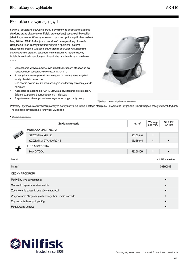 Ekstraktory do wykładzin AX 410 Ekstraktor dla wymagających Szybkie i skuteczne usuwanie brudu z dywanów to podstwowe zadanie stawiane przed ekstaktorem. Dzięki przemyślanej konstrukcji i wysokiej jakości wykonania, które są znakami rozpoznaczymi wszystkich urządzeń firmy Nilfisk, AX 410 oferuje niezawodność, łatwą obsługę i trwałość. Urządzenia te są zaprojektowane z myślą o spełnieniu potrzeb czyszczenia średniej wielkości powierzchnii pokrytych wykładzinami dywanowymi w biurach, szkołach, na lotniskach, w restauracjach, hotelach, centrach handlowych i innych obszarach o dużym natężeniu ruchu. • • • • • Czyszczenie w trybie podwójnym Smart Solutions™ stosowane do renowacji lub konserwacji wykładzin w AX 410 Przemyślane rozwiązania konstrukcyjne pozwalają zaoszczędzić wodę i środki chemiczne Siła ssania powoduje, że czas schnięcia wykładziny skrócony jest do minimum Akcesoria dołączone do AX410 ułatwiają czyszczenie obić siedzeń, ścian oraz plam w trudnodostępnych miejscach Regulowany uchwyt pozwala na ergonomiczną pozycję pracy Zdjęcia produktów mają charakter poglądowy Potrzeby użytkowników urządzeń piorących do wykładzin są różne. Dlatego oferujemy uniwersalne urządzenie umożliwiajace pracę w dwóch trybach - normalnego czyszczenia i renowacji wykładzin. ● Wyposażenie standardowe Nr. ref Wymag ane min. SZCZOTKA KPL. 12 56265340 1 SZCZOTKA STANDARD 16 56265044 1 ● 56220109 1 ● Zawiera akcesoria NILFISK AX410 MIOTŁA CYLINDRYCZNA INNE AKCESORIA HAND TOOL Model NILFISK AX410 Nr. ref 56265002 CECHY PRODUKTU Podwójny tryb czyszczenia ● Ssawa do tapicerki w standardzie ● Zdejmowanie szczotki bez użycia narzędzi ● Zdejmowanie ślizgacza próżniowego bez użycia narzędzi ● Czyszczenie twardych podłóg ● Regulowany uchwyt ● Zastrzegamy sobie prawo do zmian informacji bez uprzedzenia. 15561 Ekstraktory do wykładzin AX 410 Ekstraktor dla wymagających Dane techniczne NILFISK AX410 Długość przewodu (m) / typ wtyczki 15/EU Ciśnienie pompy (bar/psi) 4/60 Volt/częstotliwość (V/Hz) 220-240/50-60 Moc znamionowa (W) 1600 Przepływ powietrza (l/sek) 46 Poziom ciśnienia akustycznego (dB(A) BS 5415) 69 Szerokość robocza (mm) 410 Szerokość zasysania (mm) 457 Zbiornik roztworu/nieczystości (l) 30/23 Długość x szerokość x wysokość (cm) 71x47x80 Ciężar (kg) 45 ● Wyposażenie standardowe, ○ Akcesoria opcjonalne, □ Montaż w fabryce Nr. ref Wymag ane min. NILFISK AX410 WAND 56262209 0 □ WAND ASSEMBLY 56314402 0 □ HAND TOOL 56220109 1 ● PLUG ADAPTOR KIT 56265309 0 □ UPHOLSTERY HAND TOOL 56220070 1 □ WAND ASSY. W/SOFT FLOOR TOOL 56265173 0 □ Zestaw do czyszczenia 56265305 1 □ 56265150 0 □ "SZCZOTKA KPL.16"" TWARDA" 56265175 0 □ SZCZOTKA KPL. 12 56265340 1 SZCZOTKA STANDARD 16 56265044 1 ● SZCZOTKA STANDARD 240 ŚCIERNA 16 56265176 0 □ HOSE ASSY 56265368 1 □ Wąż 4,6 m 56265174 0 □ Akcesoria RURA PROSTA INNE AKCESORIA ZESPOŁY MONTAŻOWE SQUEEGEE TOOL HARD FLOOR 24 MIOTŁA CYLINDRYCZNA WĄŻ SSĄCY Zastrzegamy sobie prawo do zmian informacji bez uprzedzenia. 15561
