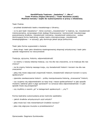 HartOFFanie Teatrem: „Jesteśmy” / „Ми-є” Teatr Pralnia (Kijów/Ukraina) / Teatr Szwalnia (Łódź) Możliwe tematy i wątki do wykorzystania w pracy z młodzieżą Teatr Pralnia - przykład działalności teatru niezależnego z Ukrainy; - co to jest teatr niezależny? różne wymiary „niezależności” w teatrze, np. niezależność instytucjonalna, oznaczająca brak stałego finansowania i konieczność nieustannego poszukiwania środków; niezależność mentalna; niezależność estetyczna - wobec dominującej formy teatralnej, wobec teatru dramatycznego; niezależność światopoglądowa – w sytuacji, gdy dominuje jakaś opcja polityczna; Teatr jako forma wypowiedzi o świecie - dwie drogi: teatr jako dziedzina nieskrępowanej ekspresji artystycznej i teatr jako sposób reagowania na rzeczywistość Tradycja, ojczyzna, historia, odpowiedzialność - co wiemy o naszej własnej tradycji, czy ma dla nas znaczenie, co ta tradycja dla nas znaczy? - na ile znamy historię naszego kraju, czy świadomość historii i korzeni ma dla nas znaczenie? - jaką rolę może odgrywać znajomość historii, świadomość własnych korzeni w życiu społecznym? - zjawisko zawłaszczania historii – próby manipulowania historią, „kreowania” historii; - czy czujemy się odpowiedzialni za nasz kraj i nasze społeczeństwo? w jaki sposób możemy zabierać głoś w jego sprawach? co oznacza taka odpowiedzialność i w jaki sposób może się przejawiać? - czy myślimy o swoim „ja” w kategoriach społecznych – „my”? Forma teatralna wykorzystana przez twórców spektaklu: – jakich środków artystycznych użyli artyści? - jaka może być rola niewerbalnych środków wyrazu? - jaka rolę odgrywa muzyka w przedstawieniu? Opracowała: Dagmara Gumkowska