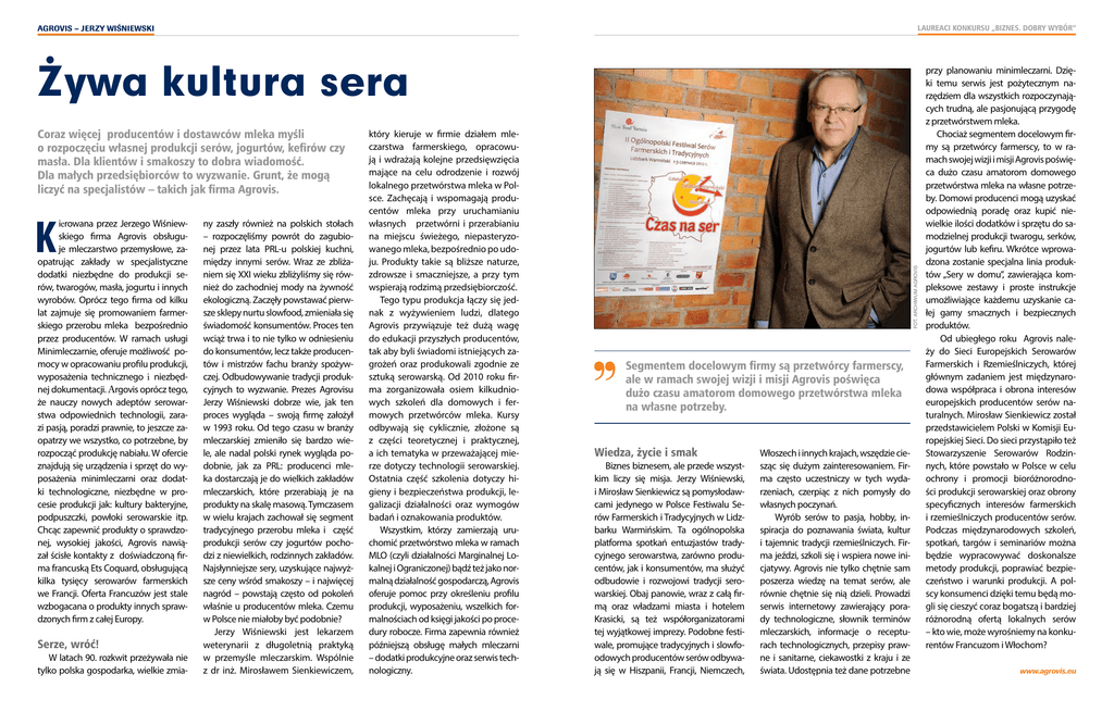 Laureaci konkursu „Biznes. Dobry wybór” Agrovis – Jerzy Wiśniewski Coraz więcej producentów i dostawców mleka myśli o rozpoczęciu własnej produkcji serów, jogurtów, kefirów czy masła. Dla klientów i smakoszy to dobra wiadomość. Dla małych przedsiębiorców to wyzwanie. Grunt, że mogą liczyć na specjalistów – takich jak firma Agrovis. K ierowana przez Jerzego Wiśniewskiego firma Agrovis obsługuje mleczarstwo przemysłowe, zaopatrując zakłady w specjalistyczne dodatki niezbędne do produkcji serów, twarogów, masła, jogurtu i innych wyrobów. Oprócz tego firma od kilku lat zajmuje się promowaniem farmerskiego przerobu mleka bezpośrednio przez producentów. W ramach usługi Minimleczarnie, oferuje możliwość pomocy w opracowaniu profilu produkcji, wyposażenia technicznego i niezbędnej dokumentacji. Argovis oprócz tego, że nauczy nowych adeptów serowarstwa odpowiednich technologii, zarazi pasją, poradzi prawnie, to jeszcze zaopatrzy we wszystko, co potrzebne, by rozpocząć produkcję nabiału. W ofercie znajdują się urządzenia i sprzęt do wyposażenia minimleczarni oraz dodatki technologiczne, niezbędne w procesie produkcji jak: kultury bakteryjne, podpuszczki, powłoki serowarskie itp. Chcąc zapewnić produkty o sprawdzonej, wysokiej jakości, Agrovis nawiązał ścisłe kontakty z doświadczoną firma francuską Ets Coquard, obsługującą kilka tysięcy serowarów farmerskich we Francji. Oferta Francuzów jest stale wzbogacana o produkty innych sprawdzonych firm z całej Europy. Serze, wróć! W latach 90. rozkwit przeżywała nie tylko polska gospodarka, wielkie zmia- ny zaszły również na polskich stołach – rozpoczęliśmy powrót do zagubionej przez lata PRL-u polskiej kuchni, między innymi serów. Wraz ze zbliżaniem się XXI wieku zbliżyliśmy się również do zachodniej mody na żywność ekologiczną. Zaczęły powstawać pierwsze sklepy nurtu slowfood, zmieniała się świadomość konsumentów. Proces ten wciąż trwa i to nie tylko w odniesieniu do konsumentów, lecz także producentów i mistrzów fachu branży spożywczej. Odbudowywanie tradycji produkcyjnych to wyzwanie. Prezes Agrovisu Jerzy Wiśniewski dobrze wie, jak ten proces wygląda – swoją firmę założył w 1993 roku. Od tego czasu w branży mleczarskiej zmieniło się bardzo wiele, ale nadal polski rynek wygląda podobnie, jak za PRL: producenci mleka dostarczają je do wielkich zakładów mleczarskich, które przerabiają je na produkty na skalę masową. Tymczasem w wielu krajach zachował się segment tradycyjnego przerobu mleka i część produkcji serów czy jogurtów pochodzi z niewielkich, rodzinnych zakładów. Najsłynniejsze sery, uzyskujące najwyższe ceny wśród smakoszy – i najwięcej nagród – powstają często od pokoleń właśnie u producentów mleka. Czemu w Polsce nie miałoby być podobnie? Jerzy Wiśniewski jest lekarzem weterynarii z długoletnią praktyką w przemyśle mleczarskim. Wspólnie z dr inż. Mirosławem Sienkiewiczem, który kieruje w firmie działem mleczarstwa farmerskiego, opracowują i wdrażają kolejne przedsięwzięcia mające na celu odrodzenie i rozwój lokalnego przetwórstwa mleka w Polsce. Zachęcają i wspomagają producentów mleka przy uruchamianiu własnych przetwórni i przerabianiu na miejscu świeżego, niepasteryzowanego mleka, bezpośrednio po udoju. Produkty takie są bliższe naturze, zdrowsze i smaczniejsze, a przy tym wspierają rodzimą przedsiębiorczość. Tego typu produkcja łączy się jednak z wyżywieniem ludzi, dlatego Agrovis przywiązuje też dużą wagę do edukacji przyszłych producentów, tak aby byli świadomi istniejących zagrożeń oraz produkowali zgodnie ze sztuką serowarską. Od 2010 roku firma zorganizowała osiem kilkudniowych szkoleń dla domowych i fermowych przetwórców mleka. Kursy odbywają się cyklicznie, złożone są z części teoretycznej i praktycznej, a ich tematyka w przeważającej mierze dotyczy technologii serowarskiej. Ostatnia część szkolenia dotyczy higieny i bezpieczeństwa produkcji, legalizacji działalności oraz wymogów badań i oznakowania produktów. Wszystkim, którzy zamierzają uruchomić przetwórstwo mleka w ramach MLO (czyli działalności Marginalnej Lokalnej i Ograniczonej) bądź też jako normalną działalność gospodarczą, Agrovis oferuje pomoc przy określeniu profilu produkcji, wyposażeniu, wszelkich formalnościach od księgi jakości po procedury robocze. Firma zapewnia również późniejszą obsługę małych mleczarni – dodatki produkcyjne oraz serwis technologiczny. FOT. archiwum agrovis Żywa kultura sera Segmentem docelowym firmy są przetwórcy farmerscy, ale w ramach swojej wizji i misji Agrovis poświęca dużo czasu amatorom domowego przetwórstwa mleka na własne potrzeby. Wiedza, życie i smak Biznes biznesem, ale przede wszystkim liczy się misja. Jerzy Wiśniewski, i Mirosław Sienkiewicz są pomysłodawcami jedynego w Polsce Festiwalu Serów Farmerskich i Tradycyjnych w Lidzbarku Warmińskim. Ta ogólnopolska platforma spotkań entuzjastów tradycyjnego serowarstwa, zarówno producentów, jak i konsumentów, ma służyć odbudowie i rozwojowi tradycji serowarskiej. Obaj panowie, wraz z całą firmą oraz władzami miasta i hotelem Krasicki, są też współorganizatorami tej wyjątkowej imprezy. Podobne festiwale, promujące tradycyjnych i slowfoodowych producentów serów odbywają się w Hiszpanii, Francji, Niemczech, Włoszech i innych krajach, wszędzie ciesząc się dużym zainteresowaniem. Firma często uczestniczy w tych wydarzeniach, czerpiąc z nich pomysły do własnych poczynań. Wyrób serów to pasja, hobby, inspiracja do poznawania świata, kultur i tajemnic tradycji rzemieślniczych. Firma jeździ, szkoli się i wspiera nowe inicjatywy. Agrovis nie tylko chętnie sam poszerza wiedzę na temat serów, ale równie chętnie się nią dzieli. Prowadzi serwis internetowy zawierający pora