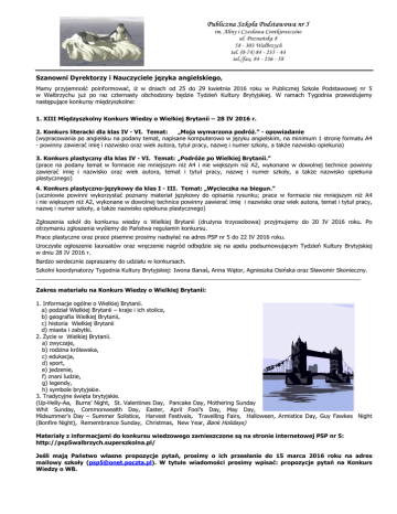 Publiczna Szkoła Podstawowa nr 5 im. Aliny i Czesława Centkiewiczów ul. Poznańska 8 58 - 303 Wałbrzych tel. (0-74) 84 - 235 - 44 tel./fax. 84 - 236 - 58 Szanowni Dyrektorzy i Nauczyciele języka angielskiego, Mamy przyjemność poinformować, iż w dniach od 25 do 29 kwietnia 2016 roku w Publicznej Szkole Podstawowej nr 5 w Wałbrzychu już po raz czternasty obchodzony będzie Tydzień Kultury Brytyjskiej. W ramach Tygodnia przewidujemy następujące konkursy międzyszkolne: 1. XIII Międzyszkolny Konkurs Wiedzy o Wielkiej Brytanii – 28 IV 2016 r. 2. Konkurs literacki dla klas IV - VI. Temat: „Moja wymarzona podróż.” - opowiadanie (wypracowania po angielsku na podany temat, napisane komputerowo w języku angielskim, na minimum 1 stronę formatu A4 - powinny zawierać imię i nazwisko oraz wiek autora, tytuł pracy, nazwę i numer szkoły, a także nazwisko opiekuna) 3. Konkurs plastyczny dla klas IV - VI. Temat: „Podróże po Wielkiej Brytanii.” (prace na podany temat w formacie nie mniejszym niż A4 i nie większym niż A2, wykonane w dowolnej technice powinny zawierać imię i nazwisko oraz wiek autora, temat i tytuł pracy, nazwę i numer szkoły, a także nazwisko opiekuna plastycznego) 4. Konkurs plastyczno-językowy da klas I - III. Temat: „Wycieczka na biegun.” (uczniowie powinni wykorzystać poznany materiał językowy do opisania rysunku; prace w formacie nie mniejszym niż A4 i nie większym niż A2, wykonane w dowolnej technice powinny zawierać imię i nazwisko oraz wiek autora, temat i tytuł pracy, nazwę i numer szkoły, a także nazwisko opiekuna plastycznego) Zgłoszenia szkół do konkursu wiedzy o Wielkiej Brytanii (drużyna trzyosobowa) przyjmujemy do 20 IV 2016 roku. Po otrzymaniu zgłoszenia wyślemy do Państwa regulamin konkursu. Prace plastyczne oraz prace pisemne prosimy nadsyłać na adres PSP nr 5 do 22 IV 2016 roku. Uroczyste ogłoszenie laureatów oraz wręczenie nagród odbędzie się na apelu podsumowującym Tydzień Kultury Brytyjskiej w dniu 28 IV 2016 r. Bardzo serdecznie zapraszamy do udziału w konkursach. Szkolni koordynatorzy Tygodnia Kultury Brytyjskiej: Iwona Banaś, Anna Wątor, Agnieszka Osińska oraz Sławomir Skonieczny. ___________________________________________________________________________________________________ Zakres materiału na Konkurs Wiedzy o Wielkiej Brytanii: 1. Informacje ogólne o Wielkiej Brytanii. a) podział Wielkiej Brytanii – kraje i ich stolice, b) geografia Wielkiej Brytanii, c) historia Wielkiej Brytanii d) miasta i zabytki. 2. Życie w Wielkiej Brytanii. a) zwyczaje, b) rodzina królewska, c) edukacja, d) sport, e) jedzenie, f) znani ludzie, g) legendy, h) symbole brytyjskie. 3. Tradycyjne święta brytyjskie. (Up-Helly-Aa, Burns’ Night, St. Valentines Day, Pancake Day, Mothering Sunday Whit Sunday, Commonwealth Day, Easter, April Fool’s Day, May Day, Midsummer’s Day – Summer Solistice, Harvest Festivals, Travelling Fairs, Halloween, Armistice Day, Guy Fawkes Night (Bonfire Night), Remembrance Sunday, Christmas, New Year, Bank Holidays) Materiały z informacjami do konkursu wiedzowego zamieszczone są na stronie internetowej PSP nr 5: http://psp5walbrzych.superszkolna.pl/ Jeśli mają Państwo własne propozycje pytań, prosimy o ich przesłanie do 15 marca 2016 roku na adres mailowy szkoły ([email protected]). W tytule wiadomości prosimy wpisać: propozycje pytań na Konkurs Wiedzy o WB. Formularz zgłoszenia Publiczna Szkoła Podstawowa nr ……………………… Zgłaszamy następujących uczniów do Konkursu Wiedzy o Wielkiej Brytanii: 1. ……………………………………………………………………………………… Imię i nazwisko 2. ……………………………………………………………………………………… Imię i nazwisko 3. ……………………………………………………………………………………… Imię i nazwisko Opiekun: ………………………………………………………………………………………