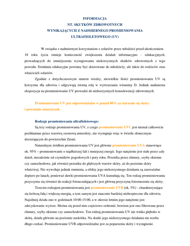 INFORMACJA NT. SKUTKÓW ZDROWOTNYCH WYNIKAJĄCYCH Z NADMIERNEGO PROMIENIOWANIA ULTRAFIOLETOWEGO (UV) W związku z nadmiernym korzystaniem z solariów przez młodzież przed ukończeniem 18 roku życia istnieje konieczność zwiększenia działań informacyjno - edukacyjnych, prowadzących do zmniejszenia występowania niekorzystnych skutków zdrowotnych z tego powodu. Działania edukacyjne powinny być skierowane do młodzieży, ale także do rodziców oraz właścicieli solariów. Zgodnie z dotychczasowym stanem wiedzy, niewielkie ilości promieniowania UV są korzystne dla zdrowia i odgrywają istotną rolę w wytwarzaniu witaminy D. Jednak nadmierna ekspozycja na promieniowanie UV prowadzi do niekorzystnych konsekwencji zdrowotnych. Promieniowanie UV jest odpowiedzialne w ponad 80% za starzenie się skóry i powstanie zmarszczek. Rodzaje promieniowania ultrafioletowego: Są trzy rodzaje promieniowania UV, z czego promieniowanie UVC jest niemal całkowicie pochłaniane przez warstwę ozonową atmosfery, nie występuje więc w świetle słonecznym docierającym do powierzchni Ziemi. Naturalnym źródłem promieniowania UV jest głównie promieniowanie UVA stanowiące ok. 95% – promieniowanie o najdłuższej fali i mniejszej energii. Jego natężenie jest stałe przez cały dzień, niezależnie od czynników pogodowych i pory roku. Przenika przez chmury, szyby okienne czy samochodowe, jak również przenika do głębszych warstw skóry, aż do poziomu skóry właściwej. Nie wywołuje jednak rumienia, a efekty jego niekorzystnego działania są zauważalne dopiero po latach, ponieważ dawki promieniowania UVA kumulują się. Ten rodzaj promieniowania przyczynia się również do reakcji fotouczulających i jest główną przyczyną fotostarzenia się skóry. Trzecim rodzajem promieniowania jest promieniowanie UVB (ok. 5%) - charakteryzujące się krótszą falą i większą energią, a tym samym jest znacznie bardziej niebezpieczne dla zdrowia. Najsilniej działa ono w godzinach 10:00-15:00, a w okresie letnim jego natężenie jest zdecydowanie wyższe. Można się przed nim częściowo ochronić, bowiem jest ono filtrowane przez chmury, szyby okienne czy samochodowe. Ten rodzaj promieniowania UV nie wnika głęboko w skórę, działa głównie na poziomie naskórka. Na skutki jego niekorzystnego działania nie trzeba długo czekać. Promieniowanie UVB odpowiedzialne jest za poparzenia skóry i wystąpienie rumienia posłonecznego. Ponadto powoduje zmniejszenie odpowiedzi immunologicznej organizmu, co może predysponować do wystąpienia zmian nowotworowych skóry oraz innych organów (może być jednym z powodów występowania np. zaćmy). Zdrowotne konsekwencje narażania na promieniowanie UV: • fotostarzenie się skóry - czyli przedwczesne starzenie się skóry spowodowane wieloma procesami zachodzącymi pod wpływem promieniowania ultrafioletowego, • nowotwory skóry - nadmierna ekspozycja na promieniowanie UV może prowadzić do przewlekłym zmian skórnych o charakterze nowotworowym jak: czerniak złośliwy,rak podstawnokomórkowy, rak kolczystonabłonkowy, • przebarwienia skóry - pojawiają się w przypadku nadmiernego przebywania na słońcu lub intensywnego, długotrwałego korzystania z solarium, • zaskórniki - promieniowanie UV ma wpływ na wzrost ilości pojawiających się zaskórników na skórze, • nadprodukcja wolnych rodników - czyli reaktywnych form tlenu, które powodują utlenianie, drobne uszkodzenia i degenerację włókiem kolagenowych. Pogarszają stan skóry, przyspieszają jej starzenie, • immunosupresja - zwiększona ekspozycja na promieniowanie UV prowadzi do osłabienia układu odpornościowego. Udowodniono, że intensywne opalanie się prowadzi do reaktywacji wirusa opryszczki - Hermes Simplex Virus. Poziom osłabienia odporności organizmu przez promieniowanie UVB zależy od indywidualnych i genetycznych uwarunkowań, • fotodermatozy – nienowotworowe choroby skóry, wynikające z powstających w organizmie szkodliwych związków, aktywujących się pod wpływem promieni UV, • choroby oczu – wykazano, że istnieje zależność między zaćmą a nadmierną ilością promieniowania UVB. Dlatego tak ważna jest ochrona oczu za pomocą okularów przeciwsłonecznych, które wyposażone są w specjalne filtry. Na całym świecie rocznie ok. 12-15 ml osób oślepło z powodu zaćmy, z czego 20% może być spowodowane działaniem promieniowania słonecznego, • rumień i oparzenia słoneczne, • reakcje fotouczulające1. Dzieci i młodzież są szczególnie narażone na szkodliwy wpływ promieniowania UV. Nadmierna ekspozycja młodzieży na słońce, szczególnie sztuczne, może przyczynić się do powstania raka skóry w późniejszym wieku. Mechanizmy dowodzące tej zależności nie są do końca jasne, ale pewne jest, że skóra jest bardziej podatna na szkodliwe skutki promieniowania UV w okresie rozwojowym. Narażenie na długotrwałą ekspozycję na promieniowanie UV (zarówno naturalne i sztuczne) w okresie dzieciństwa i dojrzewania, znacząco zwiększa ryzyko wystąpienia czerniaka i innych nowotworów skóry w późniejszym wieku, a w/w predyspozycja zwiększa się u osób narażonych na promieniowanie UV przed ukończeniem 18 roku życia. Z Konwencji o Prawach Dziecka przyjętej przez Organizację Narodów Zjednoczonych wynika, że dzieci i młodzież na wszystkich etapach rozwoju, od poczęcia aż do 18 r.ż., mają prawo do korzystania z najwyższego, możliwego do osiągnięcia poziomu ochrony zdrowia i bezpiecznego środowiska. Zalecane środki chroniące przed nadmiernym promieniowaniem UV (wg WHO): • należy ograniczyć czas przebywania w słońcu szczególnie koło południa, w godz. 10:00-14:00, • należy robić przerwy w opalaniu się, częściej przebywać w cieniu, • należy nosić ubrania ochronne, bawełniane, nie eksponować całego ciała, szczególnie chronić: oczy, twarz, szyję, • należy nosić okula