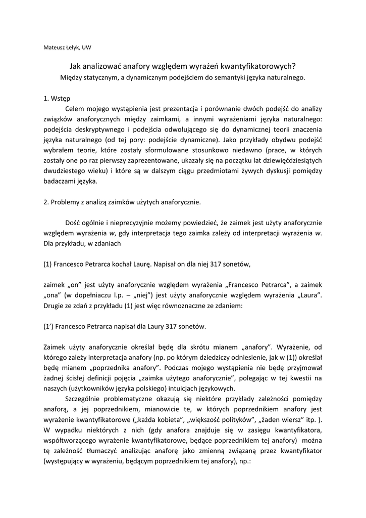 Mateusz Łełyk, UW Jak analizowad anafory względem wyrażeo kwantyfikatorowych? Między statycznym, a dynamicznym podejściem do semantyki języka naturalnego. 1. Wstęp Celem mojego wystąpienia jest prezentacja i porównanie dwóch podejśd do analizy związków anaforycznych między zaimkami, a innymi wyrażeniami języka naturalnego: podejścia deskryptywnego i podejścia odwołującego się do dynamicznej teorii znaczenia języka naturalnego (od tej pory: podejście dynamiczne). Jako przykłady obydwu podejśd wybrałem teorie, które zostały sformułowane stosunkowo niedawno (prace, w których zostały one po raz pierwszy zaprezentowane, ukazały się na początku lat dziewięddziesiątych dwudziestego wieku) i które są w dalszym ciągu przedmiotami żywych dyskusji pomiędzy badaczami języka. 2. Problemy z analizą zaimków użytych anaforycznie. Dośd ogólnie i nieprecyzyjnie możemy powiedzied, że zaimek jest użyty anaforycznie względem wyrażenia w, gdy interpretacja tego zaimka zależy od interpretacji wyrażenia w. Dla przykładu, w zdaniach (1) Francesco Petrarca kochał Laurę. Napisał on dla niej 317 sonetów, zaimek „on” jest użyty anaforycznie względem wyrażenia „Francesco Petrarca”, a zaimek „ona” (w dopełniaczu l.p. – „niej”) jest użyty anaforycznie względem wyrażenia „Laura”. Drugie ze zdao z przykładu (1) jest więc równoznaczne ze zdaniem: (1’) Francesco Petrarca napisał dla Laury 317 sonetów. Zaimek użyty anaforycznie określał będę dla skrótu mianem „anafory”. Wyrażenie, od którego zależy interpretacja anafory (np. po którym dziedziczy odniesienie, jak w (1)) określał będę mianem „poprzednika anafory”. Podczas mojego wystąpienia nie będę przyjmował żadnej ścisłej definicji pojęcia „zaimka użytego anaforycznie”, polegając w tej kwestii na naszych (użytkowników języka polskiego) intuicjach językowych. Szczególnie problematyczne okazują się niektóre przykłady zależności pomiędzy anaforą, a jej poprzednikiem, mianowicie te, w których poprzednikiem anafory jest wyrażenie kwantyfikatorowe („każda kobieta”, „większośd polityków”, „żaden wiersz” itp. ). W wypadku niektórych z nich (gdy anafora znajduje się w zasięgu kwantyfikatora, współtworzącego wyrażenie kwantyfikatorowe, będące poprzednikiem tej anafory) można tę zależnośd tłumaczyd analizując anaforę jako zmienną związaną przez kwantyfikator (występujący w wyrażeniu, będącym poprzednikiem tej anafory), np.: (2) Każdy chłopiec podziwia swojego ojca. W (2) zaimek „swój” (użyty w dopełniaczu l.p.) jest anaforą względem wyrażenia kwantyfikatorowego „każdy chłopiec”. Ponieważ występuje on w zasięgu kwantyfikatora „każdy x”, wchodzącego w skład wyrażenia „każdy chłopiec”, zdanie (2) możemy zanalizowad jako: (2’) 1 Prawdziwe wyzwanie dla wszystkich teorii znaczenia stanowią jednak zdania (lub ciągi zdao), w których poprzednikiem anafory jest wyrażenie kwantyfikatorowe, nie obejmujące swoim zasięgiem anafory, dla której jest ono poprzednikiem, np.: (3) Każdy, kto kupił sobie książkę Olgi Tokarczuk, przeczytał ją z zaciekawieniem.2 (4) Pewien mężczyzna kupił sobie najnowszą płytę „The Rolling Stones”. Nie mógł się on od niej oderwad przez najbliższy tydzieo. (5) Jeśli mężczyzna kocha kobietę, to pisze dla niej wiersze. (6) Marek zbudował klika zamków z piasku, ale Piotrek je zniszczył. Problem z tymi trzema zdaniami jest taki, że ich przekład na język logiki pierwszego rzędu, w którym kwantyfikator z poprzednika odpowiedniej anafory wiąże zmienną reprezentującą tę anaforę jest albo niekompozycyjny ((3), (5)), albo nie oddaje intuicyjnych warunków prawdziwości ((6)), albo jest niewskazany ze względów syntaktycznych ((4), gdzie zasięg kwantyfikatora musiałby wykraczad poza jedno zdanie). W trakcie referatu podaję warunek konieczny i wystarczający do tego, by zmienna reprezentująca daną anaforę mogła byd związana przez kwantyfikator występujący w jej poprzedniku (za pomocą pojęcia „ccommands”, wykorzystywanego także przez Neale’a (Neale, *1990+, rozdz. 5). 2. Dwie teorie 2.1 Anafora deskryptywna Jako przykład podejścia deskryptywnego zamierzam przedstawid teorię Stephena Neale’a po raz pierwszy sformułowaną w pracy pt. „Descriptions” (Neale, *1990+), będącą rozwinięciem teorii Garetha Evansa z artykułu „Pronouns, Quantifiers and Relative Clauses” (Evans, [2002]). Neale formułując swoja teorię wprost (Neale, *1990+ s. 252, przypis nr 5) odcina się od tezy, że do właściwego oddania związków anaforycznych między wyrażeniami 1 Piszę „P x” dla „x jest P”, oraz „R xy” dla „x jest w relacji R z y”. Przyjmuję, że naturalną interpretacją tego zdania jest ta, w której kwantyfikator egzystencjalny ma wąski zasięg względem kwantyfikatora ogólnego. Jest to dośd oczywiste założenie. 2 języka naturalnego potrzebne jest sformułowanie innej niż tradycyjna teorii semantycznej, która traktowałaby znaczenie zdao jako „coś więcej” niż tylko warunki jego prawdziwości. W podejściu Neale’a charakterystyczne jest, że dla wyjaśnienia zależności anaforycznych przywołuje on kilka mechanizmów. I tak: i. anafora, której poprzednikiem jest wyrażenie odnoszące się (nazwa własna, wyrażenia wskazujące itp.), odnosi się do tego samego przedmiotu, do którego odnosi się to wyrażenie (zjawisko koreferencyjności). ii. anafora, której poprzednikiem jest wyrażenie kwantyfikatorowe, w stosunku do którego stoi ona w relacji „c-commands”, jest interpretowana jako zmienna związana kwantyfikatorem, wchodzącym w skład tego wyrażenia kwantyfikatorowego. iii. anafora, której poprzednikiem jest wyrażenie kwantyfikatorowe, w stosunku do którego nie stoi ona w relacji „c-commands”, jest interpretowana albo jako „zaimek lenistw