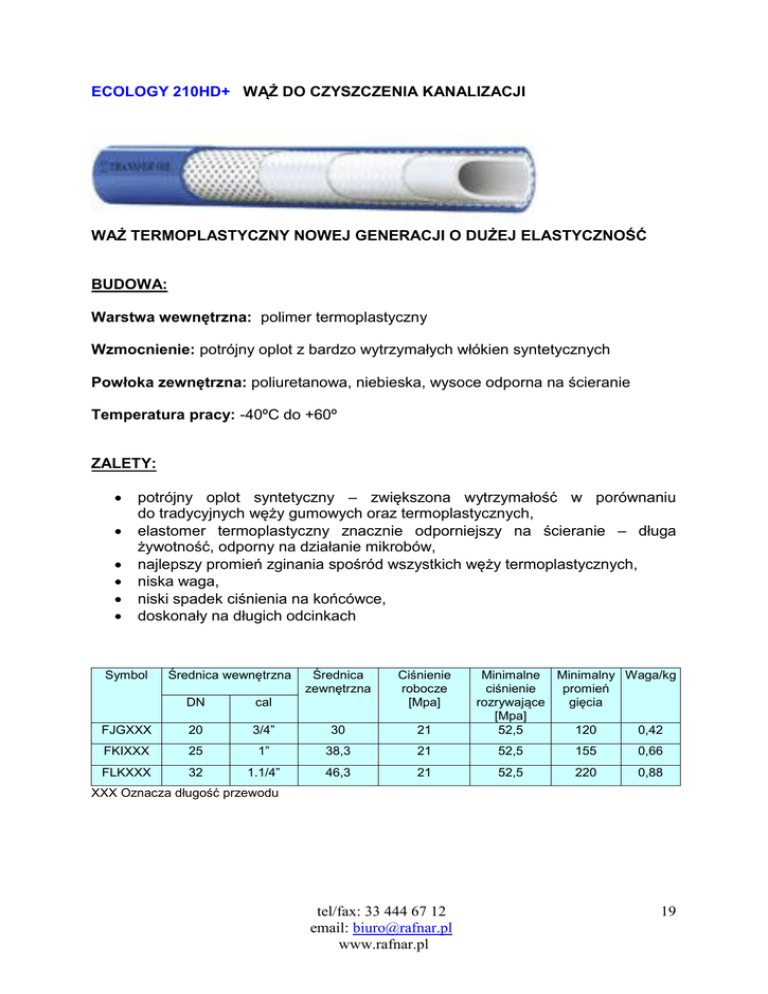 ECOLOGY 210HD+ WĄŻ DO CZYSZCZENIA KANALIZACJI WAŻ TERMOPLASTYCZNY NOWEJ GENERACJI O DUŻEJ ELASTYCZNOŚĆ BUDOWA: Warstwa wewnętrzna: polimer termoplastyczny Wzmocnienie: potrójny oplot z bardzo wytrzymałych włókien syntetycznych Powłoka zewnętrzna: poliuretanowa, niebieska, wysoce odporna na ścieranie Temperatura pracy: -40ºC do +60º ZALETY: potrójny oplot syntetyczny – zwiększona wytrzymałość w porównaniu do tradycyjnych węży gumowych oraz termoplastycznych, elastomer termoplastyczny znacznie odporniejszy na ścieranie – długa żywotność, odporny na działanie mikrobów, najlepszy promień zginania spośród wszystkich węży termoplastycznych, niska waga, niski spadek ciśnienia na końcówce, doskonały na długich odcinkach Symbol Średnica wewnętrzna Średnica zewnętrzna Ciśnienie robocze [Mpa] Minimalne Minimalny Waga/kg ciśnienie promień rozrywające gięcia [Mpa] 52,5 120 0,42 DN cal FJGXXX 20 3/4” 30 21 FKIXXX 25 1” 38,3 21 52,5 155 0,66 FLKXXX 32 1.1/4” 46,3 21 52,5 220 0,88 XXX Oznacza długość przewodu tel/fax: 33 444 67 12 email: [email protected] www.rafnar.pl 19 ECOLOGY 250HD+ WĄŻ DO CZYSZCZENIA KANALIZACJI WAŻ TERMOPLASTYCZNY NOWEJ GENERACJI O DUŻEJ ELASTYCZNOŚĆ BUDOWA: Warstwa wewnętrzna: polimer termoplastyczny Wzmocnienie: podwójny oplot aramidowy (kevlar) + dodatkowy oplot z włókien syntetycznych Powłoka zewnętrzna: poliuretanowa, czerwona, wysoce odporna na ścieranie Temperatura pracy: -40ºC do +60º ZALETY: podwójny oplot aramidowy + 1 oplot syntetyczny – zwiększona wytrzymałość w porównaniu do tradycyjnych węży gumowych oraz termoplastycznych, elastomer termoplastyczny znacznie odporniejszy na ścieranie – długa żywotność, odporny na działanie mikrobów, najlepszy promień zginania spośród wszystkich węży termoplastycznych, niska waga, niski spadek ciśnienia na końcówce, doskonały na długich odcinkach Symbol Średnica wewnętrzna Średnica zewnętrzna Ciśnienie robocze [Mpa] Minimalne Minimalny Waga/kg ciśnienie promień rozrywające gięcia [Mpa] 62,5 75 0,28 DN cal FMEXXX 12 1/2 22,3 25 FNGXXX 20 3/4” 30 25 62,5 120 0,36 FOIXXX 25 1” 38,3 25 62,5 155 0,58 FPKXXX 32 1.1/4” 46,3 25 62,5 220 0,84 XXX Oznacza długość przewodu tel/fax: 33 444 67 12 email: [email protected] www.rafnar.pl 20 ECOLOGY 200EL+ WĄŻ DO CZYSZCZENIA KANALIZACJI WAŻ TERMOPLASTYCZNY NOWEJ GENERACJI O DUŻEJ ELASTYCZNOŚĆ BUDOWA: Warstwa wewnętrzna: polimer termoplastyczny Wzmocnienie: podwójny oplot z bardzo wytrzymałych włókien syntetycznych Powłoka zewnętrzna: poliuretanowa, pomarańczowa, wysoce odporna na ścieranie Temperatura pracy: -40ºC do +60º ZALETY: podwójny oplot syntetyczny – zwiększona wytrzymałość w porównaniu do tradycyjnych węży gumowych oraz termoplastycznych, elastomer termoplastyczny znacznie odporniejszy na ścieranie – długa żywotność, odporny na działanie mikrobów, najlepszy promień zginania spośród wszystkich węży termoplastycznych, niska waga, niski spadek ciśnienia na końcówce, doskonały na długich odcinkach Symbol Średnica wewnętrzna DN cal Średnica zewnętrzna Ciśnienie robocze [Mpa] Minimalne Minimalny Waga/kg ciśnienie promień rozrywające gięcia [Mpa] 50 75 0,28 FEEXXX 12 1/2" 21,8 20 FFGXXX-2 16 5/8” 26 20 50 100 0,38 FFGXXX 20 3/4” 29,6 20 50 120 0,44 FGIXXX 25 1” 37,2 20 50 155 0,64 FHKXXX 32 1.1/4” 45,6 20 50 220 0,89 XXX Oznacza długość przewodu tel/fax: 33 444 67 12 email: [email protected] www.rafnar.pl 21 tel/fax: 33 444 67 12 email: [email protected] www.rafnar.pl 22 tel/fax: 33 444 67 12 email: [email protected] www.rafnar.pl 23