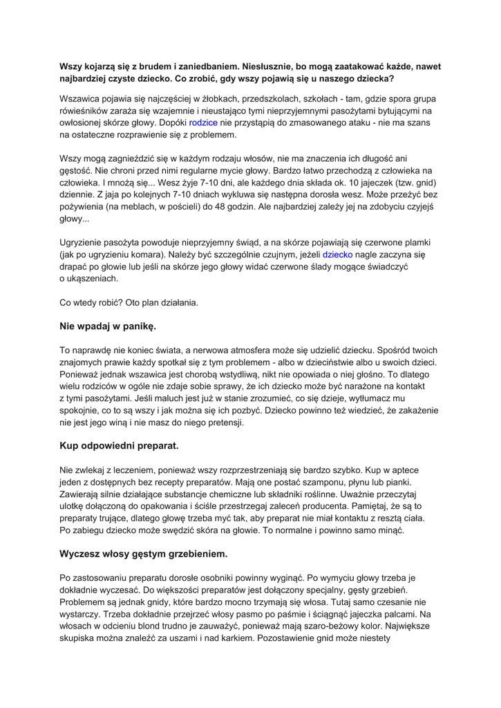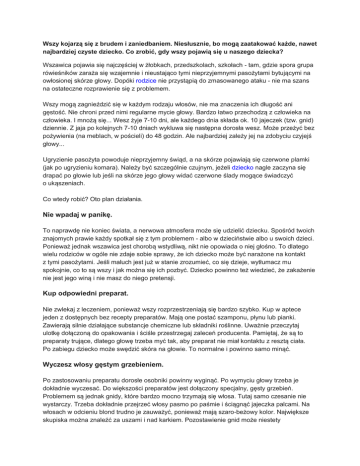 Wszy kojarzą się z brudem i zaniedbaniem. Niesłusznie, bo mogą zaatakować każde, nawet najbardziej czyste dziecko. Co zrobić, gdy wszy pojawią się u naszego dziecka? Wszawica pojawia się najczęściej w żłobkach, przedszkolach, szkołach - tam, gdzie spora grupa rówieśników zaraża się wzajemnie i nieustająco tymi nieprzyjemnymi pasożytami bytującymi na owłosionej skórze głowy. Dopóki rodzice nie przystąpią do zmasowanego ataku - nie ma szans na ostateczne rozprawienie się z problemem. Wszy mogą zagnieździć się w każdym rodzaju włosów, nie ma znaczenia ich długość ani gęstość. Nie chroni przed nimi regularne mycie głowy. Bardzo łatwo przechodzą z człowieka na człowieka. I mnożą się... Wesz żyje 7-10 dni, ale każdego dnia składa ok. 10 jajeczek (tzw. gnid) dziennie. Z jaja po kolejnych 7-10 dniach wykluwa się następna dorosła wesz. Może przeżyć bez pożywienia (na meblach, w pościeli) do 48 godzin. Ale najbardziej zależy jej na zdobyciu czyjejś głowy... Ugryzienie pasożyta powoduje nieprzyjemny świąd, a na skórze pojawiają się czerwone plamki (jak po ugryzieniu komara). Należy być szczególnie czujnym, jeżeli dziecko nagle zaczyna się drapać po głowie lub jeśli na skórze jego głowy widać czerwone ślady mogące świadczyć o ukąszeniach. Co wtedy robić? Oto plan działania. Nie wpadaj w panikę. To naprawdę nie koniec świata, a nerwowa atmosfera może się udzielić dziecku. Spośród twoich znajomych prawie każdy spotkał się z tym problemem - albo w dzieciństwie albo u swoich dzieci. Ponieważ jednak wszawica jest chorobą wstydliwą, nikt nie opowiada o niej głośno. To dlatego wielu rodziców w ogóle nie zdaje sobie sprawy, że ich dziecko może być narażone na kontakt z tymi pasożytami. Jeśli maluch jest już w stanie zrozumieć, co się dzieje, wytłumacz mu spokojnie, co to są wszy i jak można się ich pozbyć. Dziecko powinno też wiedzieć, że zakażenie nie jest jego winą i nie masz do niego pretensji. Kup odpowiedni preparat. Nie zwlekaj z leczeniem, ponieważ wszy rozprzestrzeniają się bardzo szybko. Kup w aptece jeden z dostępnych bez recepty preparatów. Mają one postać szamponu, płynu lub pianki. Zawierają silnie działające substancje chemiczne lub składniki roślinne. Uważnie przeczytaj ulotkę dołączoną do opakowania i ściśle przestrzegaj zaleceń producenta. Pamiętaj, że są to preparaty trujące, dlatego głowę trzeba myć tak, aby preparat nie miał kontaktu z resztą ciała. Po zabiegu dziecko może swędzić skóra na głowie. To normalne i powinno samo minąć. Wyczesz włosy gęstym grzebieniem. Po zastosowaniu preparatu dorosłe osobniki powinny wyginąć. Po wymyciu głowy trzeba je dokładnie wyczesać. Do większości preparatów jest dołączony specjalny, gęsty grzebień. Problemem są jednak gnidy, które bardzo mocno trzymają się włosa. Tutaj samo czesanie nie wystarczy. Trzeba dokładnie przejrzeć włosy pasmo po paśmie i ściągnąć jajeczka palcami. Na włosach w odcieniu blond trudno je zauważyć, ponieważ mają szaro-beżowy kolor. Największe skupiska można znaleźć za uszami i nad karkiem. Pozostawienie gnid może niestety spowodować nawrót choroby. Ponieważ wyczesywanie jest pracochłonne i wymaga dużo cierpliwości ze strony dziecka, na ogół konieczne jest skrócenie włosów. Oglądaj regularnie głowę dziecka. Trzeba to robić co wieczór przez 10 dni. Jeżeli po tym czasie nie zauważysz żadnego nowego pasożyta, problem został rozwiązany. Jeśli znajdziesz gnidy, zwróć uwagę, gdzie dokładnie są umiejscowione. Wesz składa jaja tuż przy skórze głowy; wraz ze wzrostem włosa gnidy odsuwają się coraz bardziej od skóry głowy. Jeżeli zauważysz jaja np. centymetr od głowy, jest to najprawdopodobniej ślad po starym zakażeniu, który wcześniej przeoczyłaś. Jeśli jednak gnida znajduje się tuż przy głowie, to znaczy, że dziecko ma nawrót infekcji. Ponieważ nawroty zdarzają się często, warto z oglądania głowy malucha zrobić pewien rytuał. Im szybciej zauważysz objawy zakażenia, tym łatwiej będzie je zlikwidować. Sprawdź całą rodzinę. Niestety wszami bardzo łatwo się zarazić. Jeśli zakażone jest dziecko, dokładnego obejrzenia i ewentualnego leczenia wymagają głowy całej rodziny. Powinnaś także ostrzec rodziców dzieci, z którymi spotyka się twój maluch oraz opowiedzieć o problemie w przedszkolu. Wielu rodziców wstydzi się tego, ale często właśnie dlatego problem ciągnie się miesiącami. Jeśli choć jedno dziecko będzie miało pasożyty, inne będą się ciągle od niego na nowo zarażać i cała kuracja straci sens. Posprzątaj dokładnie mieszkanie. Zbierz wszystko z czym dziecko miało kontakt (ubrania, pościel, ręcznik, narzutę na łóżku) i wypierz w temperaturze co najmniej 60 stopni. Jeśli to możliwe dodatkowo wysusz wszystko w suszarce lub wyprasuj gorącym żelazkiem. Upierz także ulubione pluszaki malucha. Rzeczy, których nie można prać, dokładnie odkurz. Wyczyść kanapy, fotele, dywany, fotele w samochodzie. Po takich porządkach torebkę z odkurzacza włóż do torby plastikowej, zawiąż ją i dopiero wtedy wyrzuć. W gorącej wodzie starannie umyj szczotki do włosów i grzebienie. Rzeczy, których nie można uprać ani porządnie wyczyścić, włóż do plastikowego worka, zawiąż go dokładnie i schowaj na dwa tygodnie, tak aby przed ich ponownym użyciem minął cały cykl rozmnażania wszy. Kiedy do lekarza? W większości przypadków wszy można zwalczyć w domu i choć jest to pracochłonne, nie wymaga wizyty u lekarza. Konsultacji wymagają sytuacje, gdy: zakażone jest dziecko, które nie skończyło jeszcze dwóch lat; dziecko ma alergię lub astmę; wszy pojawiają się w brwiach lub rzęsach; zakażona jest wszami (lub musi je zwalczać u dziecka) kobieta w ciąży lub karmiąca piersią. W takim wypadku lekarz może zaleci