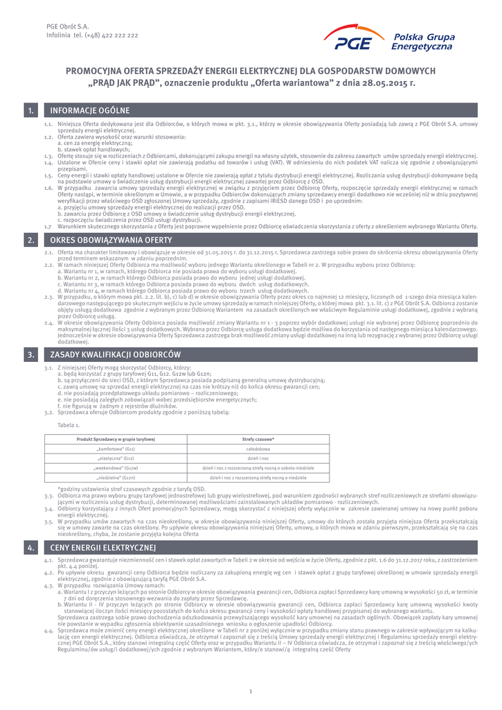 PGE Obrót S.A. Infolinia tel. (+48) 422 222 222 PROMOCYJNA OFERTA SPRZEDAŻY ENERGII ELEKTRYCZNEJ DLA GOSPODARSTW DOMOWYCH „PRĄD JAK PRĄD”, oznaczenie produktu „Oferta wariantowa” z dnia 28.05.2015 r. 1. INFORMACJE OGÓLNE 1.1. Niniejsza Oferta dedykowana jest dla Odbiorców, o których mowa w pkt. 3.1., którzy w okresie obowiązywania Oferty posiadają lub zawrą z PGE Obrót S.A. umowy sprzedaży energii elektrycznej. 1.2. Oferta zawiera wysokość oraz warunki stosowania: a. cen za energię elektryczną; b. stawek opłat handlowych; 1.3. Ofertę stosuje się w rozliczeniach z Odbiorcami, dokonującymi zakupu energii na własny użytek, stosownie do zakresu zawartych umów sprzedaży energii elektrycznej. 1.4. Ustalone w Ofercie ceny i stawki opłat nie zawierają podatku od towarów i usług (VAT). W odniesieniu do nich podatek VAT nalicza się zgodnie z obowiązującymi przepisami. 1.5. Ceny energii i stawki opłaty handlowej ustalone w Ofercie nie zawierają opłat z tytułu dystrybucji energii elektrycznej. Rozliczania usług dystrybucji dokonywane będą na podstawie umowy o świadczenie usług dystrybucji energii elektrycznej zawartej przez Odbiorcę z OSD. 1.6. W przypadku zawarcia umowy sprzedaży energii elektrycznej w związku z przyjęciem przez Odbiorcę Oferty, rozpoczęcie sprzedaży energii elektrycznej w ramach Oferty nastąpi, w terminie określonym w Umowie, a w przypadku Odbiorców dokonujących zmiany sprzedawcy energii dodatkowo nie wcześniej niż w dniu pozytywnej weryfikacji przez właściwego OSD zgłoszonej Umowy sprzedaży, zgodnie z zapisami IRiESD danego OSD i po uprzednim: a. przyjęciu umowy sprzedaży energii elektrycznej do realizacji przez OSD. b. zawarciu przez Odbiorcę z OSD umowy o świadczenie usług dystrybucji energii elektrycznej. c. rozpoczęciu świadczenia przez OSD usługi dystrybucji. 1.7 Warunkiem skutecznego skorzystania z Oferty jest poprawne wypełnienie przez Odbiorcę oświadczenia skorzystania z oferty z określeniem wybranego Wariantu Oferty. 2. OKRES OBOWIĄZYWANIA OFERTY 2.1. Oferta ma charakter limitowany i obowiązuje w okresie od 31.05.2015 r. do 31.12.2015 r. Sprzedawca zastrzega sobie prawo do skrócenia okresu obowiązywania Oferty przed terminem wskazanym w zdaniu poprzednim. 2.2. W ramach niniejszej Oferty Odbiorca ma możliwość wyboru jednego Wariantu określonego w Tabeli nr 2. W przypadku wyboru przez Odbiorcę: a. Wariantu nr 1, w ramach, którego Odbiorca nie posiada prawa do wyboru usługi dodatkowej. b. Wariantu nr 2, w ramach którego Odbiorca posiada prawo do wyboru jednej usługi dodatkowej. c. Wariantu nr 3, w ramach którego Odbiorca posiada prawo do wyboru dwóch usług dodatkowych. d. Wariantu nr 4, w ramach którego Odbiorca posiada prawo do wyboru trzech usług dodatkowych. 2.3. W przypadku, o którym mowa pkt. 2.2. lit. b), c) lub d) w okresie obowiązywania Oferty przez okres co najmniej 12 miesięcy, liczonych od 1-szego dnia miesiąca kalendarzowego następującego po skutecznym wejściu w życie umowy sprzedaży w ramach niniejszej Oferty, o której mowa pkt. 3.1. lit. c) z PGE Obrót S.A. Odbiorca zostanie objęty usługą dodatkowa zgodnie z wybranym przez Odbiorcę Wariantem na zasadach określonych we właściwym Regulaminie usługi dodatkowej, zgodnie z wybraną przez Odbiorcę usługą. 2.4. W okresie obowiązywania Oferty Odbiorca posiada możliwość zmiany Wariantu nr 1 - 3 poprzez wybór dodatkowej usługi nie wybranej przez Odbiorcę poprzednio do maksymalnej łącznej ilości 3 usług dodatkowych. Wybrana przez Odbiorcę usługa dodatkowa będzie możliwa do korzystania od następnego miesiąca kalendarzowego. Jednocześnie w okresie obowiązywania Oferty Sprzedawca zastrzega brak możliwość zmiany usługi dodatkowej na inną lub rezygnację z wybranej przez Odbiorcę usługi dodatkowej. 3. ZASADY KWALIFIKACJI ODBIORCÓW 3.1. Z niniejszej Oferty mogą skorzystać Odbiorcy, którzy: a. będą korzystać z grupy taryfowej G11, G12. G12w lub G12n; b. są przyłączeni do sieci OSD, z którym Sprzedawca posiada podpisaną generalną umowę dystrybucyjną; c. zawrą umowę na sprzedaż energii elektrycznej na czas nie krótszy niż do końca okresu gwarancji cen; d. nie posiadają przedpłatowego układu pomiarowo – rozliczeniowego; e. nie posiadają zaległych zobowiązań wobec przedsiębiorstw energetycznych; f. nie figurują w żadnym z rejestrów dłużników. 3.2. Sprzedawca oferuje Odbiorcom produkty zgodnie z poniższą tabelą: Tabela 1. Produkt Sprzedawcy w grupie taryfowej Strefy czasowe* „komfortowa” (G11) całodobowa „elastyczna” (G12) dzień i noc „weekendowa” (G12w) dzień i noc z rozszerzoną strefą nocną o soboto-niedziele „niedzielna” (G12n) dzień i noc z rozszerzoną strefą nocną o niedziele *godziny ustawienia stref czasowych zgodnie z taryfą OSD. 3.3. Odbiorca ma prawo wyboru grupy taryfowej jednostrefowej lub grupy wielostrefowej, pod warunkiem zgodności wybranych stref rozliczeniowych ze strefami obowiązującymi w rozliczeniu usług dystrybucji, determinowanej możliwościami zainstalowanych układów pomiarowo - rozliczeniowych. 3.4. Odbiorcy korzystający z innych Ofert promocyjnych Sprzedawcy, mogą skorzystać z niniejszej oferty wyłącznie w zakresie zawieranej umowy na nowy punkt poboru energii elektrycznej. 3.5. W przypadku umów zawartych na czas nieokreślony, w okresie obowiązywania niniejszej Oferty, umowy do których została przyjęta niniejsza Oferta przekształcają się w umowy zawarte na czas określony. Po upływie okresu obowiązywania niniejszej Oferty, umowy, o których mowa w zdaniu pierwszym, przekształcają się na czas nieokreślony, chyba, że zostanie przyjęta kolejna Oferta 4. CENY ENERGII ELEKTRYCZNEJ 4.1. Sprzedawca gwarantuje niezmienność cen i stawek opłat zawartych w Tabeli 2 w okresie od wejścia w życie Oferty, zgodnie z pkt. 1.6 do 31.12.2017 roku, z zastrzeżeniem pkt. 4.4 poniżej. 4.2