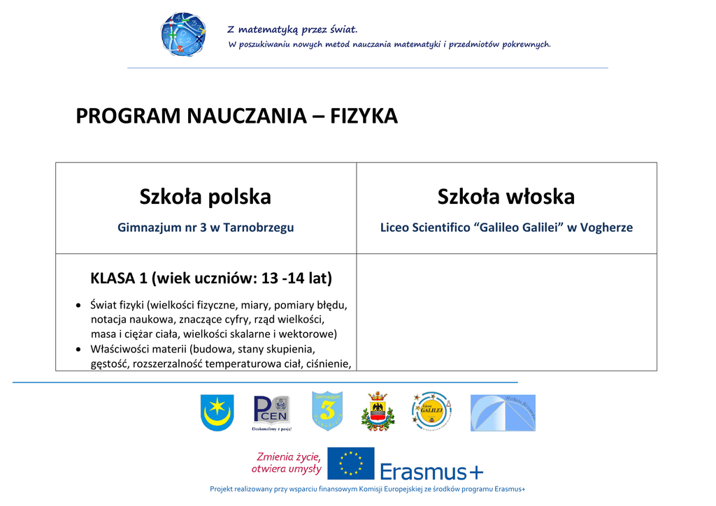 Z matematyką przez świat. W poszukiwaniu nowych metod nauczania matematyki i przedmiotów pokrewnych. PROGRAM NAUCZANIA – FIZYKA Szkoła polska Szkoła włoska Gimnazjum nr 3 w Tarnobrzegu Liceo Scientifico “Galileo Galilei” w Vogherze KLASA 1 (wiek uczniów: 13 -14 lat) Świat fizyki (wielkości fizyczne, miary, pomiary błędu, notacja naukowa, znaczące cyfry, rząd wielkości, masa i ciężar ciała, wielkości skalarne i wektorowe) Właściwości materii (budowa, stany skupienia, gęstość, rozszerzalność temperaturowa ciał, ciśnienie, Projekt realizowany przy wsparciu finansowym Komisji Europejskiej ze środków programu Erasmus+ Z matematyką przez świat. W poszukiwaniu nowych metod nauczania matematyki i przedmiotów pokrewnych. prawo Pascala i Archimedesa) KLASA 2 (wiek uczniów: 14 - 15 lat) Ruch i siły (ruch jednostajny prostoliniowy, opory ruchu, ruch jednostajnie przyspieszony prostoliniowy, spadanie swobodne, zasady dynamiki Energia mechaniczna (praca, moc, maszyny proste, energia kinetyczna i potencjalna, zasada zachowania energii) Ciepło Drgania i fale mechaniczne Optyka KLASA 2 (wiek uczniów: 14 - 15 lat) Wielkości fizyczne, miary, pomiary błędu Notacja naukowa, znaczące cyfry, rząd wielkości Wielkości skalarne i wektorowe Przedstawianie zasad fizycznych: wykresy, tabele, procenty, równania Siły jako wielkości wektorowe Ruch jednostajny prostoliniowy, ruch jednostajny przyspieszony Jednostajny ruch obrotowy, ruch harmoniczny Dynamika (I, II, III zasada) Siła i ruch (równia pochyła, ruch ukośny, siła dośrodkowa, wahadło proste) Projekt realizowany przy wsparciu finansowym Komisji Europejskiej ze środków programu Erasmus+ Z matematyką przez świat. W poszukiwaniu nowych metod nauczania matematyki i przedmiotów pokrewnych. KLASA 3 (wiek uczniów: 15 - 16 lat) Elektryczność i magnetyzm Fale elektromagnetyczne Przygotowanie do egzaminu KLASA 3 (wiek uczniów: 15 - 16 lat) Siły i równowaga (siła pędu, pary sił, środek ciężkości, maszyny proste, wytrzymałość) Równowaga płynów Zasady zachowania energii: energia kinetyczna, energia potencjalna, zachowanie energii mechanicznej, praca, siła Ciepło Fale i światło Projekt realizowany przy wsparciu finansowym Komisji Europejskiej ze środków programu Erasmus+