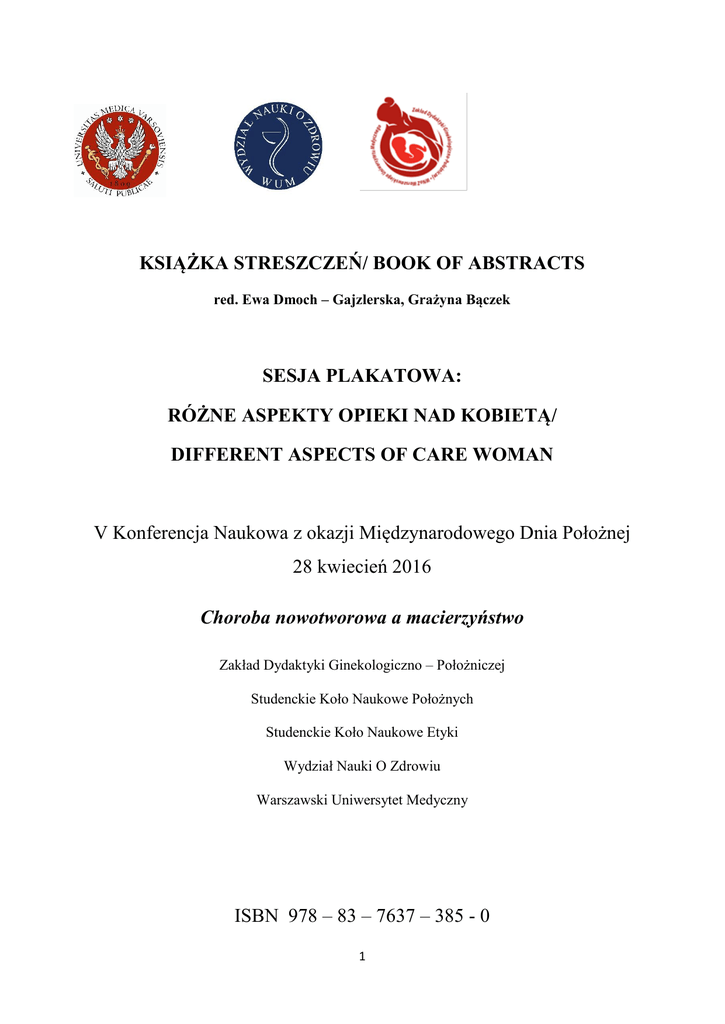 KSIĄŻKA STRESZCZEŃ/ BOOK OF ABSTRACTS red. Ewa Dmoch – Gajzlerska, Grażyna Bączek SESJA PLAKATOWA: RÓŻNE ASPEKTY OPIEKI NAD KOBIETĄ/ DIFFERENT ASPECTS OF CARE WOMAN V Konferencja Naukowa z okazji Międzynarodowego Dnia Położnej 28 kwiecień 2016 Choroba nowotworowa a macierzyństwo Zakład Dydaktyki Ginekologiczno – Położniczej Studenckie Koło Naukowe Położnych Studenckie Koło Naukowe Etyki Wydział Nauki O Zdrowiu Warszawski Uniwersytet Medyczny ISBN 978 – 83 – 7637 – 385 - 0 1 SPIS TREŚCI 1. Banaszczyk M., Kociemska A., Rusinowska S., Bączek G. ……….……………3 2. Chomko G., Boruch A., Krychowska – Ćwikła A. ……………………………...4 3. Delimat A., Tokarska R. …………………………………………………………6 4. Dębska S., Szyszka M., Bączek G. ………………………………………………8 5. Dębska S., Werczyńska A. …………………………………………………...…10 6. Dykowska G. i wsp. ……………………………………………………………..11 7. Gabaja M., Madetko R., Mierzwa A. ……………………………………………14 8. Gaweł A., Przysucha J., Nowacka A. …………………………………………...16 9. Kameduła N., Olszewska, Bączek G. ……………………………………………18 10. Kozłowska, Bentkowska, Baczek G. …………………………………………….19 11. Lauk J., Rudnicka M., Szczepaniak R., Baczek G. ………………………………20 12. Majka A., Karpik M., Baczek G. …………………………………………………22 13. Mazur D., Bączek G. ……………………………………………………………..23 14. Michalewicz M., Rasińska R. …………………………………………………….24 15. Misztal A., Bączek G. …………………………………………………………....26 16. Misztal A., Baczek G. ……………………………………………………………28 17. Mrożek A., Sierzan M., Mazurkiewicz B., Stefaniak M. ………………………..30 18. Niedźwiedzka O., Wydra A., Nowacka A. ……………………………………...33 19. Niemyjska A., Miłek M., Baczek G. ……………………………………………..34 20. Olek K., Milewska E., Madetko R. ………………………………………………36 21. Padzik M., Kozakiewicz B. ………………………………………………………38 22. Sierzan M., Prachnio K., Mazurkiewicz B. ………………………………………40 23. Walewska D., Bączek G. …………………………………………………………42 24. Walewska D., Bączek G. …………………………………………………………43 25. Wiśniewska P., Stefaniak M., Mazurkiewicz B. …………………………………45 26. Rabiej M. ………...……………………………………………………………….46 2 1. Autorzy: Banaszczyk Małgorzata, Kociemska Agnieszka, Rusinowska Sylwia, Bączek Grażyna Tytuł: Ocena wiedzy środowiska medycznego na temat nowotworów narządu rodnego kobiety. Assessment of knowledge of the medical community about cancer of reproductive organs women. Afiliacja: Studenckie Koło Naukowe Położnych, Zakład Dydaktyki Ginekologiczno – Położniczej, kierownik med. dr med. n. med. Ewa Dmoch – Gajzlerska, Warszawski Uniwersytet Medyczny Cel pracy: Celem pracy było sprawdzenie wiedzy personelu medycznego na temat nowotworów narządu rodnego kobiety. Materiał i metody: Aby uzyskać dane dotyczące poziomu wiedzy wykorzystano metodę sondażu diagnostycznego, rozesłane zostały anonimowe ankiety na forach internetowych. Narzędziem badawczym był kwestionariusz ankiety własnej konstrukcji. Składał się on z 25 pytań: 21 pytań dotyczących tematu pracy i 4 pytań metryczkowych. Wyniki: Analizując wyniki pracy zaobserwować można, że położne prezentują wyższy poziom wiedzy w porównaniu z pielęgniarkami, lekarze prezentują nieznacznie wyższy poziom wiedzy niż położne, studenci prezentują wyższy poziom wiedzy w porównaniu z grupą pielęgniarek. Wnioski: Należy podjąć działania zmniejszające deficyt wiedzy całego personelu medycznego, również studentów poprzez wprowadzenie szkoleń dla personelu medycznego z zakresu nowotworów narządu rodnego kobiety oraz opieki nad kobietą z takim schorzeniem. Wskazane byłyby kursy doszkalające dla lekarzy, pielęgniarek i położnych z dziedziny nowotworów narządów rodnych kobiety oraz rozszerzenie programu ksztalcenia studentów z zakresu onkologii narządu rodnego kobiety. *** 3 Aim: The aim of the study was to test the knowledge of medical personnel on the cancer of reproductive organs women. Material and method: To obtain data on the level of knowledge, method of diagnostic survey were sent questionnaires on Internet forums. The research tool was a questionnaire of our own design. It consisted of 25 questions: 21 questions on the subject of work and 4 demographic questions. Results: Analysing the results of the work can be observed that midwives represent a higher level of knowledge in comparison with nurses, doctors represent a higher level of knowledge than midwives, students represent a higher level of knowledge compared with a group of nurses. Conclusions: Measures should be taken to reduce the deficit of knowledge of the entire medical staff, including students.It would be the introduction of training for medical personnel in the field of gynecological cancers and women caring for a woman with this disease. Introduce training courses for doctors, nurses and midwives in the field of women's genital tract cancers, and increased attention to the education of students in the field of gynecological oncology women. 2. Autorzy: Chomko Gabriela, Boruch Anna, Krychowska – Ćwikła Alina, Tytuł: Seksualność kobiety ciężarnej - wpływ czynników demograficznych The Se