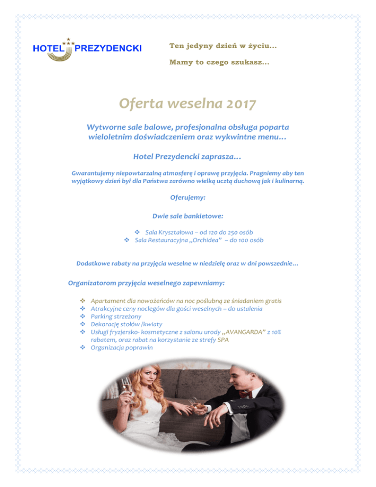 Ten jedyny dzień w życiu… Mamy to czego szukasz… Oferta weselna 2017 Wytworne sale balowe, profesjonalna obsługa poparta wieloletnim doświadczeniem oraz wykwintne menu… Hotel Prezydencki zaprasza… Gwarantujemy niepowtarzalną atmosferę i oprawę przyjęcia. Pragniemy aby ten wyjątkowy dzień był dla Państwa zarówno wielką ucztą duchową jak i kulinarną. Oferujemy: Dwie sale bankietowe: Sala Kryształowa – od 120 do 250 osób Sala Restauracyjna „Orchidea” – do 100 osób Dodatkowe rabaty na przyjęcia weselne w niedzielę oraz w dni powszednie… Organizatorom przyjęcia weselnego zapewniamy: Apartament dla nowożeńców na noc poślubną ze śniadaniem gratis Atrakcyjne ceny noclegów dla gości weselnych – do ustalenia Parking strzeżony Dekorację stołów /kwiaty Usługi fryzjersko- kosmetyczne z salonu urody „AVANGARDA” z 10% rabatem, oraz rabat na korzystanie ze strefy SPA Organizacja poprawin Ten jedyny dzień w życiu… Mamy to czego szukasz… PROPOZYCJA MENU PRZYJĘCIA WESELNEGO Przywitanie Państwa Młodych chlebem i solą. Na początek: Wino musujące 1 lamp/os Obiad: ZUPY ( jedna porcja do wyboru): Bulion bursztynowy z kluseczkami cielęcymi z kolendrą Krem paprykowo-pomidorowy z nutą ricotty Krem z borowików z grzankami Zupa cebulowa z grzankami serowymi Zupa-krem ze szparagów z chipsem z szynki parmeńskiej i prażonymi migdałami DANIE GŁÓWNE (jedna propozycja do wyboru): Duet mięs /sakiewka ze schabu z warzywami, rolada z indyka z ziołami/z sosem podany z ziemniakami z koperkiem i zestawem surówek Polędwiczki wieprzowe faszerowane grzybami na ragout warzywnym podawane z ziemniakami Soczysty filet drobiowy w szynce parmeńskiej zanurzony w pesto podany z zapiekanką ziemniaczaną Roladki fantazyjne ze schabu z szynką i boczkiem oraz z aksamitnym sosem podawane z ziemniakami i gotowanymi warzywami Pieczony filet z kurczaka ze szpinakiem i pomidorami suszonymi zapiekany z mozzarellą podawany z ziemniakami i sałatką z pomidorów DESER LUB TORT WESELNY (do wyboru) Rolada lodowa z owocami i bitą śmietaną Gruszka z lodami straciatella w sosie kawowym Lody waniliowe w gorącym sosie truskawkowym Panna cotta z musem z leśnych owoców Sernik Prezydencki z sosem malinowym Ten jedyny dzień w życiu… Mamy to czego szukasz… KOLACJA GORĄCA I (do wyboru) Eskalopki z kurczaka w sosie słodko-kwaśnym podane z kluseczkami kładzionymi i sałatką wykwintną Kotlet górski z ogórkiem podany z ziemniakami i zestawem surówek Medalion „Cordon-Bleu”, ziemniaki opiekane, sałatka młodości Pieczeń wieprzowa z sosem myśliwskim podawana z kopytkami i kapustą zasmażaną Pierś z kurczaka z plastrem selera i pomidora zapiekane z serem podane z frytkami i sałatką wielowarzywną KOLACJA GORĄCAII (do wyboru) Zupa gulaszowa – bogracz podawana z pieczywem Forszmak z drobiu podawany z pieczywem Lasagna z mięsem lub wegetariańska KOLACJA GORĄCA III (do wyboru) Barszczyk czerwony z dodatkami - krokiet z mięsem - pieróg półfrancuski mięsny lub z kapustą - krokiet mięsny Żurek „Po Rzeszowsku” z jajkiem i kiełbasą Bulion z kołdunami ZAKĄSKI ZIMNE Śledź w oleju wg. polskiej tradycji z cebulą i jabłkami Wybór mięs pieczonych Wybór wędlin podkarpackich Mini galaretka z drobiu Zawijaniec drobiowy Rulon z szynki z sałatką Rulon z szynki z kremem chrzanowym Sos chrzanowy Pieczywo, masło SAŁATKI ( 100g/os ) 2 porcje do wyboru: Sałatka grecka Sałatka z brokułami Sałatka z paluszkami krabowymi Sałatka z selera z ananasem Ten jedyny dzień w życiu… Mamy to czego szukasz… Sałatka tradycyjna jarzynowa Sałatka Caprese Sałatka z pieczarkami i pietruszką NAPOJE ZIMNE I GORĄCE Kawa, herbata Soki owocowe Woda mineralna (gazowana i niegazowana) Coca-cola, Sprite, Fanta DESER, OWOCE Tort weselny lub deser po obiedzie Owoce Ciasto weselne w cenie 10 dkg/os 20 dkg/os Liczbę osób branych pod uwagę po ostatecznej kalkulacji cenowej należy podać 7 dni przed terminem przyjęcia weselnego ISTNIEJE MOŻLIWOŚĆ ZŁOŻENIA DODATKOWYCH ZAMÓWIEŃ: Szyszka (1szt./os) Wódka czysta Wyborowa 0,5 l Wódka czysta Finlandia 0,5 l Wino białe lub czerwone 0,75 l Stół staropolski (wg ustaleń), Stół szwedzki klasyczny (wg ustaleń) Stół rybny (wg ustaleń) Udziec wieprzowy z sosami serwowany przez kucharza (według ustaleń) Fontanna czekoladowa z owocami (według ustaleń) Przystawka zimna podana przed obiadem (według ustaleń) SERDECZNIE ZAPRASZAMY ! Rezerwacja terminów: 17 860 65 35 Hotel Prezydencki ****/ ul. Podwisłocze 48 (wjazd od al. Kopisto), 35-309 Rzeszów