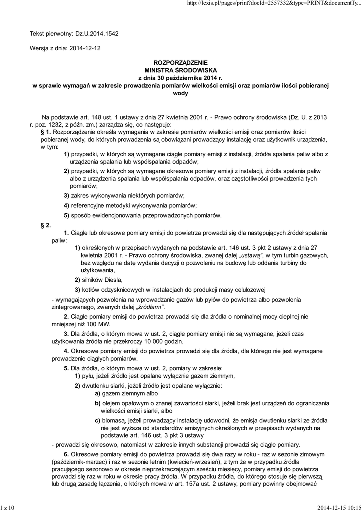 1 z 10 http://lexis.pl/pages/print?docId=2557332&type=PRINT&documentTy... Tekst pierwotny: Dz.U.2014.1542 Wersja z dnia: 2014-12-12 ROZPORZĄDZENIE MINISTRA ŚRODOWISKA z dnia 30 października 2014 r. w sprawie wymagań w zakresie prowadzenia pomiarów wielkości emisji oraz pomiarów ilości pobieranej wody Na podstawie art. 148 ust. 1 ustawy z dnia 27 kwietnia 2001 r. - Prawo ochrony środowiska (Dz. U. z 2013 r. poz. 1232, z późn. zm.) zarządza się, co następuje: § 1. Rozporządzenie określa wymagania w zakresie pomiarów wielkości emisji oraz pomiarów ilości pobieranej wody, do których prowadzenia są obowiązani prowadzący instalację oraz użytkownik urządzenia, w tym: 1) przypadki, w których są wymagane ciągłe pomiary emisji z instalacji, źródła spalania paliw albo z urządzenia spalania lub współspalania odpadów; 2) przypadki, w których są wymagane okresowe pomiary emisji z instalacji, źródła spalania paliw albo z urządzenia spalania lub współspalania odpadów, oraz częstotliwości prowadzenia tych pomiarów; 3) zakres wykonywania niektórych pomiarów; 4) referencyjne metodyki wykonywania pomiarów; 5) sposób ewidencjonowania przeprowadzonych pomiarów. § 2. 1. Ciągłe lub okresowe pomiary emisji do powietrza prowadzi się dla następujących źródeł spalania paliw: 1) określonych w przepisach wydanych na podstawie art. 146 ust. 3 pkt 2 ustawy z dnia 27 kwietnia 2001 r. - Prawo ochrony środowiska, zwanej dalej „ustawą”, w tym turbin gazowych, bez względu na datę wydania decyzji o pozwoleniu na budowę lub oddania turbiny do użytkowania, 2) silników Diesla, 3) kotłów odzysknicowych w instalacjach do produkcji masy celulozowej - wymagających pozwolenia na wprowadzanie gazów lub pyłów do powietrza albo pozwolenia zintegrowanego, zwanych dalej „źródłami”. 2. Ciągłe pomiary emisji do powietrza prowadzi się dla źródła o nominalnej mocy cieplnej nie mniejszej niż 100 MW. 3. Dla źródła, o którym mowa w ust. 2, ciągłe pomiary emisji nie są wymagane, jeżeli czas użytkowania źródła nie przekroczy 10 000 godzin. 4. Okresowe pomiary emisji do powietrza prowadzi się dla źródła, dla którego nie jest wymagane prowadzenie ciągłych pomiarów. 5. Dla źródła, o którym mowa w ust. 2, pomiary w zakresie: 1) pyłu, jeżeli źródło jest opalane wyłącznie gazem ziemnym, 2) dwutlenku siarki, jeżeli źródło jest opalane wyłącznie: a) gazem ziemnym albo b) olejem opałowym o znanej zawartości siarki, jeżeli brak jest urządzeń do ograniczania wielkości emisji siarki, albo c) biomasą, jeżeli prowadzący instalację udowodni, że emisja dwutlenku siarki ze źródła nie jest wyższa od standardów emisyjnych określonych w przepisach wydanych na podstawie art. 146 ust. 3 pkt 3 ustawy - prowadzi się okresowo, natomiast w zakresie innych substancji prowadzi się ciągłe pomiary. 6. Okresowe pomiary emisji do powietrza prowadzi się dwa razy w roku - raz w sezonie zimowym (październik-marzec) i raz w sezonie letnim (kwiecień-wrzesień), z tym że w przypadku źródła pracującego sezonowo w okresie nieprzekraczającym sześciu miesięcy, pomiary emisji do powietrza prowadzi się raz w roku w okresie pracy źródła. W przypadku źródła, do którego stosuje się pierwszą lub drugą zasadę łączenia, o których mowa w art. 157a ust. 2 ustawy, pomiary powinny obejmować 2014-12-15 10:15 2 z 10 http://lexis.pl/pages/print?docId=2557332&type=PRINT&documentTy... emisję ze wszystkich części źródła pracujących w danym sezonie lub okresie. 7. Pomiary emisji rtęci do powietrza prowadzi się dla źródła o nominalnej mocy cieplnej nie mniejszej niż 50 MW, opalanego węglem kamiennym lub brunatnym, okresowo, co najmniej raz w roku. 8. W przypadku źródła, do którego stosuje się pierwszą lub drugą zasadę łączenia, o których mowa w art. 157a ust. 2 ustawy, nominalnej mocy cieplnej źródła odpowiada całkowita nominalna moc cieplna tego źródła. § 3. 1. Ciągłe i okresowe pomiary emisji do powietrza prowadzi się dla instalacji i urządzeń spalania lub współspalania odpadów, w zależności od rodzaju substancji lub parametru określonych w załączniku, o którym mowa w § 11 ust. 1 pkt 3. 2. Okresowe pomiary emisji do powietrza, o których mowa w ust. 1, prowadzi się co najmniej raz na sześć miesięcy, a przez pierwszy rok eksploatacji instalacji i urządzenia spalania lub współspalania odpadów - co najmniej raz na trzy miesiące. 3. Zamiast ciągłych pomiarów emisji do powietrza, o których mowa w ust. 1, mogą być prowadzone okresowe pomiary emisji do powietrza z częstotliwością określoną w ust. 2: 1) w przypadku chlorowodoru lub dwutlenku siarki - jeżeli prowadzący instalację albo użytkownik urządzenia spalania lub współspalania odpadów może wykazać, że emisje chlorowodoru lub dwutlenku siarki w żadnych okolicznościach nie będą wyższe niż ich standardy emisyjne określone w przepisach wydanych na podstawie art. 146 ust. 3 pkt 3 i 4 ustawy; 2) w przypadku fluorowodoru: a) jeżeli prowadzący instalację albo użytkownik urządzenia spalania lub współspalania odpadów może wykazać, że emisja fluorowodoru w żadnych okolicznościach nie będzie wyższa niż standardy emisyjne tej substancji określone w przepisach wydanych na podstawie art. 146 ust. 3 pkt 3 i 4 ustawy lub b) jeżeli w wyniku neutralizacji chlorowodoru jest zapewnione dotrzymywanie standardu emisyjnego tej substancji określonego w przepisach wydanych na podstawie art. 146 ust. 3 pkt 3 i 4 ustawy; 3) w przypadku tlenków azotu rozumianych jako tlenek azotu i dwutlenek azotu w przeliczeniu na dwutlenek azotu - jeżeli prowadzący istniejącą instalację spalania lub współspalania odpadów lub użytkownik istniejącego urządzenia spalania lub współspalania odpadów, o zdolności przetwarzania poniżej 6 Mg odpadów na godzinę, może wykazać, że emisja tlenków azotu z tej i
