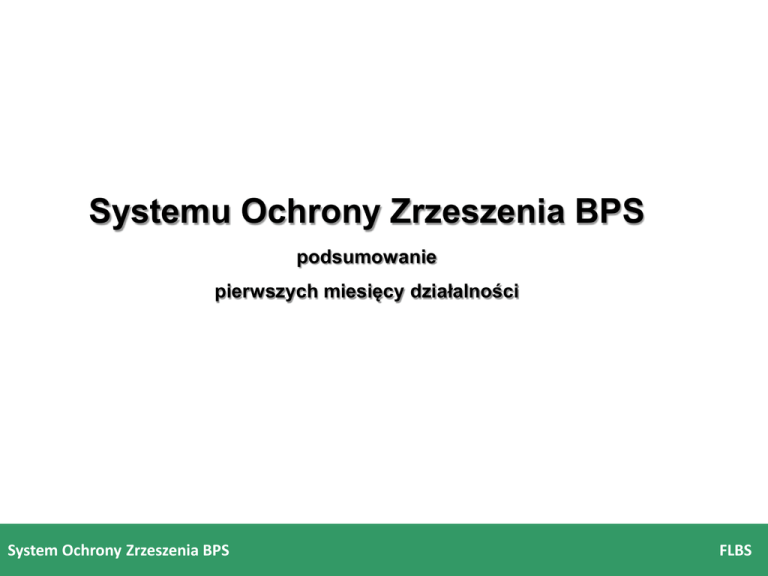 Systemu Ochrony Zrzeszenia BPS podsumowanie pierwszych miesięcy działalności System Ochrony Zrzeszenia BPS FLBS Stan obecny System Ochrony Zrzeszenia BPS został utworzony 31 grudnia 2015r. przez 241 banków spółdzielczych i Bank BPS S.A. W 2016 r. do Umowy Systemu Ochrony przystąpiły: 23 marca – 4 banki 13 maja – 4 banki 9 czerwca – 6 banków 27 czerwca – 4 banki 25 sierpnia – 8 banków System Ochrony Zrzeszenia BPS FLBS Stan obecny System Ochrony Zrzeszenia BPS na dzień 12 września 2016r. tworzą: 268 banków spółdzielczych i Bank BPS S.A. Łączne zagregowane aktywa Uczestników Systemu Ochrony Zrzeszenia BPS przekraczają kwotę 55,2 mld zł Planowane podpisanie Umowy: • do 30 września 2016 r. – 5 banków spółdzielczych • w trakcie procedowania pozostają 4 wnioski o przystąpienie do Systemu Ochrony System Ochrony Zrzeszenia BPS FLBS Jednostka Zarządzająca Zarządzanie systemem ochrony powierzone zostało: Spółdzielni Systemu Ochrony Zrzeszenia BPS Główne obszary działalności to: Monitorowanie ryzyka poszczególnych Uczestników oraz Systemu Ochrony jako całości Wykonywanie czynność audytu wewnętrznego Uczestników Wsparcie Uczestników w procesach restrukturyzacyjnych, w tym udzielanie pomocy finansowej System Ochrony Zrzeszenia BPS FLBS Wewnętrzny System Oceny Banków Oparty na ocenie punktowej w czterech obszarach: adekwatność kapitałowa, jakość aktywów, efektywność i płynność, w skali od 1 do 6 pkt. Wnioski: stała poprawa średniej oceny globalnej • 2,22 - na koniec 2015r. • 2,08 - na koniec I kwartału 2016r. • 2,05 - na koniec II kwartału 2016r. System Ochrony Zrzeszenia BPS FLBS Wewnętrzny System Oceny Banków Główny obszar poprawy oceny punktowej to: Adekwatność kapitałowa – wpływ zerowej wagi ryzyka dla ekspozycji wobec Uczestników Systemu Ochrony, szacowany wzrost całkowitego współczynnika wypłacalności o 1,5 p.p. ; System Ochrony Zrzeszenia BPS FLBS Mechanizm Pomocowy Systemu Ochrony Zrzeszenia BPS Mechanizm wsparcia płynności Oparty na środkach zgromadzonych na rachunkach Depozytów Obowiązkowych Uczestników w łącznej wysokości 3 472 mln zł Mechanizm wsparcia wypłacalności Oparty na Funduszu Zabezpieczającym, w którym zgromadzono środki o wartości 325 mln zł, z czego: • 29 mln zł stanowią wpłacone składki • 296 mln zł stanowi fundusz wkładów pieniężnych System Ochrony Zrzeszenia BPS FLBS Najbliższe wyzwania W Systemie Ochrony Zrzeszenia BPS rozpoczęto działania zmierzające do opracowania Grupowego Planu Naprawy obejmującego wszystkich Uczestników tj. banki spółdzielcze i bank zrzeszający System Ochrony Zrzeszenia BPS FLBS Dziękuję za uwagę System Ochrony Zrzeszenia BPS FLBS