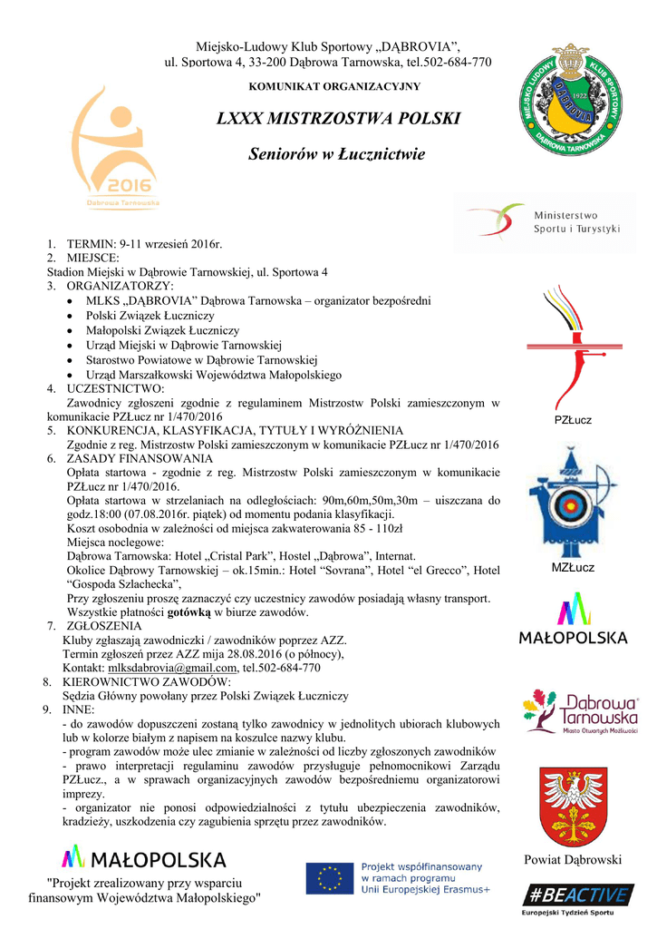 Miejsko-Ludowy Klub Sportowy „DĄBROVIA”, ul. Sportowa 4, 33-200 Dąbrowa Tarnowska, tel.502-684-770 KOMUNIKAT ORGANIZACYJNY LXXX MISTRZOSTWA POLSKI Seniorów w Łucznictwie 1. TERMIN: 9-11 wrzesień 2016r. 2. MIEJSCE: Stadion Miejski w Dąbrowie Tarnowskiej, ul. Sportowa 4 3. ORGANIZATORZY: MLKS „DĄBROVIA” Dąbrowa Tarnowska – organizator bezpośredni Polski Związek Łuczniczy Małopolski Związek Łuczniczy Urząd Miejski w Dąbrowie Tarnowskiej Starostwo Powiatowe w Dąbrowie Tarnowskiej Urząd Marszałkowski Województwa Małopolskiego 4. UCZESTNICTWO: Zawodnicy zgłoszeni zgodnie z regulaminem Mistrzostw Polski zamieszczonym w komunikacie PZŁucz nr 1/470/2016 5. KONKURENCJA, KLASYFIKACJA, TYTUŁY I WYRÓŻNIENIA Zgodnie z reg. Mistrzostw Polski zamieszczonym w komunikacie PZŁucz nr 1/470/2016 6. ZASADY FINANSOWANIA Opłata startowa - zgodnie z reg. Mistrzostw Polski zamieszczonym w komunikacie PZŁucz nr 1/470/2016. Opłata startowa w strzelaniach na odległościach: 90m,60m,50m,30m – uiszczana do godz.18:00 (07.08.2016r. piątek) od momentu podania klasyfikacji. Koszt osobodnia w zależności od miejsca zakwaterowania 85 - 110zł Miejsca noclegowe: Dąbrowa Tarnowska: Hotel „Cristal Park”, Hostel „Dąbrowa”, Internat. Okolice Dąbrowy Tarnowskiej – ok.15min.: Hotel “Sovrana”, Hotel “el Grecco”, Hotel “Gospoda Szlachecka”, Przy zgłoszeniu proszę zaznaczyć czy uczestnicy zawodów posiadają własny transport. Wszystkie płatności gotówką w biurze zawodów. 7. ZGŁOSZENIA Kluby zgłaszają zawodniczki / zawodników poprzez AZZ. Termin zgłoszeń przez AZZ mija 28.08.2016 (o północy), Kontakt: [email protected], tel.502-684-770 8. KIEROWNICTWO ZAWODÓW: Sędzia Główny powołany przez Polski Związek Łuczniczy 9. INNE: - do zawodów dopuszczeni zostaną tylko zawodnicy w jednolitych ubiorach klubowych lub w kolorze białym z napisem na koszulce nazwy klubu. - program zawodów może ulec zmianie w zależności od liczby zgłoszonych zawodników - prawo interpretacji regulaminu zawodów przysługuje pełnomocnikowi Zarządu PZŁucz., a w sprawach organizacyjnych zawodów bezpośredniemu organizatorowi imprezy. - organizator nie ponosi odpowiedzialności z tytułu ubezpieczenia zawodników, kradzieży, uszkodzenia czy zagubienia sprzętu przez zawodników. PZŁucz MZŁucz Powiat Dąbrowski "Projekt zrealizowany przy wsparciu finansowym Województwa Małopolskiego" Miejsko-Ludowy Klub Sportowy „DĄBROVIA”, ul. Sportowa 4, 33-200 Dąbrowa Tarnowska, tel.502-684-770 10. PROGRAM ZAWODÓW: Posiłki: 06:00-09:00 - śniadanie 12:00-15:00 - obiad 18:00-21:00 - kolacja 8 wrzesień 2016r. – czwartek 15.00-18.00 18.45 - nieoficjalny trening - odprawa techniczna dla kierowników ekip 9 wrzesień 2016r. - piątek 8.00 - otwarte tory 8:45 - strzelanie kwalifikacji - konkurencja WA1440: kobiety - odl. 70,60,50,30m, mężczyźni - odl. 90,70,50,30m 12:00 - oficjalne otwarcie Mistrzostw Polski 15.30 - strzelanie eliminacji w konkurencji drużynowej i mikstów (70m) 10 wrzesień 2016r. – sobota 8.00 8.45 12.00 12.40 13.10 13.30 13.45 13.30 13.45 15.45 16.00 - otwarte tory – 70m łuki klasyczne K i M - strzelania eliminacyjne konkurencji indywidualnej IORWA - strzelania finałowe o Tytuł Mistrza Polski na rok 2016 - strzelanie specjalne do sylwetki "kura" - dla medalistów Mistrzostw Polski - Uroczysta Dekoracja Mistrzów Polski – łuki klasyczne - 2 serie próbne w ramach otwartych torów: M-90m , K-60m - strzelania eliminacji w konkurencji drużynowej i indywidualnej 90m - mężczyźni, 60m – kobiety Oddzielne tory łucznicze - obok boiska głównego - łuki bloczkowe - otwarte tory – odl. 50m - strzelanie kwalifikacji na odl. 2 x 50m - 2 serie próbne w ramach otwartych torów - strzelanie eliminacji w konkurencji drużynowej i mikstów 11 wrzesień 2016 r. - niedziela 8.00 8.30 12.45 13.00 17:00 8.00 8:30 11.30 12.00 12:30 - otwarte tory – odl. 50m - łuki klasyczne - strzelanie eliminacji w konkurencji indywidualnej drużynowej i mikstów odl. 50m – łuki klasyczne - 2 serie próbne w ramach otwartych torów – odl. 30m - strzelanie eliminacji w konkurencji indywidualnej drużynowej i mikstów odl. 30m – łuki klasyczne - dekoracja medalistów na poszczególnych odległościach Oddzielne tory łucznicze - obok boiska głównego - łuki bloczkowe - otwarte tory 50m - strzelanie eliminacji w konkurencji indywidualnej - strzelania finałowe o Tytuł Mistrza Polski na rok 2016 - strzelanie specjalne do sylwetki "kura" - dla medalistów Mistrzostw Polski - Uroczysta Dekoracja Mistrzów Polski – łuki klasyczne UWAGA: W konkurencji indywidualnej na poszczególnych odległościach: mężczyźni - 90,50,30m, kobiety - 60,50,30m - do strzelań eliminacyjnych kwalifikują się 16 kobiety i 16 mężczyzn według rankingu wyników uzyskanych na poszczególnych odległościach w strzelaniu w dniu 9.09.2016. W konkurencji drużynowej i mikstów - zgodnie z regulaminem do 8 drużyn i 8 mikstów wg rankingu wyników uzyskanych na poszczególnych odległościach.