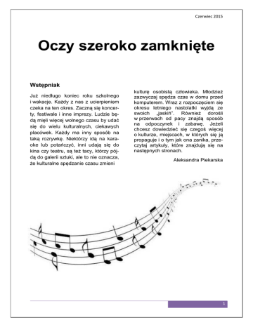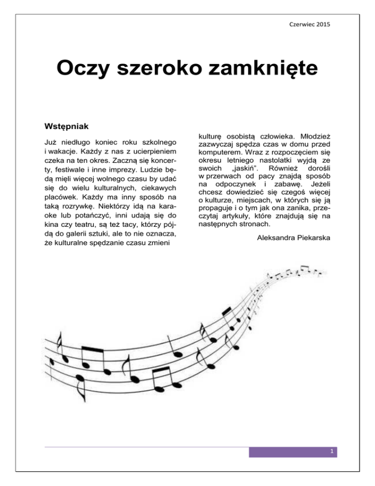 Czerwiec 2015 Oczy szeroko zamknięte Wstępniak Już niedługo koniec roku szkolnego i wakacje. Każdy z nas z ucierpieniem czeka na ten okres. Zaczną się koncerty, festiwale i inne imprezy. Ludzie będą mięli więcej wolnego czasu by udać się do wielu kulturalnych, ciekawych placówek. Każdy ma inny sposób na taką rozrywkę. Niektórzy idą na karaoke lub potańczyć, inni udają się do kina czy teatru, są też tacy, którzy pójdą do galerii sztuki, ale to nie oznacza, że kulturalne spędzanie czasu zmieni kulturę osobistą człowieka. Młodzież zazwyczaj spędza czas w domu przed komputerem. Wraz z rozpoczęciem się okresu letniego nastolatki wyjdą ze swoich „jaskiń”. Również dorośli w przerwach od pacy znajdą sposób na odpoczynek i zabawę. Jeżeli chcesz dowiedzieć się czegoś więcej o kulturze, miejscach, w których się ją propaguje i o tym jak ona zanika, przeczytaj artykuły, które znajdują się na następnych stronach. Aleksandra Piekarska 1 Oczy szeroko zamknięte Kultura czy karykatura? Kultura jest pojęciem bardzo elastycznym, które ma niezwykłą tendencję do transformacji. Wobec tych zmian w rozumowaniu tego zagadnienia nasuwa się pytanie, czym kultura jest dla nas dzisiaj? Niestety trzeba przyznać, że obserwujemy znaczne ograniczenie jej wpływu na nasze codzienne życie. Masmedia od dłuższego czasu lansują rozrywkę dość prostą w przekazie, często czerpiącą korzyści z wplatanego w nią chamstwa. W efekcie zaczynamy uważać zachowania niezbyt przystojące obytemu człowiekowi za atrakcyjne, nadużywamy ich na co dzień. Najbardziej cierpi na tym niestety etykieta postępowania, która niegdyś nieodzowna i mająca się dobrze w towarzystwie, powoli zostaje wypierana przez prostackie odruchy. W ten sposób jawi nam się karykaturalna forma kultury osobistej, gdyż tego typu zachowania nie niepokoją dziś zbyt wielu osób i są uważane wręcz za normalne. Możemy to zauważyć chociażby na przykładzie polityki. Obecnie dialog polityczny polega na wzajemnym przekrzykiwaniu się pieniaczy, którzy są przez społeczeństwo postrzegani za pewnych swoich przekonań i doświadczonych, mimo że z wprawieniem w dyskusji ich zachowania nie mają za wiele wspólnego. Dzisiaj człowiek opryskliwy, potrafiący zadać ustnie cios drugiemu, jest postrzegany jako wartościowy i silny. Kindersztuba nie przynosi praktycznie żadnego uznania i poważania ze strony tłumu, który przywykły do awanturników najzwy- 2 czajniej nie zna innego sposobu dopinania swojego. Jednak czy w ten sposób podążamy w dobrym kierunku? Osobiście uważam kryzys wartości za groźne zjawisko, szczególnie w życiu publicznym. Przekazywanie takich wzorców młodym ludziom źle rokuje na przyszłość, na nawyki i zachowania tych małych dzisiaj jeszcze obserwatorów. Wiadomo, że dzieciństwo to wiek autorytetów, które powinny być godne tego tytułu i uczyć wartości, a nie przekrzykiwania się jednego przez drugiego. Jednak inteligencja ciągle przegrywa z głupotą. Nie od dzisiaj wiemy, że człowiek mało wykształcony zawsze przekrzyczy mądrego, który z nawyku będzie próbował nawiązać spokojny i merytoryczny dialog. Dlatego nawet i inteligentny człowiek może w pewnym momencie zniżać się poziomem do rozmówcy, by mieć jakiekolwiek przebicie w rozmowie. To kolejne bardzo groźne zjawisko, ponieważ prowadzi do autodegradacji w swoim środowisku, gdyż niestety, złe nawyki najczęściej zostają i skutecznie oddają piętno przez długi czas od zakorzenienia. Moim zdaniem warto edukować ludzi o tym czym jest, a czym powinna być kultura w naszym życiu, co robić by zmienić współczesny obraz świata ze strony kultury. Nie można patrzeć na to zagadnienie przez pryzmat własnych zachowań, które zawsze wyświęcamy, a dostrzegać innych, którzy nie zawsze nadążają za tym jakże znaczącym pojęciem. Łukasz Gajewski Czerwiec 2015 Inna kultura Kultura japońska – jakże ciekawa i w ostatnim czasie bardzo rozpowszechniana i lubiana. Dziś zobaczymy ją oczami instruktora Aikido Aikikai - Piotra Dziewita. Dobry wieczór. Witam, dziękuję za zaproszenie do rozmowy. Jak zaczęła się Twoja przygoda z Aikido? Na pierwsze zajęcia przywiózł mnie ojciec. Miałem wtedy może z 8 lat. Ciężko stwierdzić, bo ćwiczę odkąd pamiętam Co najbardziej podoba Ci się w treningach? Przede wszystkim odpoczynek od dnia codziennego i oderwanie się od rzeczywistości. Przychodząc na trening wszystkie moje myśli przekierowane są na czynności które wykonuje. Dodatkowo prócz odpoczynku czerpie również z tego, ze rozwijam swój umysł i ciało, wzmacniając je fizycznie ale i pod względem gibkości Czy treningi to tylko wysiłek fizyczny? Co jeszcze możemy czerpać z Aikido? Każdy może czerpać co zechce (siłę, spokój, zabawę, kontakty towarzyskie) Jak mówiłem, ja uwalniam się od zgiełku codziennego dnia. Oddycham pełną piersią, angażuje umysł w pracę wymaganą przez instruktora. Inne osoby mogą przyjść bo potrzebują być sprawniejsi ruchowo - ćwiczą przewroty, bezpieczne padanie. Mimo różnego wieku wszyscy nadają się do Aikido, bo to sztuka samoobrony nie wymagająca ani siły, ani dużych zdolności motorycznych. Liczy się przede wszystkim zaangażowanie i chęć rozwoju. A do- datkowo podczas treningów mamy możliwość obcowania z kulturą japońską poprzez noszenie specjalnych strojów do ćwiczeń, zwanych keykogi, poprzez ukłony i pojedyncze zwroty w języku japońskim. Wchodząc na matę zmieniamy zupełnie swój styl bycia ze zwykłego europejczyka, na turystę, który musi dostosować się do kultury obowiązującej w kraju Kwitnącej Wiśni. Czy mógłbyś przybliżyć nam tamtejszą kulturę? Można by o tym opowiadać cały dzień. Postaraj się nam w takim razie przedstawić kulturę Japonii w pigułce. Kultura japońska jest zupełnie odmienna od tej którą znamy. Ludzie witają się z