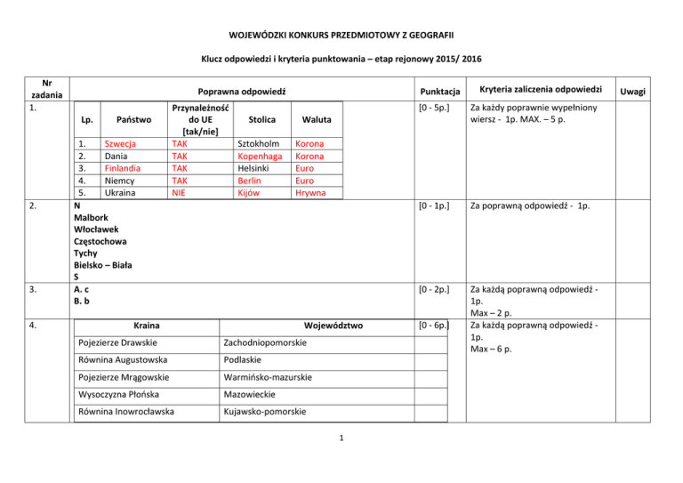 WOJEWÓDZKI KONKURS PRZEDMIOTOWY Z GEOGRAFII Klucz odpowiedzi i kryteria punktowania – etap rejonowy 2015/ 2016 Nr zadania 1. Poprawna odpowiedź Lp. 2. 3. 4. Państwo 1. Szwecja 2. Dania 3. Finlandia 4. Niemcy 5. Ukraina N Malbork Włocławek Częstochowa Tychy Bielsko – Biała S A. c B. b Przynależność do UE [tak/nie] TAK TAK TAK TAK NIE Stolica Sztokholm Kopenhaga Helsinki Berlin Kijów Kraina Punktacja Kryteria zaliczenia odpowiedzi [0 - 5p.] Za każdy poprawnie wypełniony wiersz - 1p. MAX. – 5 p. [0 - 1p.] Za poprawną odpowiedź - 1p. [0 - 2p.] Za każdą poprawną odpowiedź 1p. Max – 2 p. Za każdą poprawną odpowiedź 1p. Max – 6 p. Waluta Korona Korona Euro Euro Hrywna Województwo Pojezierze Drawskie Zachodniopomorskie Równina Augustowska Podlaskie Pojezierze Mrągowskie Warmińsko-mazurskie Wysoczyzna Płońska Mazowieckie Równina Inowrocławska Kujawsko-pomorskie 1 [0 - 6p.] Uwagi Kotlina Hrubieszowska 5. Lubelskie Polska liczy obecnie (2014r.) ok. a. 28 b. 38 z tego w miastach żyje ok. b. 50% a. 40% W latach 1990-2015 liczba ludności Polski 6. Południk Poznań Wrocław A. Gęstość zaludnienia B. 1341 osób/km2 Para miast 7. 170E 180E Bydgoszcz Opole c. 48 d. 58 mln mieszkańców, [0 - 3p.] c. 60% a. wzrosła d. 70% populacji. b. spadła. 190E Włocławek Katowice Za każdą poprawną odpowiedź 1p. Max – 3 p. 210E [0 - 4p.] Za każdą poprawną odpowiedź (parę miast)- 1p. Max – 4 p. [0 - 2p.] Za każdą poprawną odpowiedź 1p. Max. – 2 p. Za ułożenie 4 miast w odpowiedniej kolejności - 1p. Za ułożenie 6 miast w odpowiedniej kolejności – 2 p. Max – 2p. Warszawa Tarnów 8. Narwik Rovaniemi Rejkiawik Bergen Goteborg Kopenhaga [0 - 2p.] 9. Np. : - położenie w strefie ryftu - w obrębię grzbietu śródoceanicznego 1. P 9. P 2. P 10. F 3. F 4. P 5. P 6. P 7. P 8. P [0 - 1p.] Za poprawną odpowiedź – 1 p. Max – 1p. [0 - 10p.] Za każdą poprawną odpowiedź 1p. Max – 10 p. 10. 2 11. 12. 13. 14. 15. 1. Upadek, restrukturyzacja, prywatyzacja wielu państwowych przedsiębiorstw i PGR. 2. Zwolnienia grupowe wynikające z procesu prywatyzacji i restrukturyzacji. 3. Wprowadzenie nowych technologii, maszyny zastępują pracę ludzi. 4. Wykształcenie niedostosowane do potrzeb rynku. 5. Niechęć bezrobotnych do zmiany zawodu lub podnoszenia kwalifikacji. 6. Niechęć bezrobotnych do podejmowania nieatrakcyjnej dla nich pracy. Itp. DR NOKIA ERICSSON ELEKTROLUX STATOIL DANFOSS MARTENS Finlandia Szwecja Szwecja Norwegia Wielka Dania Brytania 1. B 2. B 3. A 4. B 5. A 6. A Lp. Parametr Polska znak Państwo 1. Liczba ludności Polska > Szwecja 2. Powierzchnia Polska < Finlandia 3. Ludność stolicy Polska > Norwegia 4. Wysokość najwyższego szczytu Polska > Czechy 5. Przyrost naturalny w ‰ Polska < Norwegia 6. Odsetek pracujących w rolnictwie Polska > Niemcy Zjawisko Izolinia Jednostka Opady atmosferyczne izohieta mm Ciśnienie atmosferyczne izobara hPa Głębokość dna izobata m Zasolenie wody izohalina ‰ 0 Temperatura powietrza izoterma C Wysokość bezwzględna izohipsa m n.p.m. terenu 3 [0 - 3p.] Za każdą poprawną odpowiedź 1p. Max – 3p. [0 - 2p.] Za 4-5 poprawnych odpowiedzi 1p. Za 6 poprawnych odpowiedzi – 2 p. Max – 2p. Za każdą poprawną odpowiedź 1p. Max – 2p. [0 - 6p.] [0 – 6p.] Za każdą poprawną odpowiedź 1p. W sumie maksymalnie 6p. [0 – 6p.] Za każdy poprawnie wypełniony wiersz – 1 p. Max – 6 p. 16. 17. 18. 19. 20. 21. A. B. C. D. [0 – 4p.] Ropa naftowa Węgiel brunatny Siarka Węgiel kamienny Za każdą poprawną odpowiedź 1p. W sumie maksymalnie 4p. C [0 – 1p.] Za poprawne wskazanie 1p. Lp. Wyspa Państwo/ Państwa 1. Svalbard Norwegia 2. Lofoty Norwegia 3. Zelandia Dania 4. Uznam Polska, Niemcy 5. Fionia Dania 6. Sarema Estonia 7. Gotlandia Szwecja Odp. Godz. 8.00 w Toruniu Obliczenia Różnica czasu – 8 godz. Godzina w Toruniu 16.00 – 8 godz. = 8.00 [0 – 7p.] Za każde prawidłowe uzupełnienie wiersza - 1p. 1:200000 1cm-2km 1cm2 – 4 km2 740 cm2 – 2960 km2 Odp. – 2960 km2 Typ Obszar wybrzeża występowania A fiordowe Norwegia [0 – 2p.] B Szkierowe (szerowe) Szwecja W sumie maksymalnie 7p. [0 – 2p.] [0 – 4p.] Podobieństwo Różnica Powstały w wyniku zalania obszarów polodowcowych Zalanie terenów o odmiennej rzeźbie polodowcowej: A dolin polodowcowych B terenów pagórkowatych 4 Za prawidłowe obliczenie różnicy czasu strefowego między Seulem a Toruniem– 1 p. Za prawidłowe podanie godz. konferencji w Toruniu – 1p. Max – 2p. Za prawidłowe obliczenie podziałki polowej Za prawidłowy wynik – 1p. Max – 2p. Za prawidłowe podanie typu i obszaru występowania – po 1 p. Za poprawne podanie podobieństwa – 1 p. Za poprawne podanie różnicy – 1 p. Max – 4 p. 22. 23. 1. Islandia 2. Kolski 3. Botnicka 4. Ładoga 5. Północne 6. Gotlandia 7. Biskajska 8. Pireneje 9. Baleary 10. Alborańskie (Śródziemne) 11. Loara 12. Peloponez 13. Macedonia 14. Dniepr 15. Tyrreńskie 16. Rudawy 17. Noteć 18. Rumunia 19. Mińsk 20. Kiloński 1. Sztokholm 2. Kattegat 3. Alandzkie 4. Narciarstwo 5. Dania 6. Ystad 7. Nordkapp 8. Andersen 9. Wener 10. Islandia 11. Abba [0 – 10p.] Za każde dwa prawidłowo rozpoznane obiekty po 1p. Max – 10p. [0 – 11p.] Za każde prawidłowe uzupełnienie – 1 p. Max – 11 p. Razem: 100 p. 75% punktów - 75 p. 5