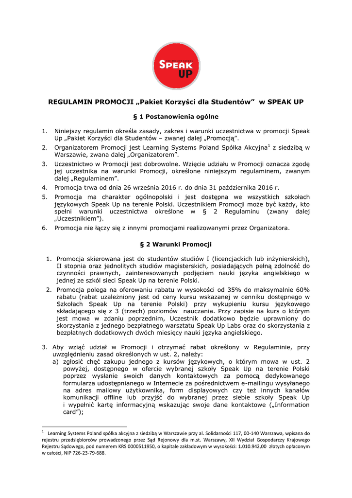 REGULAMIN PROMOCJI „Pakiet Korzyści dla Studentów” w SPEAK UP § 1 Postanowienia ogólne 1. Niniejszy regulamin określa zasady, zakres i warunki uczestnictwa w promocji Speak Up „Pakiet Korzyści dla Studentów – zwanej dalej „Promocją”. 2. Organizatorem Promocji jest Learning Systems Poland Spółka Akcyjna1 z siedzibą w Warszawie, zwana dalej „Organizatorem”. 3. Uczestnictwo w Promocji jest dobrowolne. Wzięcie udziału w Promocji oznacza zgodę jej uczestnika na warunki Promocji, określone niniejszym regulaminem, zwanym dalej „Regulaminem”. 4. Promocja trwa od dnia 26 września 2016 r. do dnia 31 października 2016 r. 5. Promocja ma charakter ogólnopolski i jest dostępna we wszystkich szkołach językowych Speak Up na terenie Polski. Uczestnikiem Promocji może być każdy, kto spełni warunki uczestnictwa określone w § 2 Regulaminu (zwany dalej „Uczestnikiem”). 6. Promocja nie łączy się z innymi promocjami realizowanymi przez Organizatora. § 2 Warunki Promocji 1. Promocja skierowana jest do studentów studiów I (licencjackich lub inżynierskich), II stopnia oraz jednolitych studiów magisterskich, posiadających pełną zdolność do czynności prawnych, zainteresowanych podjęciem nauki języka angielskiego w jednej ze szkól sieci Speak Up na terenie Polski. 2. Promocja polega na oferowaniu rabatu w wysokości od 35% do maksymalnie 60% rabatu (rabat uzależniony jest od ceny kursu wskazanej w cenniku dostępnego w Szkołach Speak Up na terenie Polski) przy wykupieniu kursu językowego składającego się z 3 (trzech) poziomów nauczania. Przy zapisie na kurs o którym jest mowa w zdaniu poprzednim, Uczestnik dodatkowo będzie uprawniony do skorzystania z jednego bezpłatnego warsztatu Speak Up Labs oraz do skorzystania z bezpłatnych dodatkowych dwóch miesięcy nauki języka angielskiego. 3. Aby wziąć udział w Promocji i otrzymać rabat określony w Regulaminie, przy uwzględnieniu zasad określonych w ust. 2, należy: a) zgłosić chęć zakupu jednego z kursów językowych, o którym mowa w ust. 2 powyżej, dostępnego w ofercie wybranej szkoły Speak Up na terenie Polski poprzez wysłanie swoich danych kontaktowych za pomocą dedykowanego formularza udostępnianego w Internecie za pośrednictwem e-mailingu wysyłanego na adres mailowy użytkownika, form displayowych czy też innych kanałów komunikacji offline lub przyjść do wybranej przez siebie szkoły Speak Up i wypełnić kartę informacyjną wskazując swoje dane kontaktowe („Information card”); 1 Learning Systems Poland spółka akcyjna z siedzibą w Warszawie przy al. Solidarności 117, 00-140 Warszawa, wpisana do rejestru przedsiębiorców prowadzonego przez Sąd Rejonowy dla m.st. Warszawy, XII Wydział Gospodarczy Krajowego Rejestru Sądowego, pod numerem KRS 0000511950, o kapitale zakładowym w wysokości: 1.010.942,00 złotych opłaconym w całości, NIP 726-23-79-688. b) okazać ważną legitymacje studencką studiów określonych w ust 1. c) podpisać umowę na świadczenie kursu języka angielskiego dotyczącą jednego z kursów językowych, o którym mowa w ust. 2 powyżej, w wybranej szkole Speak Up w dniu wizyty w szkole Speak Up. d) dokonać pierwszej wpłaty określonej cennikiem w dniu wizyty w szkole Speak Up; 4. Szczegółowa informacja dotycząca przyznawania rabatów dostępna jest w szkołach Speak Up na terenie Polski. w ramach Promocji 5. Nad prawidłowym przebiegiem Promocji czuwają pracownicy Speak Up, powołani przez Organizatora, którzy w razie potrzeby będą pomagać w rozstrzygnięciu wątpliwości dotyczących zasad Promocji. 6. Uczestnikami Promocji nie mogą być pracownicy Organizatora, ich współmałżonkowie i dzieci, jak też osoby pozostające z nimi we wspólnym gospodarstwie domowym oraz współpracownicy Organizatora, ani osoby pozostające z nim w stosunku zlecenia lub innym stosunku prawnym, do którego stosuje się przepisy o zleceniu, współmałżonkowie i dzieci takich osób, jak też osoby pozostające z nimi we wspólnym gospodarstwie domowym. § 3 Postępowanie reklamacyjne 1. Reklamacje dotyczące przebiegu Promocji mogą być zgłaszane wyłącznie pisemnie na adres Organizatora. 2. Prawo złożenia reklamacji przysługuje jedynie Uczestnikowi Promocji oraz Akcji przez okres trwania Promocji oraz w ciągu 45 dni po upływie jej trwania. W przypadku przesłania reklamacji drogą pocztową, o zachowaniu terminu składania reklamacji decyduje data stempla pocztowego. 3. Pisemna reklamacja powinna zawierać imię, nazwisko, dokładny adres osoby uczestniczącej w Promocji, jak również dokładny opis i wskazanie przyczyny reklamacji. 4. Reklamacje rozpatrywane będą w terminie 14 dni od dnia otrzymania reklamacji przez Organizatora. 5. Decyzja w przedmiocie reklamacji jest ostatecznym i wiążącym stanowiskiem Organizatora. § 4 Postanowienia końcowe 1. Regulamin Promocji dostępny jest w szkołach Speak Up oraz pod adresem internetowym: http://lp.speak-up.pl/document/Regulamin_Pakiet_STUDENT_X.pdf 2. Organizator zastrzega sobie prawo do zmiany Regulaminu, pod warunkiem, że taka zmiana nie naruszy praw nabytych Uczestników Promocji. Informacje o zmianie Regulaminu podane będą pod adresem internetowym wskazanym w ust. 1 powyżej ze stosownym wyprzedzeniem. 3. Akceptacja Regulaminu jest jednoznaczna z wyrażeniem zgody na wykorzystanie i przetwarzanie danych osobowych Uczestnika przez Organizatora zgodnie z ustawą z dnia 29 sierpnia 1997 r. o ochronie danych osobowych (Dz. U. z 2002 r. Nr 101, poz. 926 z późn. zm.) w celu prowadzenia Promocji. Administratorem danych osobowych jest Organizator. 4. Uczestnik Promocji oraz Akcji ma prawo wglądu do swoich danych, o których mowa w ust. poprzedzającym oraz ich poprawiania. Podanie danych jest dobrowolne, ale niezbędne do wzięcia udziału w Promocji. 5. Spory, które mogłyby wyniknąć z tytułu wykonania zobowiązań związanych z niniejszą Promocją będą rozstrz