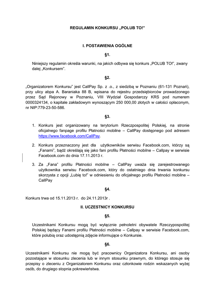 REGULAMIN KONKURSU „POLUB TO!” I. POSTAWIENIA OGÓLNE §1. Niniejszy regulamin określa warunki, na jakich odbywa się konkurs „POLUB TO!”, zwany dalej „Konkursem”. §2. „Organizatorem Konkursu” jest CallPay Sp. z .o., z siedzibą w Poznaniu (61-131 Poznań), przy ulicy abpa A. Baraniaka 88 B, wpisana do rejestru przedsiębiorców prowadzonego przez Sąd Rejonowy w Poznaniu, VIII Wydział Gospodarczy KRS pod numerem 0000324134, o kapitale zakładowym wynoszącym 250 000,00 złotych w całości opłaconym, nr NIP:779-23-50-586. §3. 1. Konkurs jest organizowany na terytorium Rzeczpospolitej Polskiej, na stronie oficjalnego fanpage profilu Płatności mobilne – CallPay dostępnego pod adresem https://www.facebook.com/CallPay. 2. Konkurs przeznaczony jest dla użytkowników serwisu Facebook.com, którzy są „Fanami”, bądź określają się jako fani profilu Płatności mobilne – Callpay w serwisie Facebook.com do dnia 17.11.2013 r. 3. Za „Fana” profilu Płatności mobilne – CallPay uważa się zarejestrowanego użytkownika serwisu Facebook.com, który do ostatniego dnia trwania konkursu skorzysta z opcji „Lubię to!” w odniesieniu do oficjalnego profilu Płatności mobilne – CallPay §4. Konkurs trwa od 15.11.2013 r. do 24.11.2013r . II. UCZESTNICY KONKURSU §5. Uczestnikami Konkursu mogą być wyłącznie pełnoletni obywatele Rzeczypospolitej Polskiej będący Fanami profilu Płatności mobilne – Callpay w serwisie Facebook.com, które polubią oraz udostępnią zdjęcie informujące o Konkursie. §6. Uczestnikami Konkursu nie mogą być pracownicy Organizatora Konkursu, ani osoby pozostające w stosunku zlecenia lub w innym stosunku prawnym, do którego stosuje się przepisy o zleceniu z Organizatorem Konkursu oraz członkowie rodzin wskazanych wyżej osób, do drugiego stopnia pokrewieństwa. §7. 1. Uczestnictwo w Konkursie jest dobrowolne równoznaczne z akceptacją warunków zapisanych w niniejszym Regulaminie. 2. Uczestnictwo w Konkursie jest również jednoznaczne z wyrażeniem zgody na przetwarzanie danych osobowych Uczestnika Konkursu w celu realizacji Konkursu. Dane osobowe mogą być także przetwarzane, gdy jest to niezbędne dla wypełnienia prawnie usprawiedliwionych celów administratora danych. 3. Zgłoszenie uczestnictwa w Konkursie oznacza wyrażenie przez Uczestnika Konkursu zgody na zamieszczanie niektórych jego danych (w szczególności imienia i nazwiska) we wszystkich materiałach, niezależnie od ich formy wyrażenia, mających za przedmiot propagowanie Konkursu oraz relacje z jego przebiegu na stronie www.callpay.pl oraz https://www.facebook.com/CallPay na czas określony przez Organizatora Konkursu. 4. Administratorem Konkursu. danych osobowych uczestników Konkursu jest Organizator 5. Nie podanie danych osobowych uniemożliwi laureatom odbiór nagród. III. ZASADY I PRZEBIEG KONKURSU §8. Nad prawidłowym przebiegiem Konkursu i przyznaniem nagród czuwają Osoby Odpowiedzialne powołane przez Organizatora Konkursu, zwane dalej „Jury Konkursu”. W skład Jury Konkursu wchodzą 2 osoby Będące pracownikami Organizatora Konkursu. §9. Konkurs odbywa się w dwóch etapach: 1. Etap 1 trwający od 15.11.2013r. do 24.11.2013r.– zgłaszanie udziału w Konkursie poprzez polubienie i udostępnienie zdjęcia dotyczącego Konkursu w serwisie Facebook.com, 2. Etap 2: trwający od 24.11.2013r. do_24.11.2013r. – wylosowanie trzech osób spośród Fanów, którzy udostępnili zdjęcie konkursowe w swoim prywatnym profilu. §10. Dostęp do udostępniania zdjęcia promującego Konkurs na profilu Płatności mobilne – Callpay w serwisie Facebook.com mają tylko fani Płatności mobilne – Callpay. §11. Organizator Konkursu zastrzega sobie losowy wybór trzech osób spośród Fanów, którzy udostępnili zdjęcie promujące Konkurs na profilu Płatności mobilne – Callpay w serwisie Facebook.com. §12. 1. Organizator Konkursu zastrzega, że wszelkie formy nieuczciwej rywalizacji, mające na celu mataczenie, są zabronione. 2. Tym samym w uzasadnionych przypadkach, gdy któryś z Uczestników dopuści się praktyk, o których mowa w ust. 1, Organizator Konkursu ma prawo usunąć jego zgłoszenie z Konkursu. §13. Rozstrzygnięcie Konkursu (opublikowanie wyników) nastąpi w dniu 25.11.2013r. . §14. Imiona i nazwiska laureatów Konkursu (zgodnie z danymi udostępnionymi przez uczestników serwisowi Facebook.com) zostaną opublikowane w serwisie Facebook.com na profilu Płatności mobilne – Callpay przez Osoby Odpowiedzialne powołane przez Organizatora. §15. 1. Laureaci Konkursu będą proszeni o podanie danych adresowych do wysyłki nagród drogą kurierską. 2. Koszty wysyłki nagród konkursowych ponosi Organizator Konkursu. IV. NAGRODY §16. Dla laureatów Konkursu przewidziano następujące zestawy nagród oznaczonych logotypem marki CallPay: 1. Zestaw 1: doładowanie Wirtualnej Portmonetki CallPay kwotą 50 pln, karta USB o pojemności 4 GB, napój energetyczny, smycz reklamowa 2. Zestaw 2: doładowanie Wirtualnej Portmonetki CallPay kwotą 50 pln, długopis, napój energetyczny, smycz reklamowa 3. Zestaw 3: doładowanie Wirtualnej Portmonetki CallPay kwotą 50 pln, notatnik, napój energetyczny, smycz reklamowa §17. 1. Nagrody będą przyznawane tylko i wyłącznie uczestnikom Konkursu, którzy zostali jego Laureatami. V.POSTANOWIENIA KOŃCOWE §18. Organizator Konkursu zastrzega sobie prawo do zmiany regulaminu Konkursu również w trakcie jego trwania. Informacja o zmianach w regulaminie Konkursu będzie umieszczana na bieżąco w profilu Płatności mobilne – Callpay w serwisie Facebook.com oraz na stronie internetowej www.callpay.pl. Zmiany wchodzą w życie z dniem ich ogłoszenia na w/w stronach internetowych. §19. Organizator nie ponosi kosztów związanych z dostarczeniem zgłoszeń konkursowych przez Uczestników Konkursu. §20. Organizator Konkursu nie ponosi odpowiedzialności za problemy techniczne serwi