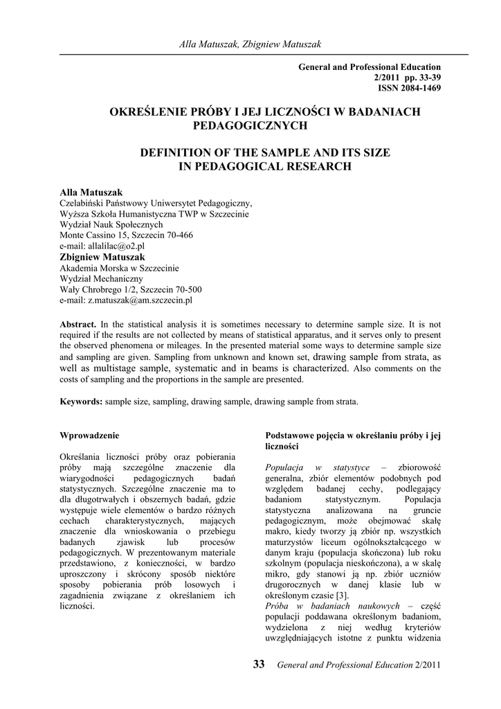 Alla Matuszak, Zbigniew Matuszak General and Professional Education 2/2011 pp. 33-39 ISSN 2084-1469 OKREŚLENIE PRÓBY I JEJ LICZNOŚCI W BADANIACH PEDAGOGICZNYCH DEFINITION OF THE SAMPLE AND ITS SIZE IN PEDAGOGICAL RESEARCH Alla Matuszak Czelabiński Państwowy Uniwersytet Pedagogiczny, Wyższa Szkoła Humanistyczna TWP w Szczecinie Wydział Nauk Społecznych Monte Cassino 15, Szczecin 70-466 e-mail: [email protected] Zbigniew Matuszak Akademia Morska w Szczecinie Wydział Mechaniczny Wały Chrobrego 1/2, Szczecin 70-500 e-mail: [email protected] Abstract. In the statistical analysis it is sometimes necessary to determine sample size. It is not required if the results are not collected by means of statistical apparatus, and it serves only to present the observed phenomena or mileages. In the presented material some ways to determine sample size and sampling are given. Sampling from unknown and known set, drawing sample from strata, as well as multistage sample, systematic and in beams is characterized. Also comments on the costs of sampling and the proportions in the sample are presented. Keywords: sample size, sampling, drawing sample, drawing sample from strata. Podstawowe pojęcia w określaniu próby i jej liczności Wprowadzenie Określania liczności próby oraz pobierania próby mają szczególne znaczenie dla wiarygodności pedagogicznych badań statystycznych. Szczególne znaczenie ma to dla długotrwałych i obszernych badań, gdzie występuje wiele elementów o bardzo różnych cechach charakterystycznych, mających znaczenie dla wnioskowania o przebiegu badanych zjawisk lub procesów pedagogicznych. W prezentowanym materiale przedstawiono, z konieczności, w bardzo uproszczony i skrócony sposób niektóre sposoby pobierania prób losowych i zagadnienia związane z określaniem ich liczności. Populacja w statystyce – zbiorowość generalna, zbiór elementów podobnych pod względem badanej cechy, podlegający badaniom statystycznym. Populacja statystyczna analizowana na gruncie pedagogicznym, może obejmować skałę makro, kiedy tworzy ją zbiór np. wszystkich maturzystów liceum ogólnokształcącego w danym kraju (populacja skończona) lub roku szkolnym (populacja nieskończona), a w skalę mikro, gdy stanowi ją np. zbiór uczniów drugorocznych w danej klasie lub w określonym czasie [3]. Próba w badaniach naukowych – część populacji poddawana określonym badaniom, wydzielona z niej według kryteriów uwzględniających istotne z punktu widzenia 33 General and Professional Education 2/2011 OKREŚLENIE PRÓBY I JEJ LICZNOŚCI W BADANIACH PEDAGOGICZNYCH S. Nowak [8] podaje, że wg G. Lissowskiego „termin próba reprezentatywna jest niejednoznaczny. Po pierwsze – przez próbę reprezentatywną możemy rozumieć taką część zbiorowości, która jest miniaturą tej zbiorowości. Po drugie … reprezentatywność próby jest kwestią stopnia”. 1. Próba jest reprezentatywna wówczas, kiedy występują w niej wszystkie wartości zmiennej czy zmiennych nas interesujących. 2. Próba jest reprezentatywna, kiedy rozkłady interesujących nas zmiennych w tej próbie odpowiadają rozkładom tych zmiennych w zbiorowości, którą ona reprezentuje, czyli w populacji generalnej. 3. Próba jest reprezentatywna wówczas, kiedy występujące w niej zależności między zmiennymi odpowiadają analogicznym zależnościom w zbiorowości generalnej. Każde z tych znaczeń może ponadto być bądź atrybutywnie – próba jest lub nie jest reprezentatywna, bądź też w sposób stopniowalny - próba jest reprezentatywna w określonym stopniu [8]: - Typologiczna reprezentatywność próby – aby w próbie wystąpiły wszystkie wartości danej zmiennej (...) zbadać reprezentantów wszystkich kategorii wyróżnionych ze względu na pewne zmienne społeczno-demograficzne, bez względu na to, jak liczne są w zbiorowości generalnej. Np. w badaniach nt. „Analiza problemów dewiacyjnego zachowania się dzieci, młodzieży w środowisku wiejskim” za pomocą metody sondażu diagnostycznego wśród mieszkańców wiejskich muszą być przewidywane odpowiedzi mieszkańców w wieku młodym, średnim i starczym, kobiet i mężczyzn. - Reprezentatywność ze względu na rozkłady określonych zmiennych wiąże się z rozkładami zmiennych w próbie i populacji. Np. w badaniach nt. „Analiza problemów dewiacyjnego zachowania się dzieci, młodzieży w środowisku wiejskim” metoda sondażu diagnostycznego musi przewidywać określone proporcje ankietowania mieszkańców w różnym wieku i różnych płci. Reprezentatywność pod względem statystycznych zależności. Może tak się stać, że próba reprezentatywna dla jednej zbiorowości ze względu na rozkłady pewnych zmiennych nie będzie dla tej zbiorowości reprezentatywna ze względu na związki między tymi zmiennymi, lub odwrotnie. Np. w badaniach nt. „Analiza problemów celu badań właściwości tej populacji. Próba jest reprezentatywna wówczas, kiedy można uogólniać rezultaty objętych nią badań na populację jako całość [3]. Wartość zmiennej, która charakteryzuje populację całkowitą jest parametrem. Wartość zmiennej, która charakteryzuje próbę badawczą jest estymatorem [5]. Składniki populacji: podmiot (element), jednostka próby, zakres przestrzenny, czas i miejsce badań [6]. Oto przykłady zdefiniowania populacji badanej: 1. Dla projektu badawczego w pedagogice resocjalizacyjnej: a) - podmiot – dzieci o obniżonej sprawności umysłowej; - jednostka próby – wybrane szkoły podstawowe; - zakres przestrzenny – powiat choszczeński; - czas i miejsce badań – rok akademicki 2011/2012; b) - podmiot – dzieci z rodzin patologicznych; - jednostka próby – rodzina patologiczna; - zakres przestrzenny – aglomeracja miejska; - czas i miejsce badań – rok akademicki 2011/2012. 2. Dla projektu badawczego w pedagogice szkolnej: - podmiot – uczniowie z niepowodzeniami; - jednostka prób