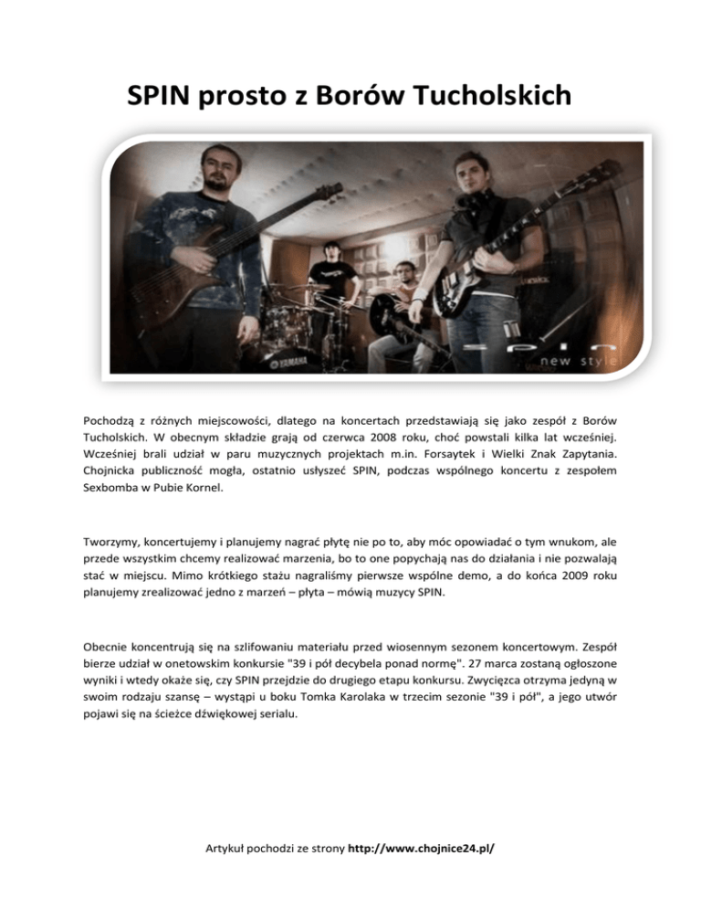 SPIN prosto z Borów Tucholskich Pochodzą z różnych miejscowości, dlatego na koncertach przedstawiają się jako zespół z Borów Tucholskich. W obecnym składzie grają od czerwca 2008 roku, chod powstali kilka lat wcześniej. Wcześniej brali udział w paru muzycznych projektach m.in. Forsaytek i Wielki Znak Zapytania. Chojnicka publicznośd mogła, ostatnio usłyszed SPIN, podczas wspólnego koncertu z zespołem Sexbomba w Pubie Kornel. Tworzymy, koncertujemy i planujemy nagrad płytę nie po to, aby móc opowiadad o tym wnukom, ale przede wszystkim chcemy realizowad marzenia, bo to one popychają nas do działania i nie pozwalają stad w miejscu. Mimo krótkiego stażu nagraliśmy pierwsze wspólne demo, a do kooca 2009 roku planujemy zrealizowad jedno z marzeo – płyta – mówią muzycy SPIN. Obecnie koncentrują się na szlifowaniu materiału przed wiosennym sezonem koncertowym. Zespół bierze udział w onetowskim konkursie "39 i pół decybela ponad normę". 27 marca zostaną ogłoszone wyniki i wtedy okaże się, czy SPIN przejdzie do drugiego etapu konkursu. Zwycięzca otrzyma jedyną w swoim rodzaju szansę – wystąpi u boku Tomka Karolaka w trzecim sezonie "39 i pół", a jego utwór pojawi się na ścieżce dźwiękowej serialu. Artykuł pochodzi ze strony http://www.chojnice24.pl/ Na zespół SPIN, można oddad głos pod adresem: muzyka.onet.pl/mojascena/0,10174,136995,1549230,artysci.html W najbliższą niedzielę od godziny 22:00 będzie można usłyszed SPIN na antenie radia Weekend – zapraszamy!!! SPIN gra w składzie: Maciej Mews- wokal, bas Piotr Budnik -gitara Sebastian Fierek- bębny Piotr Borowiec- gitara Strona zespołu: www.spin.art.pl. Artykuł pochodzi ze strony http://www.chojnice24.pl/