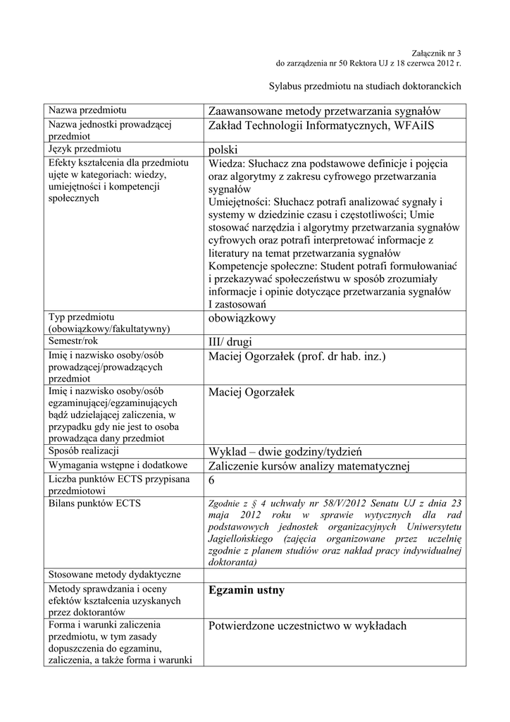 Załącznik nr 3 do zarządzenia nr 50 Rektora UJ z 18 czerwca 2012 r. Sylabus przedmiotu na studiach doktoranckich Nazwa przedmiotu Nazwa jednostki prowadzącej przedmiot Język przedmiotu Efekty kształcenia dla przedmiotu ujęte w kategoriach: wiedzy, umiejętności i kompetencji społecznych Typ przedmiotu (obowiązkowy/fakultatywny) Semestr/rok Imię i nazwisko osoby/osób prowadzącej/prowadzących przedmiot Imię i nazwisko osoby/osób egzaminującej/egzaminujących bądź udzielającej zaliczenia, w przypadku gdy nie jest to osoba prowadząca dany przedmiot Sposób realizacji Wymagania wstępne i dodatkowe Liczba punktów ECTS przypisana przedmiotowi Bilans punktów ECTS Zaawansowane metody przetwarzania sygnałów Zakład Technologii Informatycznych, WFAiIS polski Wiedza: Słuchacz zna podstawowe definicje i pojęcia oraz algorytmy z zakresu cyfrowego przetwarzania sygnałów Umiejętności: Słuchacz potrafi analizować sygnały i systemy w dziedzinie czasu i częstotliwości; Umie stosować narzędzia i algorytmy przetwarzania sygnałów cyfrowych oraz potrafi interpretować informacje z literatury na temat przetwarzania sygnałów Kompetencje społeczne: Student potrafi formułowaniać i przekazywać społeczeństwu w sposób zrozumiały informacje i opinie dotyczące przetwarzania sygnałów I zastosowań obowiązkowy III/ drugi Maciej Ogorzałek (prof. dr hab. inz.) Maciej Ogorzałek Wyklad – dwie godziny/tydzień Zaliczenie kursów analizy matematycznej 6 Zgodnie z § 4 uchwały nr 58/V/2012 Senatu UJ z dnia 23 maja 2012 roku w sprawie wytycznych dla rad podstawowych jednostek organizacyjnych Uniwersytetu Jagiellońskiego (zajęcia organizowane przez uczelnię zgodnie z planem studiów oraz nakład pracy indywidualnej doktoranta) Stosowane metody dydaktyczne Metody sprawdzania i oceny efektów kształcenia uzyskanych przez doktorantów Forma i warunki zaliczenia przedmiotu, w tym zasady dopuszczenia do egzaminu, zaliczenia, a takŜe forma i warunki Egzamin ustny Potwierdzone uczestnictwo w wykładach zaliczenia przedmiotu Treści przedmiotu* Wykaz literatury podstawowej i uzupełniającej* Przetwarzanie analogowo-cyfrowe. Próbkowanie i kwantyzacja. Zaokrąglenie i obcięcie. Błędy kwantyzacji; Decymacja i interpolacja; Ciągła i dyskretna transformacja Fouriera. Własności.; Transformacja „z“ i jej własności; Widmo częstotliwościowe sygnału. Pasmo częstotliwości; Definicja i własności splotu; Liniowe przetwarzanie sygnałów. Odpowiedź impulsowa układu; Nieliniowe przetwarzanie sygnałów – przykłady; Zjawisko aliasingu. Twierdzenie o próbkowaniu; Okienkowanie sygnału. Wpływ kształtu okna na własności reprezentacji widmowej. Przeciek częstotliwości; Filtracja sygnałów. Typy filtrów częstotliwościowych; Filtracja cyfrowa; Filtry o skończonej odpowiedzi impulsowej (FIR) – opis w dziedzinie „z“; Filtry o nieskończonej odpowiedzi impulsowej (IIR)– opis w dziedzinie „z“; Koncepcje stabilność filtrów cyfrowych; Kryteria stabilności; Realizacja filtrów analogowych; Filtry Butterwortha – własności; Filtry Czebyszewa – własności; Filtry eliptyczne – własności; Transformacje częstotliwości (DP-GP, DP-PP,DP-PZ); Realizacja filtrów cyfrowych na podstawie prototypu analogowego; Wpływ nieidealności na własności rzeczywistych układów cyfrowego przetwarzania sygnałów; Przykłady sygnałów wielowymiarowych; Obraz jako sygnał dwu-wymiarowy; Reprezentacja częstotliwościowa sygnałów dwu-wymiarowych; Przetwarzanie liniowe obrazów; Widma częstotliwościowe obrazów; Konwolucja dla sygnałów dwu-wymiarowych; Analiza falkowa sygnałów i obrazów. 1. J. Szabatin, Podstawy teorii sygna ów, wyd. 4, WK Warszawa 2002 2. T.P.Zieli ski, Cyfrowe przetwarzanie sygna ów. Od teorii do zastosowa , WK , Wyd.2, Warszawa 2007 3. A.V. Oppenheim, R.W. Schafer , Cyfrowe przetwarzanie sygna ów , WK , 1979 4. S. K. Mitra Digital Signal Processing: A Computer-Based Approach * W szczególnie uzasadnionych przypadkach moŜna podać informację ogólną.