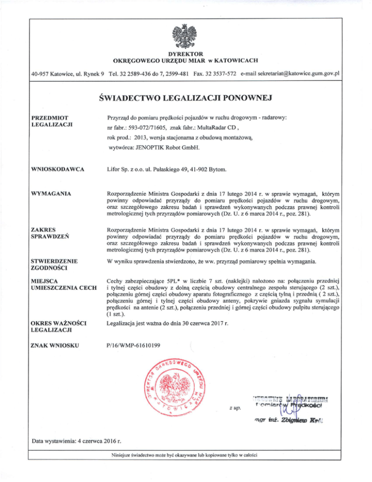 DYREKTOR OKRĘGOWEGO URZĘDU MIAR w K A T O W I C A C H 40-957 Katowice, ul. Rynek 9 Tel. 32 2589-436 do 7, 2599-481 Fax. 32 3537-572 e-mail [email protected] ŚWIADECTWO L E G A L I Z A C J I PONOWNEJ PRZEDMIOT LEGALIZACJI Przyrząd do pomiaru prędkości pojazdów w ruchu drogowym - radarowy: nr fabr.: 593-072/71605, znak fabr.: MultaRadar CD , rok prod.: 2013, wersja stacjonarna z obudową montażową, wytwórca: JENOPTIK Robot GmbH. WNIOSKODAWCA Lifor Sp. z 0.0. ul. Pułaskiego 49,41-902 Bytom. WYMAGANIA Rozporządzenie Ministra Gospodarki z dnia 17 lutego 2014 r. w sprawie wymagań, którym powiimy odpowiadać przyrządy do pomiaru prędkości pojazdów w ruchu drogowym, oraz szczegółowego zakresu badań i sprawdzeń wykonywanych podczas prawnej kontroli metrologicznej tych przyrządów pomiarowych (Dz. U. z 6 marca 2014 r., poz. 281). ZAKRES SPRAWDZEŃ Rozporządzenie Ministra Gospodarki z dnia 17 lutego 2014 r. w sprawie wymagań, którym powinny odpowiadać przyrządy do pomiaru prędkości pojazdów w ruchu drogowym, oraz szczegółowego zakresu badań i sprawdzeń wykonywanych podczas prawnej kontroli metrologicznej tych przyrządów pomiarowych (Dz. U. z 6 marca 2014 r., poz. 281). STWIERDZENIE ZGODNOŚCI W wyniku sprawdzenia stwierdzono, że ww. przyrząd pomiarowy spełnia wymagania. MIEJSCA UMIESZCZENIA C E C H Cechy zabezpieczające 5PL* w liczbie 7 szt. (naklejki) nałożono na: połączeniu przedniej i tylnej części obudowy z dolną częścią obudowy centralnego zespołu sterującego (2 szt.), połączeniu górnej części obudowy aparatu fotograficznego z częścią tylną i przednią ( 2 szt.), połączeniu górnej i tylnej części obudowy anteny, pokrywie gniazda sygnału symulacji prędkości na antenie (2 szt.), połączeniu przedniej i górnej części obudowy pulpitu sterującego (1 szt.). O K R E S WAŻNOŚCI LEGALIZACJI Legalizacja jest ważna do dnia 30 czerwca 2017 r. ZNAK WNIOSKU P/16/WMP-61610199 z up. fngr inż. Data wystawienia: 4 czerwca 2016 r. Niniejsze świadectwo może być okazywane lub kopiowane tylko w całości Krs: