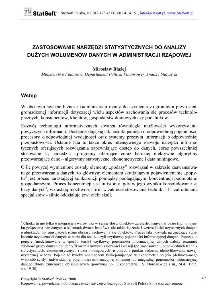 StatSoft Polska, tel. 012 428 43 00, 601 41 41 51, [email protected], www.StatSoft.pl ZASTOSOWANIE NARZĘDZI STATYSTYCZNYCH DO ANALIZY DUŻYCH WOLUMENÓW DANYCH W ADMINISTRACJI RZĄDOWEJ Mirosław Błażej Ministerstwo Finansów, Departament Polityki Finansowej, Analiz i Statystyki Wstęp W obecnym świecie biznesu i administracji mamy do czynienia z ogromnym przyrostem gromadzonej informacji dotyczącej wielu aspektów zachowania się procesów technologicznych, konsumentów, klientów, gospodarstw domowych czy podatników. Rozwój technologii informatycznych stwarza równolegle możliwości wykorzystania powyższych informacji. Dostępne stają się tak nośniki pamięci o odpowiedniej pojemności, procesory o odpowiedniej wydajności oraz systemy przesyłu informacji o odpowiedniej przepustowości. Ostatnie lata to także okres intensywnego rozwoju narzędzi informatycznych oferujących rozwiązania zapewniające dostęp do danych, coraz powszechniej stosowane są narzędzia i programy oferujące coraz bardziej efektywne algorytmy przetwarzające dane – algorytmy statystyczne, ekonometryczne i data miningowe. O ile powyżej wymienione zostały elementy „podaży” rozwiązań w zakresie zaawansowanego przetwarzania danych, to głównym elementem skutkującym pojawieniem się „popytu” jest proces narastającej konkurencji pomiędzy podlegającymi koncentracji podmiotami gospodarczymi. Proces koncentracji jest tu istotny, gdy w jego wyniku konsolidowane są bazy danych1, wzrastają możliwości firm w zakresie stosowania techniki IT i zatrudniania specjalistów - silnie oddziałuje tzw. efekt skali. 1 Chodzi tu nie tylko o integrację i wzrost baz w sensie ilości obiektów zarejestrowanych w bazie (np. w wyniku połączenia baz danych o klientach dwóch banków), ale także łączenie i wzrost ilości użytecznych danych o obiektach, np. opisujących różne obszary zachowania się obiektów. Proces taki pozwala na znaczące zwiększenie użyteczności danych w bazie dla analiz, czyli użytkowej pojemności informacyjnej danych. Poprzez to pojęcie (niedefiniowane w sposób ścisły) użytkowej pojemności informacyjnej danych należy rozumieć zdolność grupy danych do identyfikowania nowych zależności i relacji (po zastosowaniu odpowiednich technik statystycznych, ekonometrycznych i data miningowych) istotnych z punktu widzenia identyfikowania nowej, użytecznej wiedzy. Pojecie to byłoby analogonem funkcjonującego w ekonometrii pojęcia (definiowanego w sposób ścisły) indywidualnej pojemności informacyjnej zmiennej lub integralnej pojemności informacyjnej danego zbioru zmiennych objaśniających (porównaj np. „Ekonometria”, S. Dorosiewicz i in., SGH 1995, str. 19-20). Copyright © StatSoft Polska, 2008 Kopiowanie, powielanie, publikacja całości lub części bez zgody StatSoft Polska Sp. z o.o. zabronione 49 StatSoft Polska, tel. 012 428 43 00, 601 41 41 51, [email protected], www.StatSoft.pl Przedstawienie zagadnienia Powyższe procesy dotyczą oczywiście także administracji publicznej, szczególnie duże potencjalne zastosowania narzędzi analizy dużych wolumenów danych otwierają się w odniesieniu do ministerstw finansów, z uwagi na dużą ilość informacji gromadzonej w ramach systemów IT wspierających działalność służb podatkowych, celnych czy budżetowych, informacji dostępnej w formie sprzyjającej stosowaniu tego typu analiz. Instytucje te dysponują ponadto możliwością zgromadzenia odpowiednich zasobów, a potencjalnie duże korzyści z inwestycji w tego typu systemy i procedury analityczne skłaniają do podjęcia wysiłku ich rozwoju. Poniżej chciałbym odnieść się do jednego z obszarów analitycznych obecnych w pracach Ministerstwa Finansów, a dotyczącego analiz w odniesieniu do systemu podatkowego, a zwłaszcza przewidywania skutków zmian w systemie podatkowym. Analizy wykonywane w ramach rozwijanego aktualnie systemu Sindbad dotyczą głównie właśnie tego wymiaru, ale także analizy sytuacji gospodarczej i społecznej na poziomie makro i mikroekonomicznym. Analizy w zakresie systemu podatkowego, a zwłaszcza związane z szacunkami skutków budżetowych, konsekwencji zmian dla różnych grup podatników, oszacowanie wielkości zmiany efektywnej stawki podatkowej do wykorzystania jako szoku dla ekonometrycznego modelu gospodarki w celu określenia wpływu zmiany na dynamikę podstawowych kategorii ekonomicznych są częstymi zadaniami Departamentu Polityki Finansowej, Analiz i Statystyki czy departamentów podatkowych Ministerstwa. Wykonywane są one w dość specyficznych warunkach, które muszą być uwzględnione przy konstrukcji systemu analitycznego. Wśród tych warunków należy wymienić: czas: większość zadań jest poddana bardzo wymagającemu i bardzo silnemu ograniczeniu czasowemu, które jest pochodną wymogów kalendarza politycznego lub prac parlamentarnych bądź rządowych, zmienność: analizy dotyczą szerokiego wachlarza zagadnień, począwszy od polityki podatkowej, jak i zagadnień mikro-, makroekonomicznych, polityki społecznej czy budżetowej. Wiąże się także ze stosowaniem najrozmaitszych technik badawczych i analitycznych, sposób ich formułowania: zagadnienia analityczne formułowane są w języku politycznym i prawnym. Oznacza to konieczność „przekształcenia” ich na zagadnienia związane z analizą danych oraz ekonomiczne, koszt decyzji: choćby z uwagi na skalę (finansową, ilości podmiotów dla jakich analizowane zmiany niosą konsekwencję) koszt popełnienia błędu przy podejmowaniu decyzji jest bardzo wysoki. Zastosowanie narzędzi IT do wyżej zarysowanych analiz można umiejscawiać w ramach knowledge discovering in databases (KDD), które jest nazwą ogólną procesu obejmującego uzyskanie użytecznej i nietrywialnej informacji ze zgromadzonego zbioru danych (najczęściej w postaci elektronicznej bazy danych); nietrywialnej, a więc niepodlegającej 50 Copyright © 