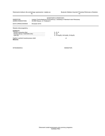 Wykonanie kotłowni dla centralnego ogrzewania i ciepłej wody INWESTOR ADRES INWESTORA : : DATA OPRACOWANIA : Budynek Zakładu InŜynierii Produkcji Rolniczej w Kłudzienku KOSZTORYS OFERTOWY Instytut Technologiczno-Przyrodniczy z siedzibą w Falentach koło Warszawy 05-090 Raszyn, ul. Hrabska 2 Wrzesień 2010 Stawka roboczogodziny : NARZUTY Koszty pośrednie [Kp] ............................................ Koszty zakupu materiałów [Kz] .............................. Zysk [Z] .................................................................. Ogółem wartość kosztorysowa robót Słownie: WYKONAWCA: % R, S % M % R+Kp(R), M+Kz(M), S+Kp(S) : zł INWESTOR : Dokument został opracowany przy pomocy programu NORMA PRO TABELA ELEMENTÓW SCALONYCH Wykonanie kotłowni dla centralnego ogrzewania i ciepłej wody Budynek Zakładu InŜynierii Produkcji Rolniczej w Kłudzienku Lp. Nazwa Kosztorys Robocizna Materiały Sprzęt Słownie: -2- Norma PRO Wersja 4.01, Marzec 2003 r. Kp Kz Z RAZEM KOSZTORYS INWESTORSKI uproszczony Wykonanie kotłowni dla centralnego ogrzewania i ciepłej wody Budynek Zakładu InŜynierii Produkcji Rolniczej w Kłudzienku Lp. Podstawa 1 KNR-W 2-20 0401-01 2 KNR-W 2-20 0401-01 3 KNR-W 2-20 0401-02 4 KNR-W 2-20 0401-02 5 KNR-W 2-20 0401-02 6 KNR-W 2-02 1517-01 7 KNZ-15 25-01 8 KNZ-15 26-01 9 KNZ-15 28-04 10 KNZ-15 29-04 11 KNR-W 2-15 0503-02 12 KNR 0-35 0121-02 Opis Jedn.obm. Rurociągi z rur stalowych czarnych o śr. 15 mm łączom nych przez spawanie Rurociągi z rur stalowych czarnych o śr. 20 mm łączom nych przez spawanie Rurociągi z rur stalowych czarnych o śr. 32 mm łączom nych przez spawanie Rurociągi z rur stalowych czarnych o śr. 32 mm łączom nych przez spawanie Rurociągi z rur stalowych czarnych o śr. 40 mm łączom nych przez spawanie Dwukrot.malowanie farbą olejną lub ftalową rur stalowych m i blaszanych o śr. do 50 mm MontaŜ otulin termoizolacyjnych "STEINONORM 300" typ M I P S dla rurociągów o śr. 15 mm, gr. izolacji 20 mm MontaŜ otulin termoizolacyjnych "STEINONORM 300" typ M I P S dla rurociągów o śr. 20 mm, gr. izolacji 20 mm MontaŜ otulin termoizolacyjnych "STEINONORM 300" typ M I P S dla rurociągów o śr. 32 mm, gr. izolacji 25 mm MontaŜ otulin termoizolacyjnych "STEINONORM 300" typ M I P S dla rurociągów o śr. 40 mm, gr. izolacji 25 mm Kotły stalowe wodne lub parowe o pow.ogrzewalnej do 6 m2 kocioł wiszący kondensacyjny t. Vidotens 200-W, 45,0 kW mocy uŜytkowej Zasobnikowe podgrzewacze wody uŜytkowej, stojące, współpracujące z kotłami grzewczymi, montowane przy pomocy gotowych zestawów przyłączeniowych; poj. do 150 dm3 m Ilość Cena jedn. 3,0 4,0 3,0 3,0 6,7 3,0+4,0+ 3,0+6,7 = 16,70 3,0 m 4,0 m 3,00 m 6,7 szt. 1 kpl. 1 kpl. 1 kpl. 1 kpl. 1 szt. 1 szt. 1 kpl. 1 szt. 2 podgrzewacz pojemnościowy t. Smart 130, pow. grzewcza 1,26 m2 w izolacji termicznej 13 KNR 7-07 0102-01 14 KNR 7-07 0102-01 15 KNR 7-07 0102-01 zestaw przyłączeniowy podgrzewacza wody uŜytkowej vies Z006183 Pompy wirowe odśrodkowe jedno- i wielostopniowe do zasilania kotłów oraz obiegowe do wody gorącej o masie 0.05 t meibes 66733.30 V-UK grupa pompowa ALPHA2 25-60 z mieszaczem, z siłownikiem meibes 66341 do mieszacza grupy MK 230V/50Hz 2,5 min 90 Pompy wirowe odśrodkowe jedno- i wielostopniowe do zasilania kotłów oraz obiegowe do wody gorącej o masie 0.05 t pompa obiegowa MAGNA 32-100 f Grundfos - co Pompy wirowe odśrodkowe jedno- i wielostopniowe do zasilania kotłów oraz obiegowe do wody gorącej o masie 0.05 t 16 KNR 0-31 0213-01 pompa obiegowa MAGNA 32-40 f Grundfos Naczynia wzbiorcze przeponowe o pojemności całkowitej do 20 dm3 17 KNR-W 2-15 0526-02 naczynie przeponowe 18 NG, 3 br ze złączem samoodcinającym SU 3/4" Zawory bezpieczeństwa, cięŜarkowe lub spręŜynowe dla ciśnień 0.6 MPa o śr. nominalnej 20-25 mm 18 KNR-W 2-15 0508-01 zawór bezpieczeństwa Syr 1915, R 3/4" Urządzenia do zabezpieczenie kotłów parowych o wydajności do 115 Mcal/h 19 KNR-W 2-15 0525-03 sprzęgło WST 60-34 z izolacją termiczną Zawory Ŝeliwne zaporowe lub zwrotne, grzybkowe, z kielichami gwintowanymi dla ciśnień 1.6 MPa o śr. nominalnej 40 mm filtr magnetyczny MFW Dn 40mm gwintowany -3- Norma PRO Wersja 4.01, Marzec 2003 r. Wartość KOSZTORYS INWESTORSKI uproszczony Wykonanie kotłowni dla centralnego ogrzewania i ciepłej wody Budynek Zakładu InŜynierii Produkcji Rolniczej w Kłudzienku Lp. Podstawa 20 KNR-W 2-15 0525-03 21 KNR-W 2-15 0525-01 22 KNR-W 2-15 0525-03 23 KNR-W 2-15 0525-01 24 KNR-W 2-15 0530-03 25 KNR-W 2-15 0412-07 26 KNR-W 2-15 0525-01 Opis Zawory Ŝeliwne zaporowe lub zwrotne, grzybkowe, z kielichami gwintowanymi dla ciśnień 1.6 MPa o śr. nominalnej 40 mm zawory kulowe przelotowe mosięŜne do wody gorącej Zawory Ŝeliwne zaporowe lub zwrotne, grzybkowe, z kielichami gwintowanymi dla ciśnień 1.6 MPa o śr. nominalnej 10-20 mm Zawory Ŝeliwne zaporowe lub zwrotne, grzybkowe, z kielichami gwintowanymi dla ciśnień 1.6 MPa o śr. nominalnej 40 mm 29 KNR-W 2-15 0112-01 30 KNR-W 2-15 0112-02 Ilość 6 szt. 3 szt. 2 szt. 1 zawór antyskaŜeniowy do z.w. EA R 1/2" Termometry montowane wraz z wykonaniem tulei szt. 1 Zawory odpowietrzające automatyczne o śr. 15 mm szt. 4 szt. 4 zawór zwrotny uniwersalny Zawory Ŝeliwne zaporowe lub zwrotne, grzybkowe, z kielichami gwintowanymi dla ciśnień 1.6 MPa o śr. nominalnej 10-20 mm odpowietrznik automatyczny podpionowy Taco Dn 15mm Zawory Ŝeliwne zaporowe lub zwrotne, grzybkowe, z kielichami gwintowanymi dla ciśnień 1.6 MPa o śr. nominalnej 10-20 mm zawór kulowy odcinający Dn 15mm 27 KNNR 4 0514- Rozdzielacze do kotłów i instalacji c.o. z rur o śr. nomi02 nalnej do 80 mm 28 KNR-W 2-15 0112-01 Jedn.obm. szt. rozdzielacz MAGRA typ 60-15 z izolacją termiczną Rurociągi z tworzyw sztucznych (PP, PE, PB) o śr. zewnętrznej 20 mm o połączeniach zgrzewanych, na ścianach w budynkach niemieszkalnych m 0,4 m 1,5 instalacja z rur t. Raumulti stabilizowanych f. 