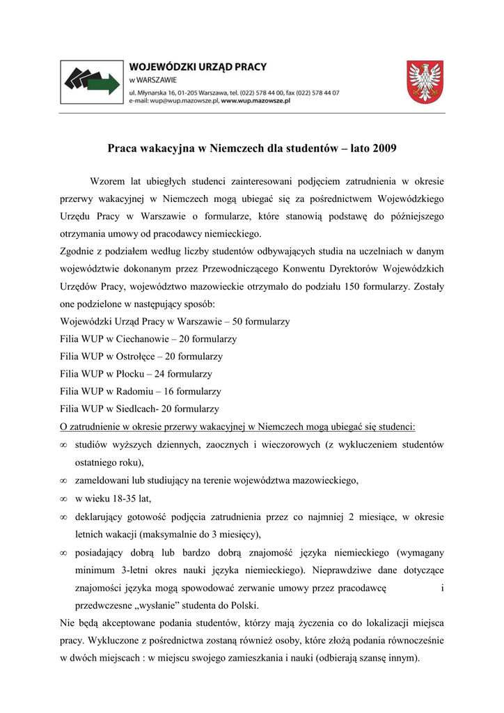 Praca wakacyjna w Niemczech dla studentów – lato 2009 Wzorem lat ubiegłych studenci zainteresowani podjęciem zatrudnienia w okresie przerwy wakacyjnej w Niemczech mogą ubiegać się za pośrednictwem Wojewódzkiego Urzędu Pracy w Warszawie o formularze, które stanowią podstawę do późniejszego otrzymania umowy od pracodawcy niemieckiego. Zgodnie z podziałem według liczby studentów odbywających studia na uczelniach w danym województwie dokonanym przez Przewodniczącego Konwentu Dyrektorów Wojewódzkich Urzędów Pracy, województwo mazowieckie otrzymało do podziału 150 formularzy. Zostały one podzielone w następujący sposób: Wojewódzki Urząd Pracy w Warszawie – 50 formularzy Filia WUP w Ciechanowie – 20 formularzy Filia WUP w Ostrołęce – 20 formularzy Filia WUP w Płocku – 24 formularzy Filia WUP w Radomiu – 16 formularzy Filia WUP w Siedlcach- 20 formularzy O zatrudnienie w okresie przerwy wakacyjnej w Niemczech mogą ubiegać się studenci: • studiów wyŜszych dziennych, zaocznych i wieczorowych (z wykluczeniem studentów ostatniego roku), • zameldowani lub studiujący na terenie województwa mazowieckiego, • w wieku 18-35 lat, • deklarujący gotowość podjęcia zatrudnienia przez co najmniej 2 miesiące, w okresie letnich wakacji (maksymalnie do 3 miesięcy), • posiadający dobrą lub bardzo dobrą znajomość języka niemieckiego (wymagany minimum 3-letni okres nauki języka niemieckiego). Nieprawdziwe dane dotyczące znajomości języka mogą spowodować zerwanie umowy przez pracodawcę i przedwczesne „wysłanie” studenta do Polski. Nie będą akceptowane podania studentów, którzy mają Ŝyczenia co do lokalizacji miejsca pracy. Wykluczone z pośrednictwa zostaną równieŜ osoby, które złoŜą podania równocześnie w dwóch miejscach : w miejscu swojego zamieszkania i nauki (odbierają szansę innym). Wskazówki i informacje dotyczące warunków zatrudnienia: 1. Oferowana praca wakacyjna to najczęściej prace pomocnicze w rolnictwie, przy czyszczeniu przemysłowym, czyszczeniu budynków, w hotelu i gastronomii oraz w sieci gastronomicznej (np. Mc Donalds). 2. Czas pracy, wynagrodzenie oraz pozostałe warunki pracy odpowiadają uregulowaniom według taryfikatora lub ustaleniom lokalnym w Niemczech. Wynagrodzenie płatne jest przewaŜnie na koniec miesiąca, dlatego w pierwszych tygodniach studenci powinni mieć wystarczającą ilość pieniędzy na utrzymanie. 3. Student powinien zabrać drugi egzemplarz zaświadczenia o wpisie na listę studentów dla pracodawcy, gdyŜ będzie on niezbędny przy zatrudnieniu i naliczeniu wynagrodzenia. 4. Po przyjeździe do Niemiec student ma obowiązek zameldowania się w ciągu 8 dni w administracji gminy lub miasta. 5. PoniewaŜ studenci nie mają w Niemczech ustawowego ubezpieczenia chorobowego, powinni koniecznie zawrzeć umowę ubezpieczeniową w Polsce, w ramach której pokryte zostaną koszty ewentualnej choroby. 6. Koszty dojazdu do miejsca pracy ponosi student. Pracodawca nie ma obowiązku zapewnienia studentowi zakwaterowania, ale pomaga w jego znalezieniu. W branŜach takich jak rolnictwo, gastronomia pracodawca zapewnia zakwaterowanie (odpłatne lub nieodpłatne). Kandydaci zainteresowani ofertą powinny przygotować następujące dokumenty: • dowód osobisty lub dokument potwierdzający zameldowanie, • dokument potwierdzający co najmniej 3 letnią naukę języka niemieckiego, • legitymację studencką. Osoby zainteresowane powinny się zgłaszać wraz z legitymacją studencką oraz dokumentem poświadczającym co najmniej 3 letnią znajomość języka po formularz do Wojewódzkiego Urzędu Pracy w Warszawie (ul. Ciołka 10A pok. 305 w godzinach 8.00 - 15.30, tel. 022/532-22-07, e-mail: [email protected]) do 19 grudnia 2007 r. lub we właściwej Filii Wojewódzkiego Urzędu Pracy w Warszawie: Filia w Ciechanowie - ul. Wodna 1 Filia w Ostrołęce - ul. Poznańska 17 Filia w Płocku - ul. 1 Maja 7 Filia w Radomiu - ul. Mokra 2 Filia w Siedlcach - ul. Pułaskiego 19/21 Z uwagi na ograniczoną ilość formularzy zastrzegamy sobie moŜliwość wcześniejszego zakończenia procesu rekrutacji. Prosimy o nie zwlekanie do ostatniej chwili z uwagi na konieczność wypełnienia formularza przez studenta oraz dziekanat uczelni.