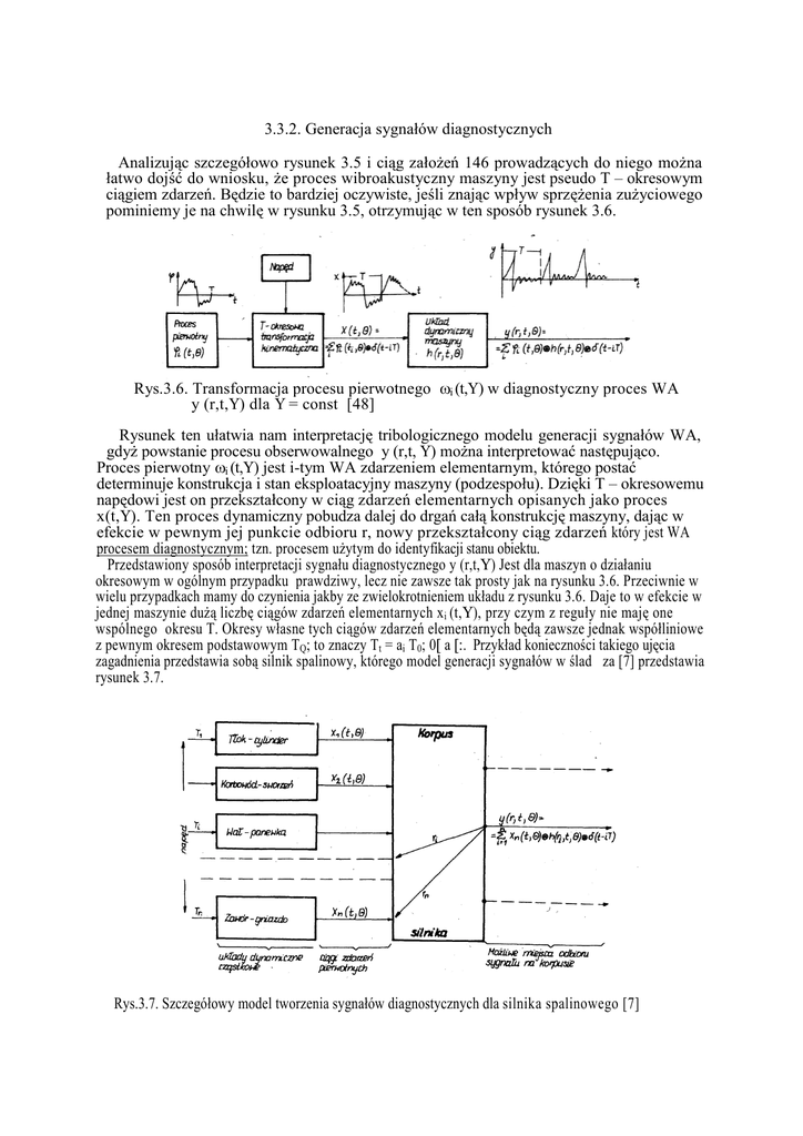3.3.2. Generacja sygnałów diagnostycznych Analizując szczegółowo rysunek 3.5 i ciąg założeń 146 prowadzących do niego można łatwo dojść do wniosku, że proces wibroakustyczny maszyny jest pseudo T – okresowym ciągiem zdarzeń. Będzie to bardziej oczywiste, jeśli znając wpływ sprzężenia zużyciowego pominiemy je na chwilę w rysunku 3.5, otrzymując w ten sposób rysunek 3.6. Rys.3.6. Transformacja procesu pierwotnego ωi (t,Υ) w diagnostyczny proces WA y (r,t,Υ) dla Υ = const [48] Rysunek ten ułatwia nam interpretację tribologicznego modelu generacji sygnałów WA, gdyż powstanie procesu obserwowalnego y (r,t, Υ) można interpretować następująco. Proces pierwotny ωi (t,Υ) jest i-tym WA zdarzeniem elementarnym, którego postać determinuje konstrukcja i stan eksploatacyjny maszyny (podzespołu). Dzięki T – okresowemu napędowi jest on przekształcony w ciąg zdarzeń elementarnych opisanych jako proces x(t,Υ). Ten proces dynamiczny pobudza dalej do drgań całą konstrukcję maszyny, dając w efekcie w pewnym jej punkcie odbioru r, nowy przekształcony ciąg zdarzeń który jest WA procesem diagnostycznym; tzn. procesem użytym do identyfikacji stanu obiektu. Przedstawiony sposób interpretacji sygnału diagnostycznego y (r,t,Υ) Jest dla maszyn o działaniu okresowym w ogólnym przypadku prawdziwy, lecz nie zawsze tak prosty jak na rysunku 3.6. Przeciwnie w wielu przypadkach mamy do czynienia jakby ze zwielokrotnieniem układu z rysunku 3.6. Daje to w efekcie w jednej maszynie dużą liczbę ciągów zdarzeń elementarnych xi (t,Υ), przy czym z reguły nie maję one wspólnego okresu T. Okresy własne tych ciągów zdarzeń elementarnych będą zawsze jednak współliniowe z pewnym okresem podstawowym TQ; to znaczy Tt = ai T0; 0[ a [:. Przykład konieczności takiego ujęcia zagadnienia przedstawia sobą silnik spalinowy, którego model generacji sygnałów w ślad za [7] przedstawia rysunek 3.7. Rys.3.7. Szczegółowy model tworzenia sygnałów diagnostycznych dla silnika spalinowego [7] Jak wynika z rysunku 3.7 i zamieszczonego tam wzoru sygnał diagnostyczny odbierany w dowolnym miejscu konstrukcji silnika Jest ważoną sumą jej odpowiedzi na wszystkie zdarzenia elementarne xi (t,Υ). przy czym jako wagi występują tu sploty z impulsowymi funkcjami przejścia h (ri,t,Υ) od miejsca generacji do odbioru sygnału diagnostycznego. Widać więc, że w wielu przypadkach szczegółowych modeli generacji modele te, a tym bardziej sygnały, mogą być bardzo złożone, niosąc ogromną ilość informacji; nie zawsze przydatnych do określonego celu diagnozowania. Takim skrajnym przykładem są tu drgania korpusu silnika odrzutowego z wielostopniową turbiną i sprężarką z wieloma agregatami pomocniczymi zwarto zabudowanymi w jedną całość. Wyróżnienie tutaj sygnału charakterystycznego, np. łożyska oporowego turbiny, jest sprawą bardzo trudną. Jednak w pewnych przypadkach diagnostyki maszyn udaje się wyodrębnić sygnał diagnostyczny Jako ciąg zdarzeń o stosunkowo niewielkich zniekształceniach z tytułu przejścia przez układy dynamiczne pośrednie. Z sytuację taką mamy do czynienia w silnikach spalinowych przy ocenie zjawisk zachodzących w układzie tłok – cylinder – zawory. Do oceny stanu tego układu funkcjonalnego można w pierwszym podejściu wybrać jako sygnały diagnostyczne trzy procesy WA: l) pulsację podciśnienia w gardzieli gaźnika, 2) pulsację ciśnienia w skrzyni korbowej, 3) pulsację nadciśnienia w okolicy rury wydechowej. W każdym z tych procesów, zwłaszcza l) i 2) sygnał diagnostyczny niewiele odbiega od elementarnego ciągu zdarzeń i jako taki niesie duży ładunek informacji selektywnej o interesującym nas podukładzie. W pierwszym sygnale informacje te dotyczą szczelności w układzie cylindrów i stanu zaworów wlotowych, w drugim – szczelności cylindrów, w trzecim stanu całego układu łącznie z jakością procesu spalania. Zainteresowanych tą problematyką odsyłamy do monografii [7] oraz prac szczegółowych [49,50]. Ostatni przykład pulsacji medium w silniku spalinowym unaocznił nam problem wyboru właściwego procesu WA dla diagnozowania określonej cechy maszyn. Informacja o szczelności cylindrów jest tu niesiona przez każdą z pulsacji 1), 2), 3) i należałoby obiektywnie ocenić zawartość informacji o interesującej nas własności w określonym sygnale WA. Problemem tym zajmiemy się niżej.
