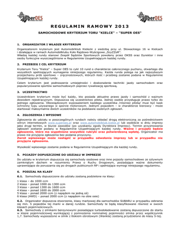 REGULAMIN RAMOWY 2013 SAMOCHODOWE KRYTERIUM TORU "KIELCE" – "SUPER OES" 1. ORGANIZATOR I WŁADZE KRYTERIUM Organizatorem kryterium jest Automobilklub Kielecki z siedzibą przy ul. Słowackiego 16 w Kielcach i działające w ramach Automobilklubu Koło Rajdowo-Wyścigowe „ScyZZoR”. Władzę każdej rundy stanowi Zespół Sędziów Sportowych powołany przez OKSS oraz Dyrektor i inne osoby funkcyjne wyszczególnione w Regulaminie Uzupełniającym każdej rundy. 2. PRZEBIEG I CEL KRYTERIUM Kryterium Toru "Kielce" – Super OES to cykl 10 rund o charakterze całorocznego pucharu, otwartego dla wszystkich spełniających wymagania niniejszego regulaminu. Każda runda polega na jak najszybszym przejechaniu prób sportowo – zręcznościowych, których ilość i przebieg zostanie podana w Regulaminie Uzupełniającym każdej rundy. Celem kryterium jest podnoszenie umiejętności i doskonalenie techniki jazdy samochodem oraz popularyzowanie sportów samochodowych poprzez rywalizację sportową. 3. UCZESTNICTWO Uczestnikiem kryterium może być każdy, kto posiada aktualne prawo jazdy i samochód z ważnym dowodem rejestracyjnym. Dopuszcza się uczestnictwo pilota. Jednej osobie przysługuje prawo tylko do jednego zgłoszenia. Obowiązkowym wyposażeniem każdego uczestnika /również pilota/ musi być kask ochronny typu używanego w sporcie motorowym. Jednym pojazdem – w charakterze kierowcy - może startować maksymalnie dwóch uczestników na podstawie osobnych zgłoszeń. 4. ZGŁOSZENIA I WPISOWE Zgłoszenia do udziału w poszczególnych rundach należy składać drogą elektroniczną za pośrednictwem witryn internetowych www.superoes.pl oraz www.automobilklub.kielce.pl lub osobiście w dniu imprezy jako drugi termin, w biurze zawodów (po uzyskaniu zgody Dyrektora Imprezy). Termin przyjmowania zgłoszeń zostanie podany w Regulaminie Uzupełniającym każdej rundy. Ważne i przyjęte będzie zgłoszenie, które ma wypełnione wszystkie rubryki oraz potwierdzoną wpłatę. Organizator ma prawo nie przyjęcia zgłoszenia bez podania przyczyny. Zwrot wpisowego może nastąpić w przypadku odwołania imprezy lub w przypadku nie przyjęcia zgłoszenia. Wysokość wpisowego zostanie podana w Regulaminie Uzupełniającym dla każdej rundy. 5. POJAZDY DOPUSZCZONE DO UDZIAŁU W IMPREZIE Do udziału w kryterium dopuszcza się samochody osobowe oraz inne pojazdy samochodowe ze sztywnym zamkniętym dachem w rozumieniu Prawa o Ruchu Drogowym, posiadające ważne dokumenty uprawniające do poruszania się po drogach publicznych RP i spełniające wymogi niniejszego regulaminu. 6. PODZIAŁ NA KLASY 6.1. Samochody dopuszczone do udziału zostaną podzielone na klasy: 1 2 3 4 5 6 klasa klasa klasa klasa klasa klasa – do 1000 ccm – ponad 1000 do 1300 ccm – ponad 1300 do 1600 ccm – ponad 1600 do 2000 ccm – ponad 2000 ccm (z napędem na jedną oś) (AWD) – ponad 2000 ccm (z napędem na obie osie) 6.2. Organizator dopuszcza stworzenie, klasy markowej dla samochodów SUBARU w przypadku zebrania się min. 5 pojazdów tej marki w danej rundzie. Samochody te będą klasyfikowane również w swoich klasach pojemnościowych. 6.3. Samochody z silnikami benzynowymi posiadające turbodoładowanie zostaną dopuszczone do startu w klasie pojemnościowej wynikającej z pomnożenia nominalnej pojemności silnika przez współczynnik 1,7. Samochody wyposażone w silnik z tłokiem obrotowym (Wankla) zostaną przydzielone do klasy 5-tej. 6.4. Klasę stanowi minimum 5 samochodów. W przypadku zgłoszenia mniej niż pięciu kierowców w danej klasie pojemnościowej, startującym w niej zostanie przydzielona połowa punktów w klasyfikacji końcowej sezonu. 6.5. Organizator wprowadza dodatkową klasyfikację w dla samochodów z napędem na przednią oś (FWD) i napędem na tylną oś (RWD). 6.6. Dopuszcza się udział zawodników z licencją sportową, na ogólnych zasadach przyjętych w niniejszym regulaminie. Nie będzie tworzona klasa "GOŚĆ". 7. BADANIE KONTROLNE (BK) I OZNAKOWANIE STARTUJĄCYCH SAMOCHODÓW 7.1. Samochody zgłoszone do każdej rundy muszą być przedstawione do kontroli w miejscu i czasie podanym przez organizatora. W czasie BK musi być obecny kierowca. 7.2. Samochód niespełniający wymogów regulaminu nie zostanie dopuszczony do startu. 7.3. Samochód przedstawiony do BK musi być oznakowany numerami startowymi i wymaganą reklamą obowiązkową. 7.4. Samochód musi być sprawny technicznie, a kierowca obowiązany jest przedstawić wszystkie dokumenty uprawniające do prowadzenia pojazdu i dopuszczające do ruchu po drogach publicznych. 7.5. Samochód musi być czysty zarówno na zewnątrz jak i wewnątrz oraz posiadać czystą komorę silnika. 7.6. W czasie BK kierowca musi okazać kask ochronny typu używanego w sportach motorowych dla siebie i pilota. 7.7. Samochody niezgodne z homologacją producenta i Rozporządzeniem Ministra Infrastruktury w zakresie dopuszczenia do ruchu muszą odpowiadać przepisom Załącznika J do MKS, w szczególności dotyczy to układów i wyposażenia bezpieczeństwa. 8. OBOWIĄZKI STARTUJĄCYCH 8.1. Przez podpisanie zgłoszenia startujący zobowiązuje się do całkowitego podporządkowania przepisom regulaminu oraz poleceniom i instrukcjom wydanym przez kierownictwo każdej rundy zarówno poprzez komunikaty jak i inne formy przekazu. 8.2. Pod rygorem niedopuszczenia do startu lub wykluczenia startujący zobowiązany jest do: wypełnienia i podpisania zgłoszenia udziału w imprezie, wniesienia opłaty wpisowego, obecności na odprawie uczestników i zgłoszenia się do BK, stawienia się na start zgodnie z miejscem na liście startowej (pod groźbą 5s kary czasowej), jazdy w zapiętych pasach bezpieczeństwa i kasku ochronnym podczas odbywania prób, sportowego zachowania się podczas trwania imprezy. 9. PUNKTACJA I KARY 0,01 sek. czasu trwania próby - 0,01 pkt. karnego, przewrócenie lub przesunięcie poza obrys słupka lub opony - 5 pkt. karnych,