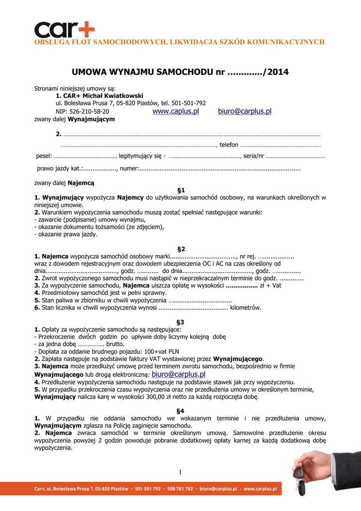 OBSŁUGA FLOT SAMOCHODOWYCH, LIKWIDACJA SZKÓD KOMUNIKACYJNYCH UMOWA WYNAJMU SAMOCHODU nr …........../2014 Stronami niniejszej umowy są: 1. CAR+ Michał Kwiatkowski ul. Bolesława Prusa 7, 05-820 Piastów, tel. 501-501-792 NIP: 526-210-58-20 www.caplus.pl zwany dalej Wynajmującym [email protected] 2. ............................................................................................................................. ........................................................................... …......................................................................................................................., pesel: ................................................, legitymujący się - telefon ............................................................... …......................................................, seria/nr .............................................. prawo jazdy kat.:.................., numer:........................................................................................ zwany dalej Najemcą §1 1. Wynajmujący wypożycza Najemcy do użytkowania samochód osobowy, na warunkach określonych w niniejszej umowie. 2. Warunkiem wypożyczenia samochodu muszą zostać spełniać następujące warunki: - zawarcie (podpisanie) umowy wynajmu, - okazanie dokumentu tożsamości (ze zdjęciem), - okazanie prawa jazdy. §2 1. Najemca wypożycza samochód osobowy marki...................................., nr rej. …................. wraz z dowodem rejestracyjnym oraz dowodem ubezpieczenia OC i AC na czas określony od dnia......................................., godz. …......... do dnia......................................, godz. …............. 2. Zwrot wypożyczonego samochodu musi nastąpić w nieprzekraczalnym terminie do godz. ............. 3. Za wypożyczenie samochodu, Najemca uiszcza opłatę w wysokości ................. zł + Vat 4. Przedmiotowy samochód jest w pełni sprawny. 5. Stan paliwa w zbiorniku w chwili wypożyczenia …................................ 6. Stan licznika w chwili wypożyczenia wynosi ...................................... kilometrów. §3 1. Opłaty za wypożyczenie samochodu są następujące: - Przekroczenie dwóch godzin po upływie doby liczymy kolejną dobę - za jedna dobę ……………. brutto. - Dopłata za oddanie brudnego pojazdu: 100+vat PLN 2. Zapłata następuje na podstawie faktury VAT wystawionej przez Wynajmującego. 3. Najemca może przedłużyć umowę przed terminem zwrotu samochodu, bezpośrednio w firmie Wynajmującego lub drogą elektroniczną: [email protected] 4. Przedłużenie wypożyczenia samochodu następuje na podstawie stawek jak przy wypożyczeniu. 5. W przypadku przekroczenia czasu wypożyczenia oraz nie przedłużenia umowy w określonym terminie, Wynajmujący nalicza karę w wysokości 300,00 zł netto za każdą rozpoczęta dobę. §4 1. W przypadku nie oddania samochodu we wskazanym terminie i nie przedłużenia umowy, Wynajmującym zgłasza na Policję zaginięcie samochodu. 2. Najemca zwraca samochód w terminie określonym umową. Samowolne przedłużenie okresu wypożyczenia powyżej 2 godzin powoduje pobranie dodatkowej opłaty karnej za każdą dodatkową dobę wypożyczenia. 1 OBSŁUGA FLOT SAMOCHODOWYCH, LIKWIDACJA SZKÓD KOMUNIKACYJNYCH §5 1. W przypadku powstania szkody w pojeździe poniżej kwoty 500 złotych Najemca ponosi odpowiedzialność finansową. Natomiast w przypadku szkody opiewającej na kwotę powyżej 500 złotych Najemca pokrywa 10% kosztów naprawy poniesionych przez Wynajmującego. 5. W przypadku uszkodzenia lub straty samochodu Najemca jest zobowiązany do natychmiastowego powiadomienia Wynajmującego o zaistniałym fakcie. 6. Jeżeli uszkodzenie nastąpiło w wyniku kolizji drogowej, Najemca zobowiązany jest do jak najszybszego skontaktowania się z Wynajmującym, powiadomienia Policji, uzyskania oświadczenia sprawcy, jeśli kolizja nastąpiła z winy osób trzecich oraz zabezpieczenia samochodu. §6 1. Najemca zobowiązuje się do pełnej odpowiedzialności oraz pokrycia ewentualnych szkód wynikłych z prowadzenia pojazdu w stanie nietrzeźwym, lub pod wpływem narkotyków oraz środków farmakologicznych uniemożliwiających prowadzenie samochodu. 2. Samochód nie ma prawa opuszczać granic Rzeczypospolitej Polskiej bez zgody Wynajmującego. W przypadku odnotowania faktu opuszczenia granicy Państwa Rzeczypospolitej zostanie naliczona kara w wysokości 10 000,00zł. 3. W przypadku kiedy Najemca chce poruszać się wypożyczonym samochodem poza granicami Polski musi uzyskać pisemną zgodę Wynajmującego. 4. Najemca ponosi pełną odpowiedzialność za szkody wyrządzone przez osoby trzecie którym udostępni wypożyczony pojazd. 5. Wewnątrz wynajmowanych pojazdów obowiązuje całkowity zakaz palenia tytoniu. §7 1. W przypadku nie wywiązania się z warunków niniejszej umowy i powstania zobowiązania po stronie Najemcy, ponosi on koszty windykacji roszczenia prowadzonej przez wynajętą przez Wynajmującego kancelarię prawną. 2. W sprawach nieuregulowanych niniejszą umową mają zastosowanie właściwe przepisy Kodeksu Cywilnego. 3. Sądem właściwym do rozpoznania ewentualnych sporów wynikających z niniejszej umowy jest Sąd Rejonowy w Gorzowie Wielkopolskim. 4. Niniejszą umowę sporządzono w dwóch jednobrzmiących egzemplarzach po jednym dla każdej ze Stron. 5. Strony oświadczają, że akceptują postanowienia niniejszej umowy, nie wnoszą zastrzeżeń do jej zapisów i zgodnie z wolą podpisują ją. WYNAJMUJĄCY NAJEMCA POTWIERDZENIE ZWROTU POJAZDU Zwrotu samochodu dokonano dnia …................. o godz. …............, stan licznika …............... km. UWAGI:............................................................................................................................................. WYNAJMUJĄCY NAJEMCA UWAGI:..................................................................................................