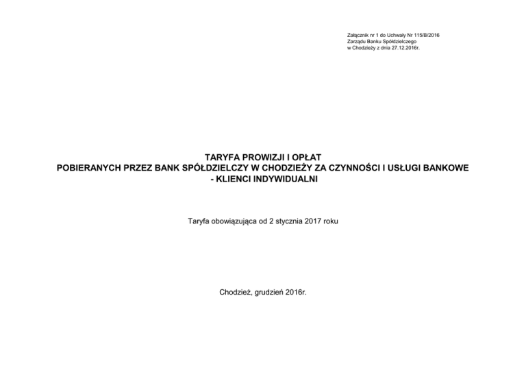 Załącznik nr 1 do Uchwały Nr 115/B/2016 Zarządu Banku Spółdzielczego w Chodzieży z dnia 27.12.2016r. TARYFA PROWIZJI I OPŁAT POBIERANYCH PRZEZ BANK SPÓŁDZIELCZY W CHODZIEŻY ZA CZYNNOŚCI I USŁUGI BANKOWE - KLIENCI INDYWIDUALNI Taryfa obowiązująca od 2 stycznia 2017 roku Chodzież, grudzień 2016r. SPIS TREŚCI DZIAŁ I. POSTANOWIENIA OGÓLNE DZIAŁ II. USŁUGI DLA KLIENTÓW INDYWIDUALNYCH 2 Taryfa I. Obsługa rachunków oszczędnościowo-rozliczeniowych 3 Taryfa II. Rachunki oszczędnościowe 5 Taryfa III. Rachunki oszczędnościowe z wkładami płatnymi na każde żądanie 7 Taryfa IV. Rachunki w walutach wymienialnych 8 Taryfa V. Rachunki terminowych lokat oszczędnościowych, rachunki wkładów oszczędnościowych gromadzonych systematycznie 9 Taryfa VI. Usługi bankowości elektronicznej 11 Taryfa VII. Karty płatnicze 13 Taryfa VIII. Kredyty i pożyczki 17 Taryfa IX. Pozostałe opłaty 19 Taryfa X. Produkty i usługi wycofane z oferty Banku 20 XII/16 3 1 DZIAŁ I. POSTANOWIENIA OGÓLNE 1. Bank Spółdzielczy w Chodzieży pobiera prowizje i opłaty za czynności i usługi bankowe od klientów indywidualnych zgodnie z niniejszą "Taryfą prowizji i opłat pobieranych przez Bank Spółdzielczy w Chodzieży za czynności i usługi bankowe - Klienci Indywidualni" zwanej dalej "Taryfą". 2. Pojęcia stosowane w niniejszej Taryfie oznaczają: 1) Bank/BS - Bank Spółdzielczy w Chodzieży, 2) elektroniczny kanał dostępu - sposób komunikacji posiadacza rachunku z Bankiem lub Banku z posiadaczem na odległość, za pośrednictwem sieci teleinformatycznej lub urządzeń elektronicznych, udostępniany na podstawie odrębnej umowy, 3) pakiet taryfowy - zdefiniowane w Taryfie opłaty i prowizje dla poszczególnych grup Klientów, 4) SGB (Spółdzielcza Grupa Bankowa) - zrzeszenie, które tworzą SGB-Bank S.A. oraz banki spółdzielcze, które zawarły z nim umowę zrzeszenia, 5) środek identyfikacji elektronicznej - zabezpieczenia, przy użyciu których Bank uniemożliwia dostęp do Systemu osobom nieuprawnionym (np. identyfikatory, hasła, hasła jednorazowe, e-tokeny, itp.). 3. Prowizje i opłaty ustalane są w złotych. 4. Kwoty prowizji podlegają zaokrągleniu na zasadach ogólnie obowiązujących. 5. Nie pobiera się prowizji i opłat od: 1) wpłat na cele charytatywne, 2) operacji związanych ze spłatą wierzytelności Banku Spółdzielczego w Chodzieży, bez względu na ich formę. 6. Wszelkie prowizje i opłaty bankowe pokrywa zleceniodawca operacji bankowej, o ile strony nie ustaliły inaczej. 7. Prowizje i opłaty pobierane są poprzez obciążenie rachunku na podstawie udzielonej przez Klienta dyspozycji lub poprzez przyjęcie wpłaty gotówkowej albo bezgotówkowej. 8. Prowizje i opłaty za czynności i usługi bankowe księgowane są w ciężar rachunku, którego dotyczą; w uzasadnionych przypadkach dopuszcza się zaksięgowanie prowizji/opłaty w ciężar innego rachunku Klienta, zgodnie z dyspozycją Klienta. 9. Prowizje i opłaty pobierane są zgodnie z trybem określonym w poszczególnych rozdziałach: 1) niezwłocznie, w dniu złożenia albo wykonania dyspozycji, 2) cyklicznie, 3) w innych terminach wskazanych w niniejszej Taryfie lub umowach zawartych pomiędzy Klientem a Bankiem. 10. Opłaty miesięczne nie są pobierane w miesiącu rozpoczęcia oraz w miesiącu zakończenia korzystania z usługi świadczonej przez Bank. 11. Opłaty roczne pobrane z góry od Klientów są zwracane w części za niewykorzystany okres, jeżeli Klient zrezygnował z usługi przed upływem roku od pobrania opłaty. 12. Klienci indywidualni mogą wybrać dowolny pakiet taryfowy, z zastrzeżeniem pakietu Debiut - przeznaczonego dla klientów indywidualnych do 30 roku życia, w przypadku rachunku wspólnego, wskazany warunek muszą spełniać wszyscy współposiadacze. 13. Bank nie pobiera opłat i prowizji za czynności i usługi wykonywane z inicjatywy Banku. 14. Zasady przeliczania transakcji w walutach obcych zrealizowanych kartami płatniczymi określone są w regulaminach funkcjonowania poszczególnych kart płatniczych. 15. Prowizje za operacje zrealizowane kartami płatniczymi za granicą ustalane są od kwoty transakcji wyrażonej w złotych, po jej przeliczeniu na zasadach określonych w regulaminach funkcjonowania poszczególnych kart płatniczych. 16. W indywidualnych przypadkach dopuszcza się możliwość stosowania innych prowizji i opłat niż przewidzianych w Taryfie. Ustalanie indywidualnych prowizji i opłat odbywa się na wniosek Klienta, decyzję podejmuje Zarząd Banku. Indywidualne warunki określa umowa z Klientem. 17. Przesłanki i tryb zmiany niniejszej Taryfy wskazane są w regulaminach albo umowach funkcjonowania poszczególnych usług bankowych znajdujących się w ofercie Banku Spółdzielczego w Chodzieży. XII/16 2 KLIENCI INDYWIDUALNI Taryfa obowiązująca od 2 stycznia 2017r. Dział II. Usługi dla klientów indywidualnych TARYFA I Obsługa rachunków oszczędnościowo-rozliczeniowych L.p. Wyszczególnienie czynności 1 1. Otwarcie i prowadzenie rachunku: 1) otwarcie rachunku 2 2) prowadzenie rachunku1) 2. Wpłaty gotówkowe na rachunek: 1) dokonywane w placówce Banku 2) dokonywane w urządzeniach samoobsługowych Banku 3. Wypłaty gotówkowe z rachunku dokonywane w placówce Banku 4. Realizacja przelewów: 1) złożonych w formie papierowej: a) na rachunki prowadzone w Banku 3 Pakiet DEBIUT (dotychczasowy Pakiet "Młodzieżowy") 4 Pakiet KOMFORT (dotychczasowy Pakiet "Standard") 5 miesięcznie bez opłat bez opłat Tryb pobierania opłaty - b) na rachunki prowadzone w innym banku, w tym na rachunki ZUS i organów podatkowych c) na rachunki prowadzone w innym banku – realizowane w systemie Express Elixir 2) złożonych za pośrednictwem elektronicznych kanałów dostępu www Internet Banking: a) na rachunki prowadzone w Banku b) na rachunki prowadzone w innym banku, w tym na rachunki ZUS i organów podatkowych: - lista haseł jednorazowych - e