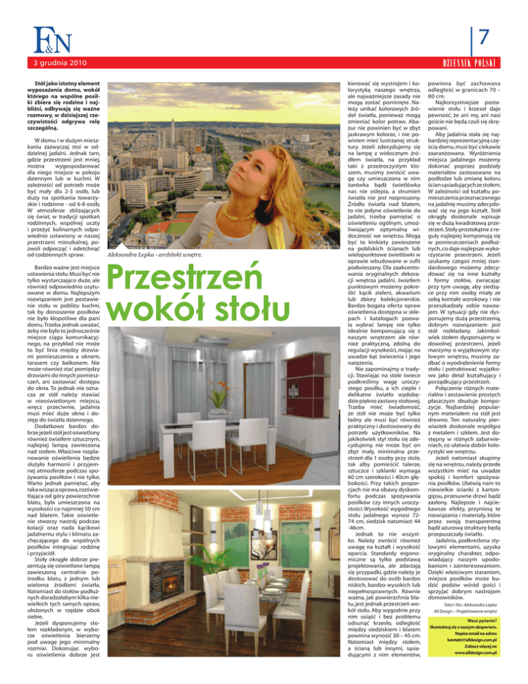 7 3 grudnia 2010 Stół jako istotny element wyposażenia domu, wokół którego na wspólne posiłki zbiera się rodzina i najbliżsi, odbywają się ważne rozmowy, w dzisiejszej rzeczywistości odgrywa rolę szczególną. W domu i w dużym mieszkaniu zazwyczaj stoi w oddzielnej jadalni. Jednak tam, gdzie przestrzeni jest mniej, można wygospodarować dla niego miejsce w pokoju dziennym lub w kuchni. W zależności od potrzeb może być mały dla 2-3 osób, lub duży na spotkania towarzyskie i rodzinne - od 6-8 osób. W atmosferze zbliżających się świat, w tradycji spotkań rodzinnych, wspólnej uczty i przeżyć kulinarnych odpowiednio ustawiony w naszej przestrzeni mieszkalnej, pozwoli odpocząć i odetchnąć od codziennych spraw. Bardzo ważne jest miejsce ustawienia stołu. Musi być nie tylko wystarczająco duże, ale również odpowiednio usytuowane w domu. Najlepszym rozwiązaniem jest postawienie stołu w pobliżu kuchni, tak by donoszenie posiłków nie było kłopotliwe dla pani domu. Trzeba jednak uważać, żeby nie było to jednocześnie miejsce ciągu komunikacyjnego, na przykład nie może to być linia między drzwiami pomieszczenia a oknem, tarasem czy balkonem. Nie może również stać pomiędzy drzwiami do innych pomieszczeń, ani zastawiać dostępu do okna. To jednak nie oznacza ze stół należy stawiać w nieoświetlonym miejscu, wręcz przeciwnie, jadalnia musi mieć duże okno i dostęp do światła dziennego. Dodatkowo bardzo dobrze jeżeli stół jest oświetlony również światłem sztucznym, najlepiej lampą zawieszoną nad stołem. Właściwe rozplanowanie oświetlenia będzie służyło harmonii i przyjemnej atmosferze podczas spożywania posiłków i nie tylko. Warto jednak pamiętać, aby taka wisząca oprawa, rozświetlająca od góry powierzchnie blatu, była umieszczona na wysokości co najmniej 50 cm nad blatem. Takie oświetlenie stworzy nastrój podczas kolacji oraz nada kącikowi jadalnemu stylu i klimatu zachęcającego do wspólnych posiłków integrując rodzinę i przyjaciół. Stoły okrągłe dobrze prezentują się oświetlone lampą zawieszoną centralnie pośrodku blatu, z jednym lub wieloma źródłami światła. Natomiast do stołów podłużnych doradzałabym kilka niewielkich tych samych opraw, ułożonych w rzędzie obok siebie. Jeżeli dysponujemy stołem rozkładanym, w wyborze oświetlenia bierzemy pod uwagę jego minimalny rozmiar. Dokonując wyboru oświetlenia dobrze jest a Przestrzeń wokół stołu Aleksandra Lepka - architekt wnętrz. kierować się wystrojem i kolorystyką naszego wnętrza, ale najważniejsze zasady nie mogą zostać pominięte. Należy unikać kolorowych źródeł światła, ponieważ mogą zmieniać kolor potraw. Abażur nie powinien być w zbyt jaskrawym kolorze, i nie powinien mieć lustrzanej struktury. Jeżeli zdecydujemy się na lampę z widocznym źródłem światła, na przykład taki z przeźroczystym kloszem, musimy zwrócić uwagę czy umieszczona w nim żarówka bądź świetlówka nas nie oślepia, a strumień światła nie jest rozproszony. Źródło światła nad blatem, to nie jedyne oświetlenie do jadalni, trzeba pamiętać o oświetleniu ogólnym, umożliwiającym optymalną widoczność we wnętrzu. Mogą być to kinkiety zawieszone na pobliskich ścianach lub wielopunktowe świetlówki w oprawie wbudowane w sufit podwieszany. Dla zaakcentowania oryginalnych dekoracji wnętrza jadalni, światłem punktowym możemy pokreślić kącik zieleni, akwarium lub zbiory kolekcjonerskie. Bardzo bogata oferta opraw oświetlenia dostępna w sklepach i katalogach pozwala wybrać lampę nie tylko idealnie komponującą się z naszym wnętrzem ale również praktyczną, zdolną do regulacji wysokości, mając na uwadze kąt świecenia i jego natężenia. Nie zapominajmy o tradycji. Stawiając na stole świece podkreślimy wagę uroczystego posiłku, a ich cieple i delikatne światło wydobędzie piękno zastawy stołowej. Trzeba mieć świadomość, że stół nie może być tylko ładny ale musi być również praktyczny i dostosowany do potrzeb użytkowników. Na jakikolwiek styl stołu się zdecydujemy, nie może być on zbyt mały, minimalna przestrzeń dla 1 osoby przy stole, tak alby pomieścić talerze, sztuczce i szklanki wymaga 60 cm szerokości i 40cm głębokości. Przy takich proporcjach nie ma obawy dyskomfortu podczas spożywania posiłków czy innych uroczystości. Wysokość wygodnego stołu jadalnego wynosi 7274 cm, siedzisk natomiast 44 -46cm. Jednak to nie wszystko. Należy zwrócić również uwagę na kształt i wysokość oparcia. Standardy ergonomiczne są tylko podstawą projektowania, ale zdarzają się przypadki, gdzie należy je dostosować do osób bardzo niskich, bardzo wysokich lub niepełnosprawnych. Równie ważna, jak powierzchnia blatu, jest jednak przestrzeń wokół stołu. Aby wygodnie przy nim usiąść i bez problemu odsunąć krzesło, odległość między siedziskiem i blatem powinna wynosić 30 – 45 cm. Natomiast między stołem, a ścianą lub innymi, sąsiadującymi z nim elementów, powinna być zachowana odległość w granicach 70 – 80 cm. Najkorzystniejsze postawienie stołu i krzeseł daje pewność, że ani my, ani nasi goście nie będą czuli się skrępowani. Aby jadalnia stała się najbardziej reprezentacyjną częścią domu, musi być ciekawie zaaranżowana. Wyróżnienia miejsca jadalnego możemy dokonać poprzez podziały materiałów zastosowane na podłodze lub zmianę koloru ścian sąsiadujących ze stołem. W zależności od kształtu pomieszczenia przeznaczonego na jadalnię musimy zdecydować się na jego kształt. Stół okrągły doskonale wpisuje się w dużą kwadratową przestrzeń. Stoły prostokątne z reguły najlepiej komponują się w pomieszczeniach podłużnych, co daje najlepsze wykorzystanie przestrzeni. Jeżeli szukamy czegoś mniej standardowego możemy zdecydować się na inne kształty i formy stołów, zwr