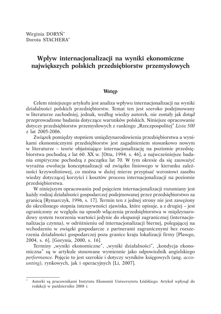 Wirginia Doryń* Dorota Stachera* Wpływ internacjonalizacji na wyniki ekonomiczne największych polskich przedsiębiorstw przemysłowych Wstęp Celem niniejszego artykułu jest analiza wpływu internacjonalizacji na wyniki działalności polskich przedsiębiorstw. Temat ten jest szeroko podejmowany w literaturze zachodniej, jednak, według wiedzy autorek, nie zostały jak dotąd przeprowadzone badania dotyczące warunków polskich. Niniejsze opracowanie dotyczy przedsiębiorstw przemysłowych z rankingu „Rzeczpospolitej” Lista 500 z lat 2005-2006. Związek pomiędzy stopniem umiędzynarodowienia przedsiębiorstwa a wynikami ekonomicznymi przedsiębiorstw jest zagadnieniem stosunkowo nowym w literaturze – teorie objaśniające internacjonalizację na poziomie przedsiębiorstwa pochodzą z lat 60. XX w. [Otta, 1994, s. 46], a najwcześniejsze badania empiryczne pochodzą z początku lat 70. W tym okresie da się zauważyć wyraźna ewolucja konceptualizacji od związku liniowego w kierunku zależności krzywoliniowej, co można w dużej mierze przypisać wzrostowi zasobu wiedzy dotyczącej korzyści i kosztów procesu internacjonalizacji na poziomie przedsiębiorstwa. W niniejszym opracowaniu pod pojęciem internacjonalizacji rozumiany jest każdy rodzaj działalności gospodarczej podejmowanej przez przedsiębiorstwo za granicą [Rymarczyk, 1996, s. 17]. Termin ten z jednej strony nie jest zawężony do określonego stopnia intensywności zjawiska, które opisuje, a z drugiej – jest ograniczony ze względu na sposób włączenia przedsiębiorstwa w międzynarodowy system tworzenia wartości jedynie do ekspansji zagranicznej (internacjonalizacja czynna), w odróżnieniu od internacjonalizacji biernej, polegającej na wchodzeniu w związki gospodarcze z partnerami zagranicznymi bez rozszerzenia działalności gospodarczej poza granice kraju lokalizacji firmy [Plawgo, 2004, s. 6], [Gorynia, 2000, s. 16]. Terminy „wyniki ekonomiczne”, „wyniki działalności”, „kondycja ekonomiczna” są w artykule stosowane wymiennie jako odpowiednik angielskiego performance. Pojęcie to jest szerokie i dotyczy wyników księgowych (ang. accounting), rynkowych, jak i operacyjnych [Li, 2007]. * Autorki są pracownikami Instytutu Ekonomii Uniwersytetu Łódzkiego. Artykuł wpłynął do redakcji w październiku 2008 r. 96 GOSPODARKA NARODOWA Nr 11-12/2008 Korzyści i koszty internacjonalizacji w świetle teorii Korzyści internacjonalizacji Teoria internalizacji tłumaczy umiędzynarodowienie poprzez pryzmat korzyści z tytułu przejęcia przez przedsiębiorstwo pewnych funkcji, które wcześniej były realizowane przez niezależnych partnerów. Jest to zyskowne, jeżeli koszty transakcyjne na zewnętrznych rynkach osiągną taki poziom, że przedsiębiorstwo przeprowadzi transakcję taniej, gdy wystąpi równocześnie po obu stronach rynku, tzn. jeśli będzie „handlowało” samo ze sobą [Rymarczyk, 2004, s. 46]. Dzięki internalizacji przedsiębiorstwo może zmniejszyć wysokość ponoszonych kosztów. Oszczędności mogą powstawać dzięki unikaniu następujących zdarzeń [Giddy, 1978] za: [Buckley, 2002, s. 110]: • drogich i ryzykownych rynków surowców, • niedoskonałych rynków aktywów niematerialnych firmy, tworzonych na przykład przez marki, • niedoskonałych rynków wytworzonych dóbr powstających w skutek monopolistycznej kontroli kanałów dystrybucji, • niedoskonałych rynków produktów wynikających z nałożonych przez rząd barier, np. cła. Korzyści internacjonalizacji przypisywane są również możliwości wystąpienia korzyści skali i zakresu. Korzyści zakresu (ang. economies of scope) struktury produkcji występują, gdy dla wszystkich produktów wytwarzanych w danym przedsiębiorstwie (lub obsługiwania dwóch różnych rynków albo wykonywania dwóch różnych czynności w pionowym łańcuchu technologicznym [Otta, 1994, s. 65]) koszt łącznego ich wykonania jest niższy niż suma kosztów, gdyby produkty te wykonywać osobno [Foss, 1997, s. 104]. Wystąpienie tego efektu jest możliwe dzięki efektywniejszemu wykorzystaniu mocy produkcyjnych, sieci dystrybucji czy korzyści z informacji rynkowych. Korzyści skali (ang. economies of scale), oznaczają spadek długookresowego kosztu przeciętnego w miarę powiększania produkcji, co przekłada się na możliwość osiągnięcia większego zysku przy danej cenie lub możliwość poprawienia konkurencyjności poprzez zmniejszenie ceny produktów. Korzyści te zwiększają się z powodu występowania efektu uczenia się (ang. learning effect) oraz efektu doświadczenia (ang. experience effect) [Przybylska, 2001, s. 69]. Internacjonalizacja stwarza również możliwość niwelowania ryzyka poprzez różnicowanie składu portfela, które określa się mianem jego dywersyfikacji. Korzyść w postaci stabilizacji wpływów uzyskiwana jest dzięki możliwości Rozróżnia się tutaj korzyści skali (ang. economies of scale), które swoje źródło mają w czynnikach technologicznych, finansowych i marketingowych, od efektów skali (ang. returns to scale), których determinanty koncentrują się na aspektach technologicznych, związanych z powiększaniem nakładów wąsko pojmowanych (tradycyjnych) czynników produkcji. Por. [Kucharski, 1998]. Inaczej jest w np. [Baumol, 1986]. Wirginia Doryń, Dorota Stachera, Wpływ internacjonalizacji na wyniki ekonomiczne... 97 redukcji sumy ryzyka poprzez wykorzystanie faktu, iż wpływy z poszczególnych inwestycji (w różnych krajach) nie są ze sobą skorelowane w sposób doskonały. W handlu międzynarodowym podobny efekt można uzyskać poprzez dywersyfikację rynków działalności przedsiębiorstwa (np. w drodze eksportu), której korzyścią będzie stabilizacja wpływów ze sprzedaży w skali całego przedsiębiorstwa [Hirsch, Lev, 1971]. Pomimo faktu, iż niestabilność warunków dotyczy w większym stopniu rynków zagranicznych niż krajowego, eksport moż
