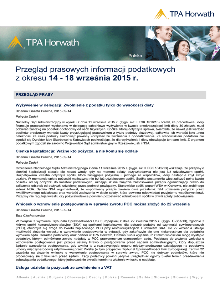 Przegląd prasowych informacji podatkowych z okresu 14 - 18 września 2015 r. PRZEGLĄD PRASY Wyżywienie w delegacji: Zwolnienie z podatku tylko do wysokości diety Dziennik Gazeta Prawna, 2015-09-14 Patrycja Dudek Naczelny Sąd Administracyjny w wyroku z dnia 11 września 2015 r. (sygn. akt II FSK 1516/13) orzekł, że pracodawca, który finansuje pracownikowi wysłanemu w delegację całodniowe wyżywienie w kwocie przekraczającej limit diety 30 złotych, musi pobierać zaliczkę na podatek dochodowy od osób fizycznych. Spółka, której dotyczyła sprawa, twierdziła, że nawet jeśli wartość posiłków przekroczy wartość kwoty przysługującej pracownikom z tytułu podróży służbowej, całkowita ich wartość jako „inne należności za czas podróży służbowej” powinny korzystać ze zwolnienia z opodatkowania. Ze stanowiskiem podatnika nie zgodził się Dyrektor Izby Skarbowej w Katowicach podkreślając, że dla wyżywienia i diety obowiązuje ten sam limit. Z organem podatkowym zgodził się zarówno Wojewódzki Sąd administracyjny w Rzeszowie, jak i NSA. Cienka kapitalizacja: Ważne kto pożycza, a nie komu się oddaje Dziennik Gazeta Prawna, 2015-09-14 Patrycja Dudek Orzeczenie Naczelnego Sądu Administracyjnego z dnia 11 września 2015 r. (sygn. akt II FSK 1842/13) wskazuje, że przepisy o cienkiej kapitalizacji stosuje się nawet wtedy, gdy na moment spłaty pożyczkodawca nie jest już udziałowcem spółki. Rozpatrywana kwestia dotyczyła spółki, która zaciągnęła pożyczkę u jednego ze wspólników, który następnie zbył swoje udziały. W momencie spłaty pożyczki mężczyzna nie był już udziałowcem spółki. Spółka postanowiła więc zaliczyć pełną kwotę odsetek od tej pożyczki do kosztów podatkowych, uznając, iż nie znajdzie zastosowania przepis ograniczający prawo do zaliczenia odsetek od pożyczki udzielonej przez podmiot powiązany. Stanowisko spółki poparł WSA w Krakowie, nie zrobił tego jednak NSA. Sędzia NSA argumentował, że wspominany przepis zawiera dwie przesłanki: fakt udzielenia pożyczki przez kwalifikowanego udziałowca oraz wartość zadłużenia w dacie spłaty, która powinna odpowiadać przyjętemu współczynnikowi. Przepisy nie regulują kwestii, czy pożyczkodawca powinien pozostawać udziałowcem spółki w chwili spłaty zobowiązania. Wniosek o wznowienie postępowania w sprawie zwrotu PCC można złożyć do 22 września Dziennik Gazeta Prawna, 2015-09-14 Ewa Ciechanowska W związku z wyrokiem Trybunału Sprawiedliwości Unii Europejskiej z dnia 22 kwietnia 2015 r. (sygn. C-357/13), zgodnie z którym spółki komandytowo-akcyjne (SKA) są spółkami kapitałowymi dla potrzeb podatku od czynności cywilnoprawnych (PCC), otworzyła się droga do zwrotu zapłaconego PCC przy restrukturyzacjach z udziałem SKA. Do 22 września istnieje możliwość złożenia wniosku o wznowienie postępowania w sytuacji, gdy zakończyło się ono niekorzystnym dla podatnika wyrokiem sądu. Doradca podatkowy oraz partner w TPA Horwath, Damian Kubiś wyjaśnia, iż z takim wnioskiem mogą wystąpić podatnicy, którym odmówiono zwrotu nadpłaty w PCC prawomocnym orzeczeniem sądu. Podstawą do złożenia wniosku o wznowienie postępowania jest przepis ustawy Prawo o postępowaniu przed sądami administracyjnymi, który dopuszcza żądanie wznowienia postępowania, gdy wynika to z rozstrzygnięcia organu międzynarodowego działającego na podstawie umowy międzynarodowej ratyfikowanej przez Polskę (w tym przypadku Trybunał Sprawiedliwości Unii Europejskiej). Termin 22 września na złożenie wniosku o wznowienie postępowania w sprawie zwrotu PCC nie dotyczy podmiotów, które nie procesowały się z fiskusem przed sądami. Tacy podatnicy powinni jedynie uwzględniać ogólny 5-letni termin przedawnienia zobowiązania podatkowego, który jednocześnie określa termin na złożenie wniosku o nadpłatę. Usługa udzielania pożyczek ze zwolnieniem z VAT Albania | Austria | Bułgaria | Chorwacja | Czechy | Polska | Rumunia | Serbia | Słowacja | Słowenia | Węgry Rzeczpospolita, 2015-09-14 Patrycja Niemczyk Wojewódzki Sąd Administracyjny w Poznaniu w wyroku z dnia 2 lipca 2015 (sygn. akt I SA/Po 312/15) orzekł, że świadczenie usług udzielania pożyczek składające się z wielu czynności o charakterze głównym i pomocniczym jest zwolnione z VAT. Sprawa dotyczyła spółki prowadzącej działalność polegającą na udzielaniu pożyczek osobom fizycznym poza systemem bankowym. Przedsiębiorca pobierał opłaty bezpośrednio związane z udzieleniem pożyczki (prowizja za udzielenie pożyczki, opłata rejestracyjna) oraz opłaty za czynności związane z realizacją umowy tj. za wezwanie do zapłaty, windykację terenową oraz zawarcie umów w celu spłaty zadłużenia. Podatnik zwrócił się z pytaniem do organów podatkowych czy wskazane czynności stanowią kompleksową usługę udzielenia pożyczek, podlegającą zwolnieniu z VAT. W interpretacji organ stwierdził, że zwolnieniu podlegają jedynie prowizja za udzielenie pożyczki i opłata za rejestracyjna jako elementy pożyczki, a także należności z tytułu przedłużenia terminu spłaty oraz podwyższenia kwoty pożyczki jako samoistne usługi zarządzania pożyczką. Sprawa trafiła na wokandę. Sąd uchylił interpretację i uznał, że zwolnieniu powinny podlegać także czynności, za które pobierane są opłaty dodatkowe tj. wysyłanie wezwania do zapłaty, windykacja terenowa oraz zawarcie umowy w celu spłaty zadłużenia. Zmiana statusu przedsiębiorcy wpływa na wysokość zwolnienia w SSE Rzeczpospolita, 2015-09-14 Agnieszka Szymczyk W interpretacji z 30 czerwca 2015 r. Dyrektor Izby Skarbowej w Katowicach (sygn. IBPI/2/4510-379/15/MS) stanął na stanowisku, że od momentu utraty statusu MŚP należy obliczać wysokość należnej pomocy publicznej na podstawie wskaźnika intensywności właściwego dla dużych przedsiębiorstw. Sprawa dotyczy