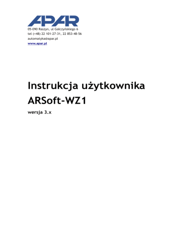 05-090 Raszyn, ul Gałczyńskiego 6 tel (+48) 22 101-27-31, 22 853-48-56 [email protected] www.apar.pl Instrukcja użytkownika ARSoft-WZ1 wersja 3.x 1. Opis Aplikacja ARSOFT-WZ1 umożliwia konfigurację i wizualizację danych pomiarowych urządzeń produkcji APAR wyposażonych w interfejs komunikacyjny RS232/485 oraz protokół MODBUS-RTU. Aktualny szczegółowy wykaz kompatybilnych urządzeń można znaleźć na stronie: www.apar.pl/oprogramowanie/arsoft-wz1.html Możliwości programu: ● automatyczna identyfikacja typu podłączonego urządzenia ● wizualizacja online wyników pomiarów szybka edycja online parametrów urządzenia ● odczyt i zapis konfiguracji urządzenia z możliwością edycji tekstowej utworzonego pliku ● 2. Wymagania sprzętowe ● system operacyjny: MS Windows 98/Me/NT/2000/XP/Vista ● procesor i ilość pamięci RAM zgodne z zaleceniami producenta systemu operacyjnego w zależności od rodzaju interfejsu komunikacyjnego podłączonego urządzenia port COM RS232 ● lub RS485, w przypadku braku portu sprzętowego można skorzystać również z dostępnych na rynku konwerterów USB na RS232/RS485, przy czym w przypadku RS485 zaleca się wykorzystanie konwerterów z separacją galwaniczną. Uwaga: Rejestratory AR2xx posiadają sterowniki jedynie dla systemu Windows 2000/XP/Vista 3. Instalacja W celu zainstalowania aplikacji należy uruchomić program „Setup_ARSOFT-WZ1_x.x.exe” (gdzie x.x to numer wersji) i postępować zgodnie z instrukcjami pojawiającymi się na ekranie. Program instalacyjny pozwala na wybór folderu docelowego (domyślnie „C:\Program Files\ARSOFT\WZ1”) oraz stworzenie skrótów w folderze Menu Start i pulpicie. Aktualną wersję instalacyjną można pobrać ze strony: www.apar.pl/download/oprogramowanie.html. Po instalacji, podczas pierwszego uruchomienia, pokaże się okno Kreatora połączenia (patrz punkt 7) umożliwiające szybką konfigurację połączenia z urządzeniem. www.apar.pl 2 4. Okno główne Okno główne zawiera elementy umożliwiające podłączenie aplikacji do sieci MODBUS-RTU oraz wizualizację pomiarów. Rozmieszczenie elementów wraz z opisem przeznaczenia zostało przedstawione na rysunku poniżej. Przycisk Od łącz Przerywa monitorowanie urządzenia oraz zamyka port COM Przycisk Podłącz Otwiera port COM i próbuje nawiązać komunikację z urządzeniem. W przypadku powodzenia rozpoczyna monitorowanie Przycisk Parametry Wyświetla okno za pomocą którego można zmienić edytować parametry podłączonego urządzenia Przycisk Opcje programu Wyświetla okno za pomocą którego można zmienić parametry transmisji, oraz inne opcje programu Panel monitorowania Podgląd wszystkich warto ści mierzonych dostępnych dla danego typu urządzenia. Nazwa typu podłączonego urządzenia wyświetlana jest w tytule panelu. Panel Log Rejestr zdarzeń oraz komunikaty b łędów Panel Status Informacje o parametrach transmisji: numer portu szeregowego, prędkość transmisji, adres MODBUS 5. Uruchamianie i inicjalizacja transmisji Po uruchomieniu program automatycznie otwiera port COM i wysyła zapytanie do urządzenia o adresie MODBUS ustawionym w oknie Opcje. W przypadku odpowiedzi urządzenia następuje rozpoznanie jego typu, wyświetlenie okien dla wszystkich wartości mierzonych dla danego wykrytego typu i rozpoczyna się monitorowanie wartości mierzonych z ustalonym okresem. W przypadku braku lub błędnej odpowiedzi możliwe są komunikaty: ● błąd otwarcia portu – port COM jest używany przez inną aplikację lub nie istnieje. Należy upewnić się czy wybrano w konfiguracji odpowiedni port lub w przypadku stosowania adapterów USB/RS lub Ethernet/RS adapter został poprawnie podłączony i skonfigurowany. ● brak odpowiedzi urządzenia – należy sprawdzić czy w urządzeniu i programie ustawiono jednakowe prędkości transmisji i adresy MODBUS. ● błędne CRC – zakłócenia linii lub dwa urządzenia w sieci MODBUS mają ustawione takie same adresy i próbują odpowiedzieć równocześnie. www.apar.pl 3 5. Opcje programu Wszystkie ustawienia konfiguracji programu i transmisji zawarte zostały w oknie Opcje. Znaczenie poszczególnych ustawień jest następujące: ● Konfiguracja portu: — — ● Nr portu COM – można wybrać dowolny numer z zakresu 1 ÷ 255; Prędkość transmisji – do wyboru prędkości 600 ÷ 11520 bit/s, przed wyborem należy sprawdzić czy wszystkie urządzenia w sieci MODBUS obsługują wybraną prędkość; Urządzenie: — — Adres MODBUS urządzenia (1 ÷ 255); Jednostka wyświetlana – nazwa jednostki wartości mierzonej wyświetlana obok okna pomiaru, nazwę można wybrać z listy lub wpisać samodzielnie, UWAGA: dotyczy tylko w przypadku gdy w podłączonym urządzeniu jako aktywne jest ustawione wejście liniowe prądowe, napięciowe lub rezystancyjne; Wejścia temperaturowe lub urządzeń z wbudowanym czujnikiem jednostka konfigurowana jest ● automatycznie; Okres monitorowania: czas pomiędzy kolejnymi zapytaniami wysyłanymi do urządzenia ● (300 ms ÷ 24 godziny); Log: możliwość włączenia zapisywania do pliku rejestru zdarzeń oraz komunikatów błędów, pliki ● zapisywane są w folderze w którym zainstalowano aplikację; Priorytet procesu: możliwość zmiany systemowego priorytetu procesu aplikacji, funkcja przydatna w przypadku krótkiego okresu monitorowania i dużej zajętości użycia procesora, UWAGA: dotyczy tylko systemów Windows 2000/XP/Vista; ● Kreator połączenia: umożliwia wywołanie okna Kreatora połączenia (patrz punkt 7). www.apar.pl 4 7. Kreator połączenia Kreator połączenia służy do szybkiego ustawienia parametrów transmisji: ● port COM, ● ● adres MODBUS podłączonego urządzenia, prędkość transmisji. Kreator uruchamiany jest automatycznie przy pierwszym uruchomieniu lub można go wywołać ręcznie w oknie Opcje. Z uwagi na to, że niektóre urządzenia nie wymagają ustawiania wszystkich trzech parametró