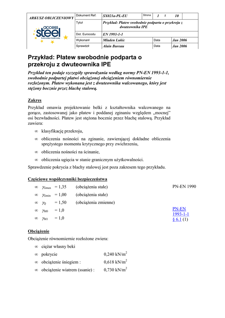 ARKUSZ OBLICZENIOWY Strona Dokument Ref: SX021a-PL-EU Tytuł Przykład: Płatew swobodnie podparta o przekroju z dwuteownika IPE Dot. Eurocodu EN 1993-1-1 Wykonanł Mladen Lukic Data Jan 2006 Sprawdził Alain Bureau Data Jan 2006 1 z 10 Przykład: Płatew swobodnie podparta o przekroju z dwuteownika IPE Przykład ten podaje szczegóły sprawdzania według normy PN-EN 1993-1-1, swobodnie podpartej płatwi obciąŜonej obciąŜeniem równomiernie rozłoŜonym. Płatew wykonana jest z dwuteownika walcowanego, który jest stęŜony bocznie przez blachę stalową. Zakres Przykład omawia projektowanie belki z kształtownika walcowanego na gorąco, zastosowanej jako płatew i poddanej zginaniu względem „mocnej” osi bezwładności. Płatew jest stęŜona bocznie przez blachę stalową. Przykład zawiera: • klasyfikację przekroju, • obliczenia nośności na zginanie, zawierającej dokładne obliczenia spręŜystego momentu krytycznego przy zwichrzeniu, • obliczenia nośności na ścinanie, • obliczenia ugięcia w stanie granicznym uŜytkowalności. Sprawdzenie pokrycia z blachy stalowej jest poza zakresem tego przykładu. Częściowe współczynniki bezpieczeństwa • γGmax = 1,35 (obciąŜenia stałe) • γGmin = 1,00 (obciąŜenia stałe) • γQ = 1,50 (obciąŜenia zmienne) • γM0 = 1,0 • γM1 = 1,0 PN-EN 1990 PN-EN 1993-1-1 § 6.1 (1) ObciąŜenie ObciąŜenie równomiernie rozłoŜone zwiera: • cięŜar własny beki • pokrycie 0,240 kN/m2 • obciąŜenie śniegiem : 0,618 kN/m2 • obciąŜenie wiatrem (ssanie) : 0,730 kN/m2 ARKUSZ OBLICZENIOWY Strona Dokument Ref: SX021a-PL-EU z Tytuł Przykład: Płatew swobodnie podparta o przekroju z dwuteownika IPE Dot. Eurocodu EN 1993-1-1 Wykonanł Mladen Lukic Data Jan 2006 Sprawdził Alain Bureau Data Jan 2006 2 10 Podstawowe dane geometryczne Płatew • rozpiętość: L = 7,20 m • rozstaw: s = 3,00 m Przyjęto IPE 180 – stal klasy S275 wysokość h = 180 mm szerokość b = 91 mm grubość środnika tw = 5,3 mm grubość półki tf = 8 mm promień wyokrąglenia r = 9 mm masa 18,8 kg/m Euronorma z tf 19-57 tw y y h z b pole przekroju A = 23,9 cm2 moment bezwładności względem osi y Iy = 1317 cm4 moment bezwładności względem osi z Iz = 100,9 cm4 moment bezwładności przy skręcaniu It = 4,79 cm4 wycinkowy moment bezwładności Iw = 7430 cm6 spręŜysty wskaźnik wytrzymałości względem osi y Wel,y = 146,3 cm3 plastyczny wskaźnik wytrzymałości względem osi y Wpl.y = 166,4 cm3 Pokrycie – gatunek stali S350 25 100 50 25 40 1000 Grubość blachy pokrycia t = 0,7 mm ARKUSZ OBLICZENIOWY Strona Dokument Ref: SX021a-PL-EU Tytuł Przykład: Płatew swobodnie podparta o przekroju z dwuteownika IPE Dot. Eurocodu EN 1993-1-1 Wykonanł Mladen Lukic Data Jan 2006 Sprawdził Alain Bureau Data Jan 2006 3 Według PN-EN 1993-1-3 moŜna obliczyć sztywność na ścinanie blachy trapezowej połączonej do płatwi w kaŜdej fałdzie i połączonej na kaŜdej stronie blachy. Obliczenia prowadzi się według wzoru: ( S = 1000 t 3 50 + 103 broof z 10 PN-EN 1993-1-3 § 10.1.1(10) ) hs w Składniki wyraŜenia oblicza się następująco: t 3 = 0,7 3 = 0,586 mm3 2 50 + 103 broof = 50 + 10 × 3 7200 = 243 mm 2 3 s 3000 = = 75 hw 40 Sztywność na ścinanie : S = 1000 × 0,586 × 243 × 75 ×10-3 = 10680 kNm / m Zdolność pokrycia do stęŜenia płatwi Ciągłe stęŜenie boczne JeŜeli spełnione jest następujące wraŜenie, płatew moŜe być uwaŜana za będącą bocznie stęŜoną w płaszczyźnie pokrycia: S ≥ S min PN-EN 1993-1-3 § 10.1.1 (6) π 2 EI w π 2 EI z (h 2)2 70 = + GI + t 2 × h2 L2 L Gdzie: π 2 E Iw L2 = π 2 × 210000 × 7430 × 106 7200 2 × 10-9 = 0,2971 kNm 2 GI t = 80770 × 4,79 × 10 4 × 10-9 = 3,869 kNm 2 π 2 E I z (h 2)2 2 L = π 2 × 210000 × 100,9 × 10 4 × 902 7200 2 × 10 -9 = 0,3268 kNm 2 Wtedy minimalna sztywność wynosi: S min = (0,2971 + 3,869 + 0,3265) × PN-EN 1993-1-1 §BB.2.1 70 = 9706 kNm/m 0,182 ARKUSZ OBLICZENIOWY Strona Dokument Ref: SX021a-PL-EU Tytuł Przykład: Płatew swobodnie podparta o przekroju z dwuteownika IPE Dot. Eurocodu EN 1993-1-1 Wykonanł Mladen Lukic Data Jan 2006 Sprawdził Alain Bureau Data Jan 2006 4 z 10 Stąd: S = 10680 kNm/m > Smin = 9706 kNm/m Sposób połączenia i blacha fałdowa moŜe być uwaŜana za wystarczająco sztywną by stęŜyć bocznie płatew. NaleŜy zauwaŜyć, Ŝe wymagania co do nośności i stateczności blachy pokrycia są dane w PN-EN 1993-1-3. Sprawdzenie tych warunkach nie jest objęte zakresem tego przykładu. ObciąŜenia • Płatwie: • Pokrycie dachowe: G2 = 0,240 × 3,00 = 0,720 kN/m • ObciąŜenie stałe: G = G1 + G2 = 0,904 kN/m • Śnieg: QS = 0,618 × 3,00 = 1,854 kN/m • Wiatr (ssanie): QW = 0,730 × 3,00 = 2,190 kN/m G1 = (18,8 × 9,81) × 10-3 = 0,184 kN/m Uwaga: Przyjęto , Ŝe pochylenie dachu jest tak małe, Ŝe nie jest tutaj potrzebny rozkład obciąŜenia pionowego na dwie składowe, równoległą i prostopadłą do płaszczyzny dachu. Kombinacja obciąŜeń w Stanie Granicznym Nośności: • DociąŜenie: γGmax G + γQ QS = 1,35 × 0,904 + 1,50 × 1,854 = 4,00 kN/m • Odrywanie: γGmin G + γQ QS = 1,00 × 0,904 – 1,50 × 2,190 = -2,38 kN/m Wykres momentów • Maksymalny moment zginający od dociąŜenia w środku rozpiętości: My,Ed = 0,125 × 4,00 × 7,202 = 25,92 kNm M My,Ed • Maksymalny moment zginający przy odrywaniu w środku rozpiętości: My,Ed = 0,125 × (–2,38) × 7,202 = –15,42 kNm My,Ed M PN-EN 1990 § 6.4.3.2 ARKUSZ OBLICZENIOWY Strona Dokument Ref: SX021a-PL-EU Tytuł Przykład: Płatew swobodnie podparta o przekroju z dwuteownika IPE Dot. Eurocodu EN 1993-1-1 Wykonanł Mladen Lukic Data Jan 2006 Sprawdził Alain Bureau Data Jan 2006 5 z 10 Wykres sił ścinających • Maksymalna siła ścinająca przy podporach dla dociąŜania: Vz,Ed = 0,5 × 4,00 × 7,20 = 14,4 kN • Maksymalna siła ścinająca przy podporach dla odciąŜenia: Vz,Ed = 0,5 × 2,38 × 7,20 = 8,57 kN Kombinacja ob