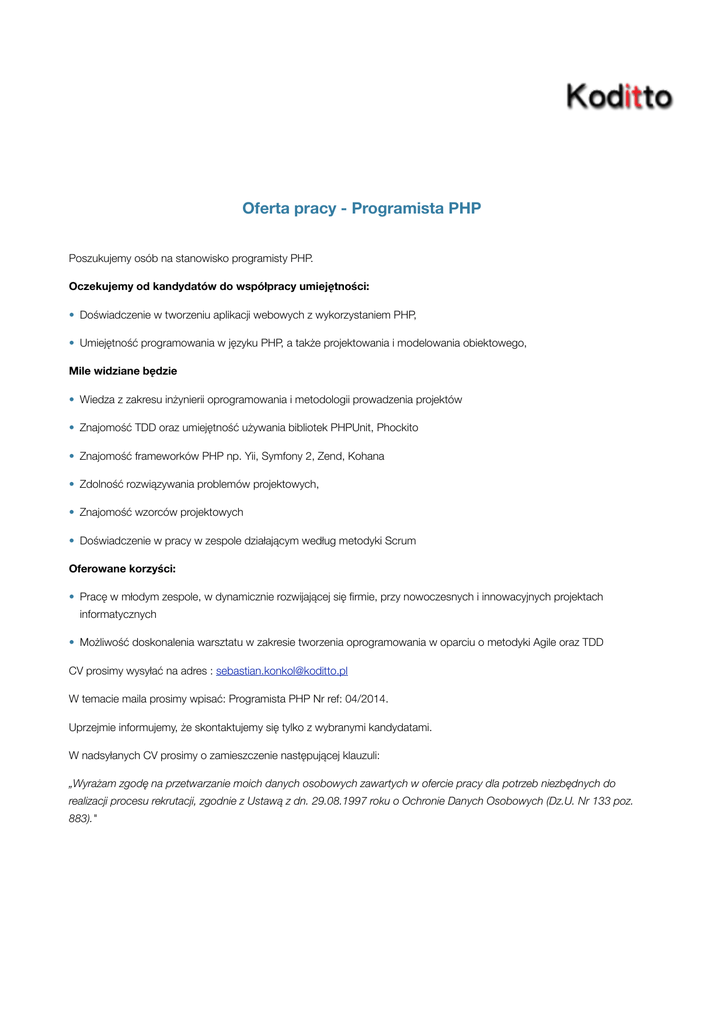 Oferta pracy - Programista PHP ! Poszukujemy osób na stanowisko programisty PHP. Oczekujemy od kandydatów do współpracy umiejętności: • Doświadczenie w tworzeniu aplikacji webowych z wykorzystaniem PHP, • Umiejętność programowania w języku PHP, a także projektowania i modelowania obiektowego, Mile widziane będzie • Wiedza z zakresu inżynierii oprogramowania i metodologii prowadzenia projektów • Znajomość TDD oraz umiejętność używania bibliotek PHPUnit, Phockito • Znajomość frameworków PHP np. Yii, Symfony 2, Zend, Kohana • Zdolność rozwiązywania problemów projektowych, • Znajomość wzorców projektowych • Doświadczenie w pracy w zespole działającym według metodyki Scrum Oferowane korzyści: • Pracę w młodym zespole, w dynamicznie rozwijającej się firmie, przy nowoczesnych i innowacyjnych projektach informatycznych • Możliwość doskonalenia warsztatu w zakresie tworzenia oprogramowania w oparciu o metodyki Agile oraz TDD CV prosimy wysyłać na adres : [email protected] W temacie maila prosimy wpisać: Programista PHP Nr ref: 04/2014. Uprzejmie informujemy, że skontaktujemy się tylko z wybranymi kandydatami. W nadsyłanych CV prosimy o zamieszczenie następującej klauzuli: „Wyrażam zgodę na przetwarzanie moich danych osobowych zawartych w ofercie pracy dla potrzeb niezbędnych do realizacji procesu rekrutacji, zgodnie z Ustawą z dn. 29.08.1997 roku o Ochronie Danych Osobowych (Dz.U. Nr 133 poz. 883)."
