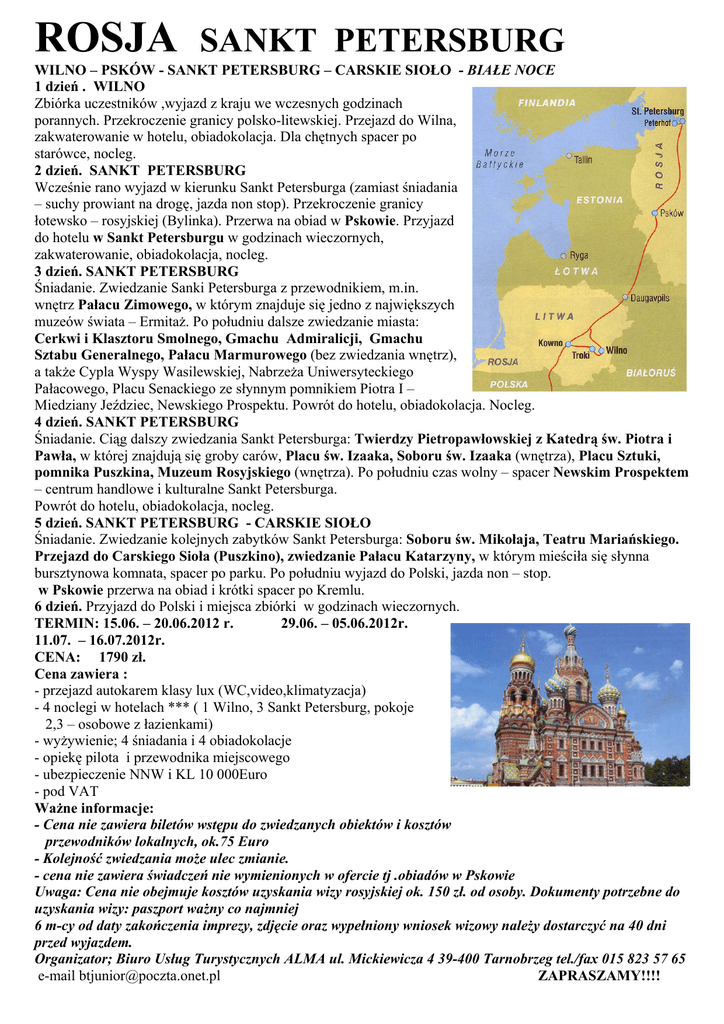ROSJA SANKT PETERSBURG WILNO – PSKÓW - SANKT PETERSBURG – CARSKIE SIOàO - BIAàE NOCE 1 dzieĔ . WILNO Zbiórka uczestników ,wyjazd z kraju we wczesnych godzinach porannych. Przekroczenie granicy polsko-litewskiej. Przejazd do Wilna, zakwaterowanie w hotelu, obiadokolacja. Dla chĊtnych spacer po starówce, nocleg. 2 dzieĔ. SANKT PETERSBURG WczeĞnie rano wyjazd w kierunku Sankt Petersburga (zamiast Ğniadania – suchy prowiant na drogĊ, jazda non stop). Przekroczenie granicy áotewsko – rosyjskiej (Bylinka). Przerwa na obiad w Pskowie. Przyjazd do hotelu w Sankt Petersburgu w godzinach wieczornych, zakwaterowanie, obiadokolacja, nocleg. 3 dzieĔ. SANKT PETERSBURG ĝniadanie. Zwiedzanie Sanki Petersburga z przewodnikiem, m.in. wnĊtrz Paáacu Zimowego, w którym znajduje siĊ jedno z najwiĊkszych muzeów Ğwiata – ErmitaĪ. Po poáudniu dalsze zwiedzanie miasta: Cerkwi i Klasztoru Smolnego, Gmachu Admiralicji, Gmachu Sztabu Generalnego, Paáacu Marmurowego (bez zwiedzania wnĊtrz), a takĪe Cypla Wyspy Wasilewskiej, NabrzeĪa Uniwersyteckiego Paáacowego, Placu Senackiego ze sáynnym pomnikiem Piotra I – Miedziany JeĨdziec, Newskiego Prospektu. Powrót do hotelu, obiadokolacja. Nocleg. 4 dzieĔ. SANKT PETERSBURG ĝniadanie. Ciąg dalszy zwiedzania Sankt Petersburga: Twierdzy Pietropawáowskiej z Katedrą Ğw. Piotra i Pawáa, w której znajdują siĊ groby carów, Placu Ğw. Izaaka, Soboru Ğw. Izaaka (wnĊtrza), Placu Sztuki, pomnika Puszkina, Muzeum Rosyjskiego (wnĊtrza). Po poáudniu czas wolny – spacer Newskim Prospektem – centrum handlowe i kulturalne Sankt Petersburga. Powrót do hotelu, obiadokolacja, nocleg. 5 dzieĔ. SANKT PETERSBURG - CARSKIE SIOàO ĝniadanie. Zwiedzanie kolejnych zabytków Sankt Petersburga: Soboru Ğw. Mikoáaja, Teatru MariaĔskiego. Przejazd do Carskiego Sioáa (Puszkino), zwiedzanie Paáacu Katarzyny, w którym mieĞciáa siĊ sáynna bursztynowa komnata, spacer po parku. Po poáudniu wyjazd do Polski, jazda non – stop. w Pskowie przerwa na obiad i krótki spacer po Kremlu. 6 dzieĔ. Przyjazd do Polski i miejsca zbiórki w godzinach wieczornych. TERMIN: 15.06. – 20.06.2012 r. 29.06. – 05.06.2012r. 11.07. – 16.07.2012r. CENA: 1790 zá. Cena zawiera : - przejazd autokarem klasy lux (WC,video,klimatyzacja) - 4 noclegi w hotelach *** ( 1 Wilno, 3 Sankt Petersburg, pokoje 2,3 – osobowe z áazienkami) - wyĪywienie; 4 Ğniadania i 4 obiadokolacje - opiekĊ pilota i przewodnika miejscowego - ubezpieczenie NNW i KL 10 000Euro - pod VAT WaĪne informacje: - Cena nie zawiera biletów wstĊpu do zwiedzanych obiektów i kosztów przewodników lokalnych, ok.75 Euro - KolejnoĞü zwiedzania moĪe ulec zmianie. - cena nie zawiera ĞwiadczeĔ nie wymienionych w ofercie tj .obiadów w Pskowie Uwaga: Cena nie obejmuje kosztów uzyskania wizy rosyjskiej ok. 150 zá. od osoby. Dokumenty potrzebne do uzyskania wizy: paszport waĪny co najmniej 6 m-cy od daty zakoĔczenia imprezy, zdjĊcie oraz wypeániony wniosek wizowy naleĪy dostarczyü na 40 dni przed wyjazdem. Organizator; Biuro Usáug Turystycznych ALMA ul. Mickiewicza 4 39-400 Tarnobrzeg tel./fax 015 823 57 65 e-mail [email protected] ZAPRASZAMY!!!!