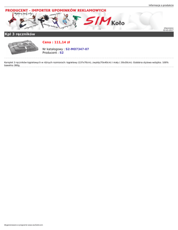 Informacje o produkcie Utworzono 02-03-2017 Kpl 3 ręczników Cena : 111,14 zł Nr katalogowy : S2-MO7347-07 Producent : S2 Komplet 3 ręczników kąpielowych w różnych rozmiarach: kąpielowy (137x70cm), zwykły(70x40cm) i mały ( 30x30cm). Ozdobna stylowa wstążka. 100% bawełna 380g. Wygenerowano w programie www.oscGold.com